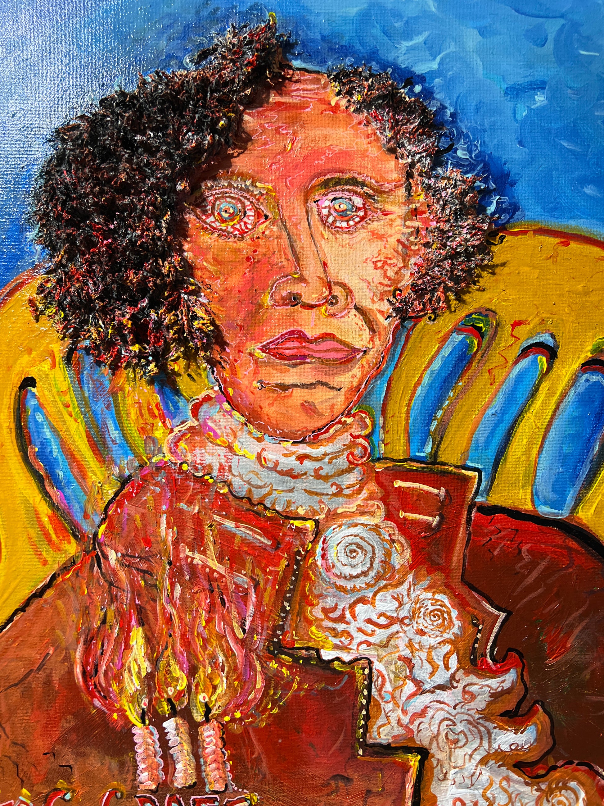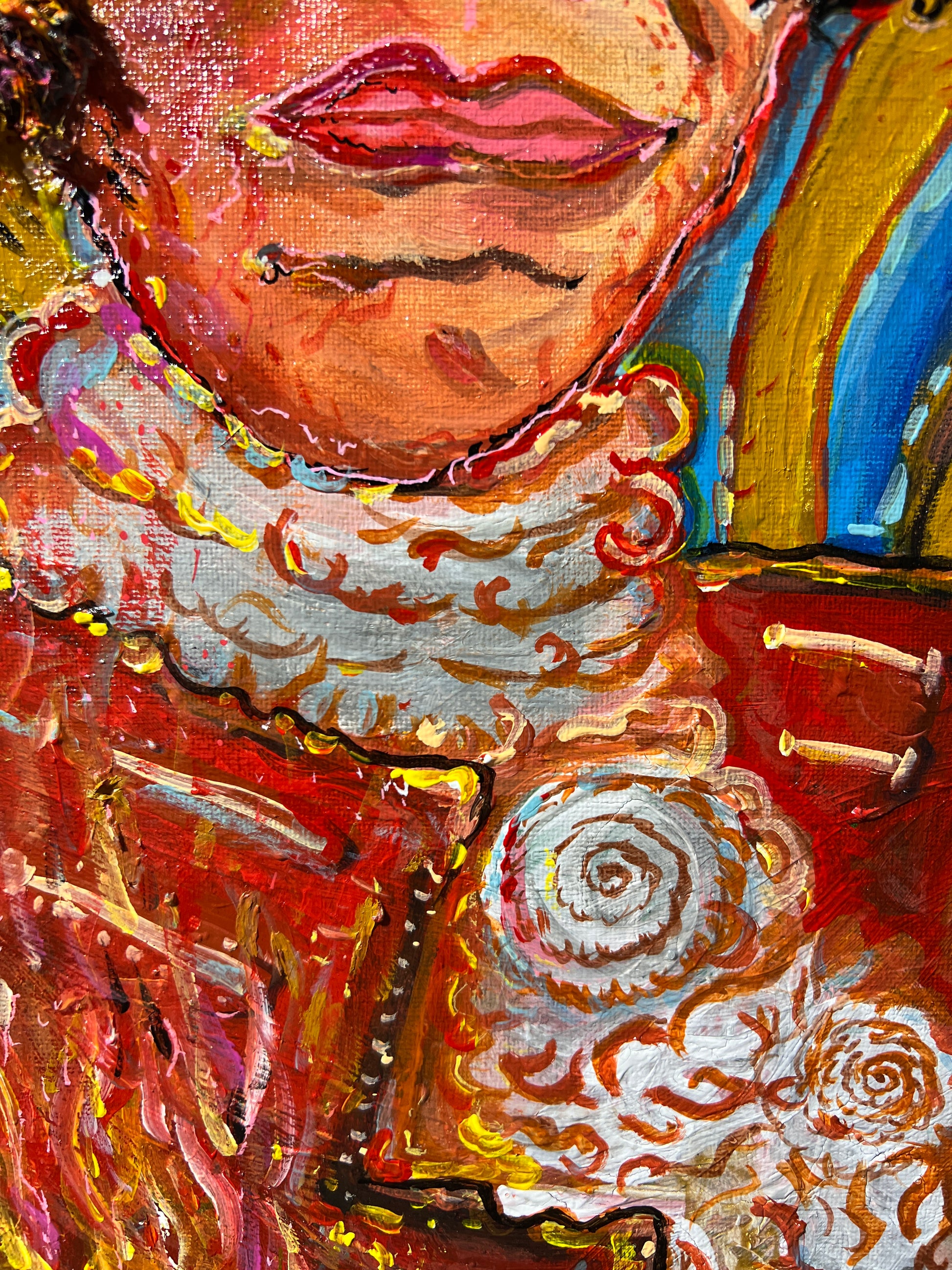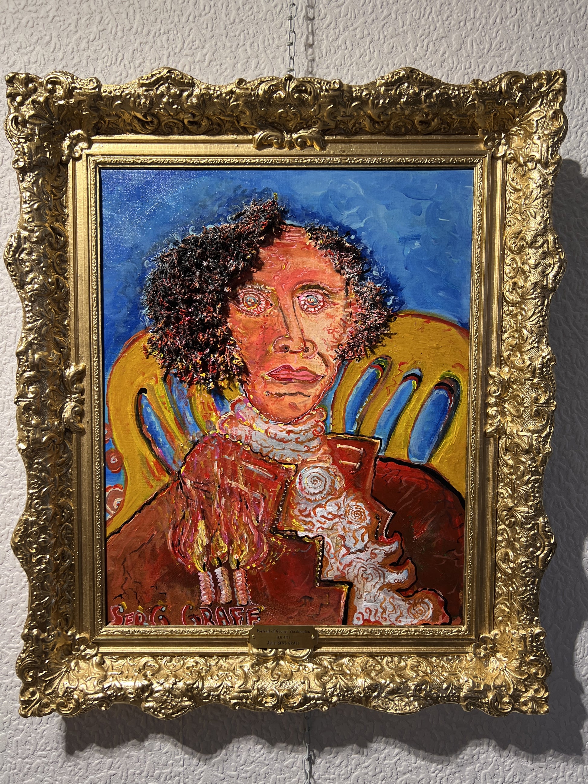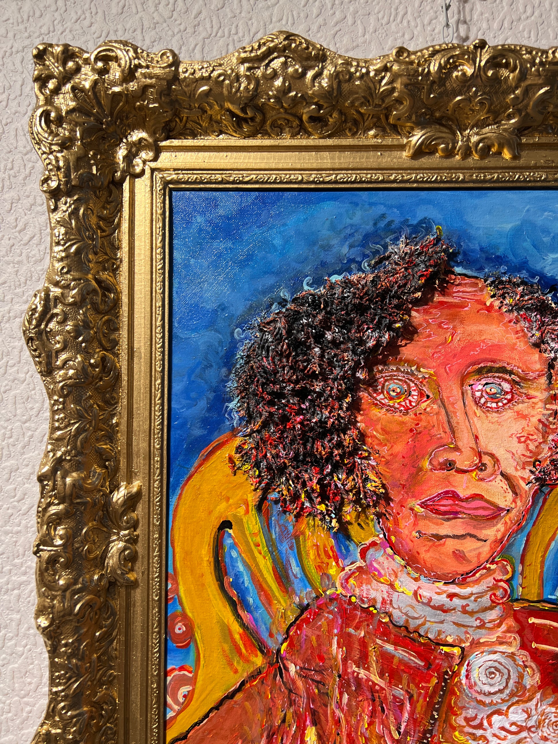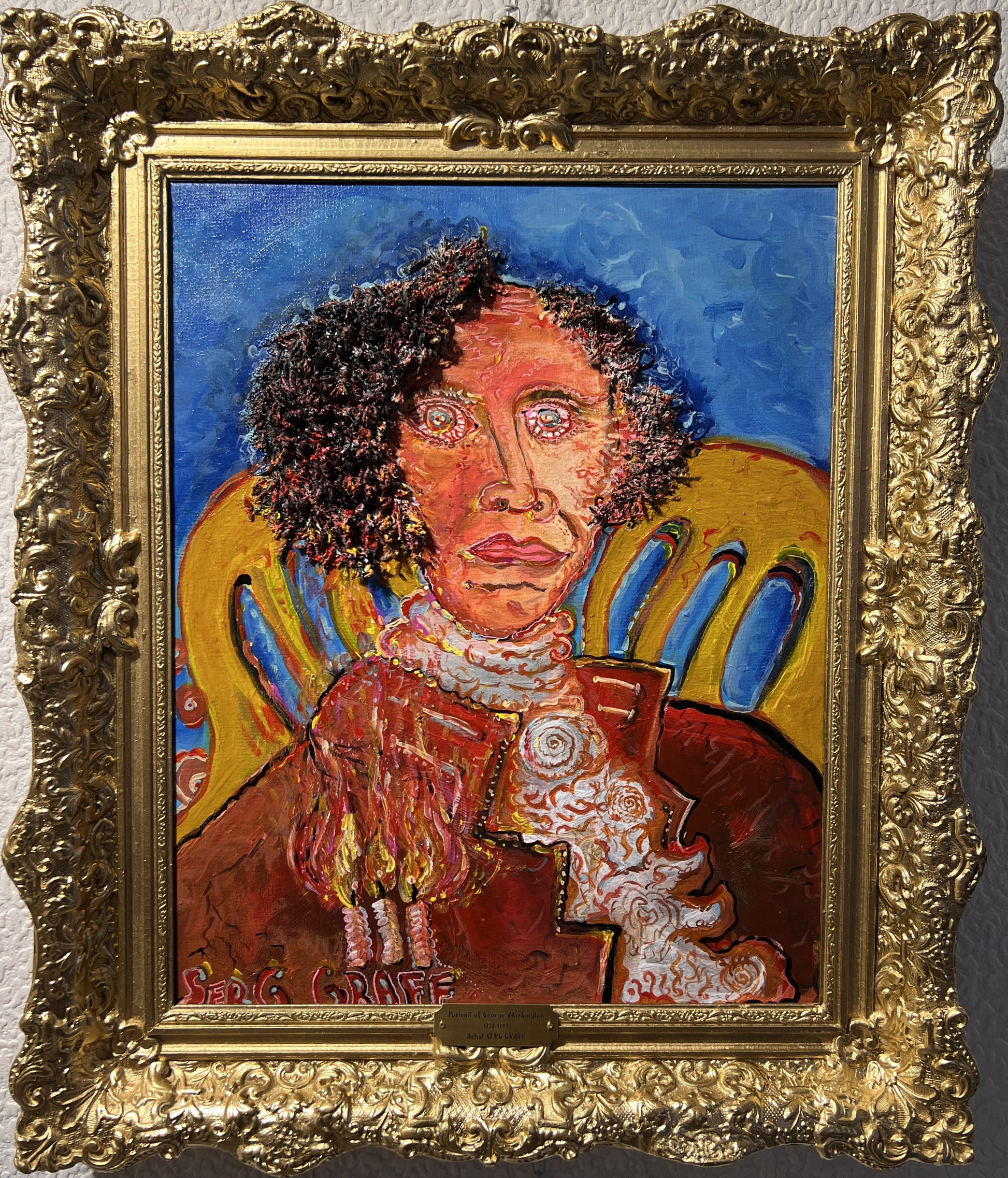 The painting is housed in an ornate gilt frame, whose rich finish complements the work’s daring color and style, giving this reimagined historical figure a sense of grandeur and modern flair. Graff’s work invites viewers to reflect on history through a fresh, imaginative, and vibrant perspective.