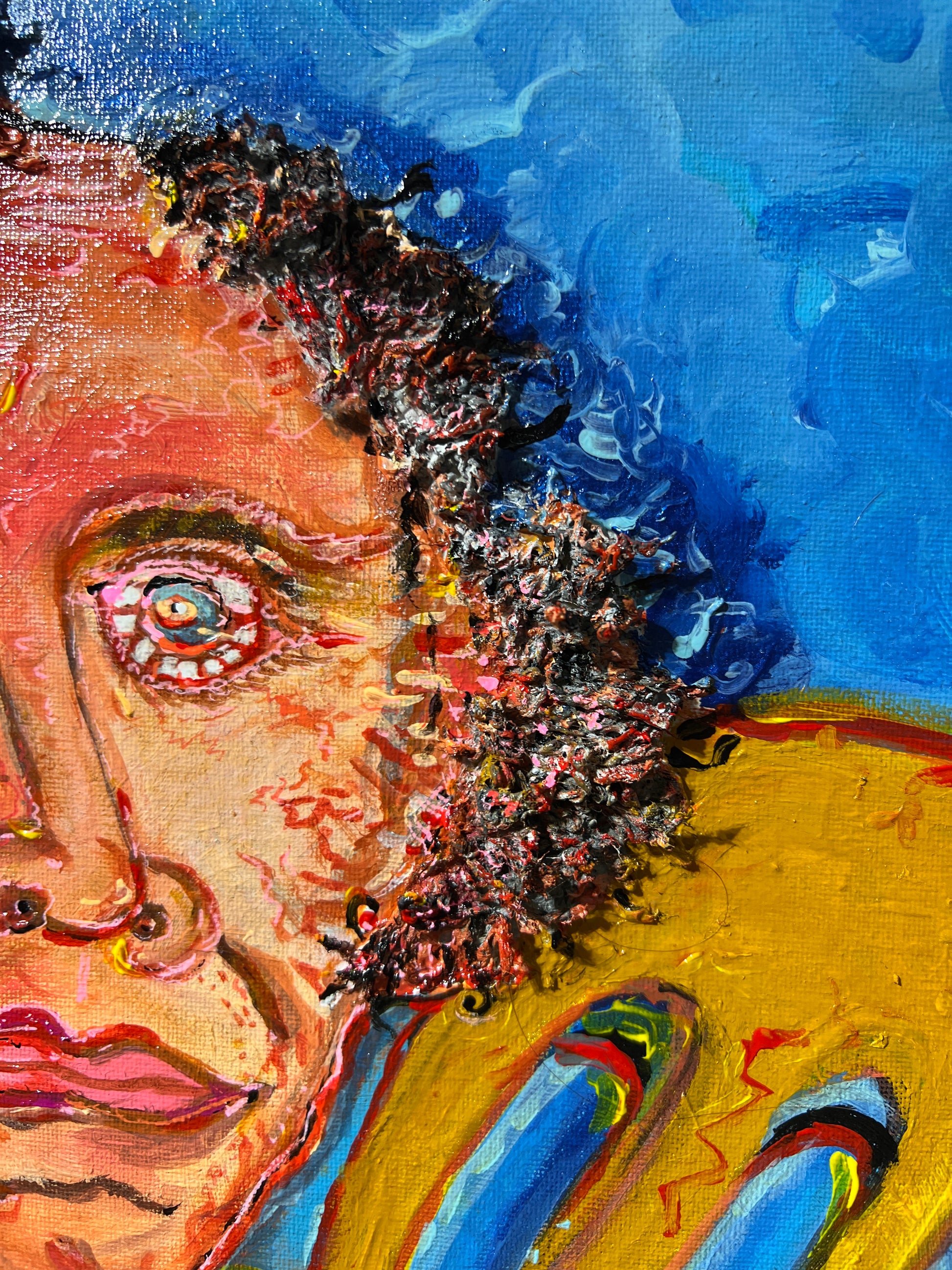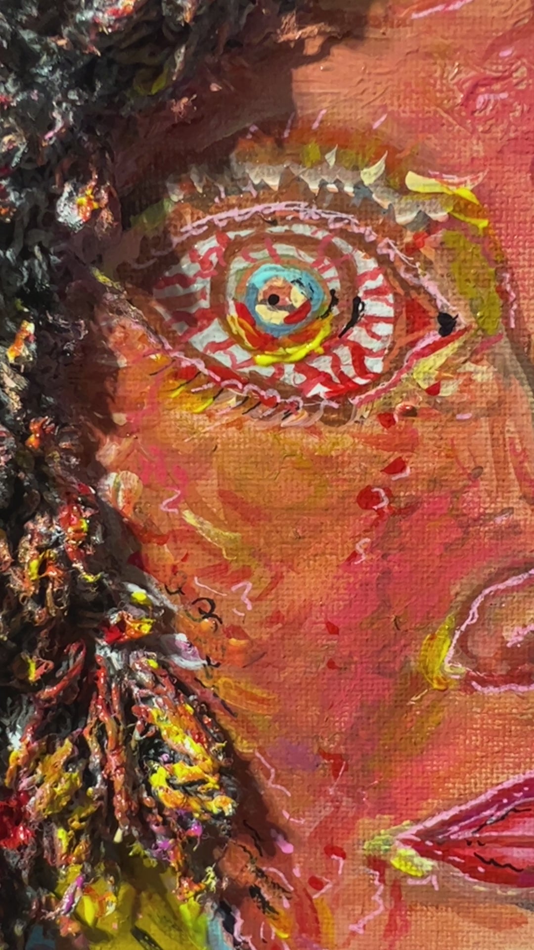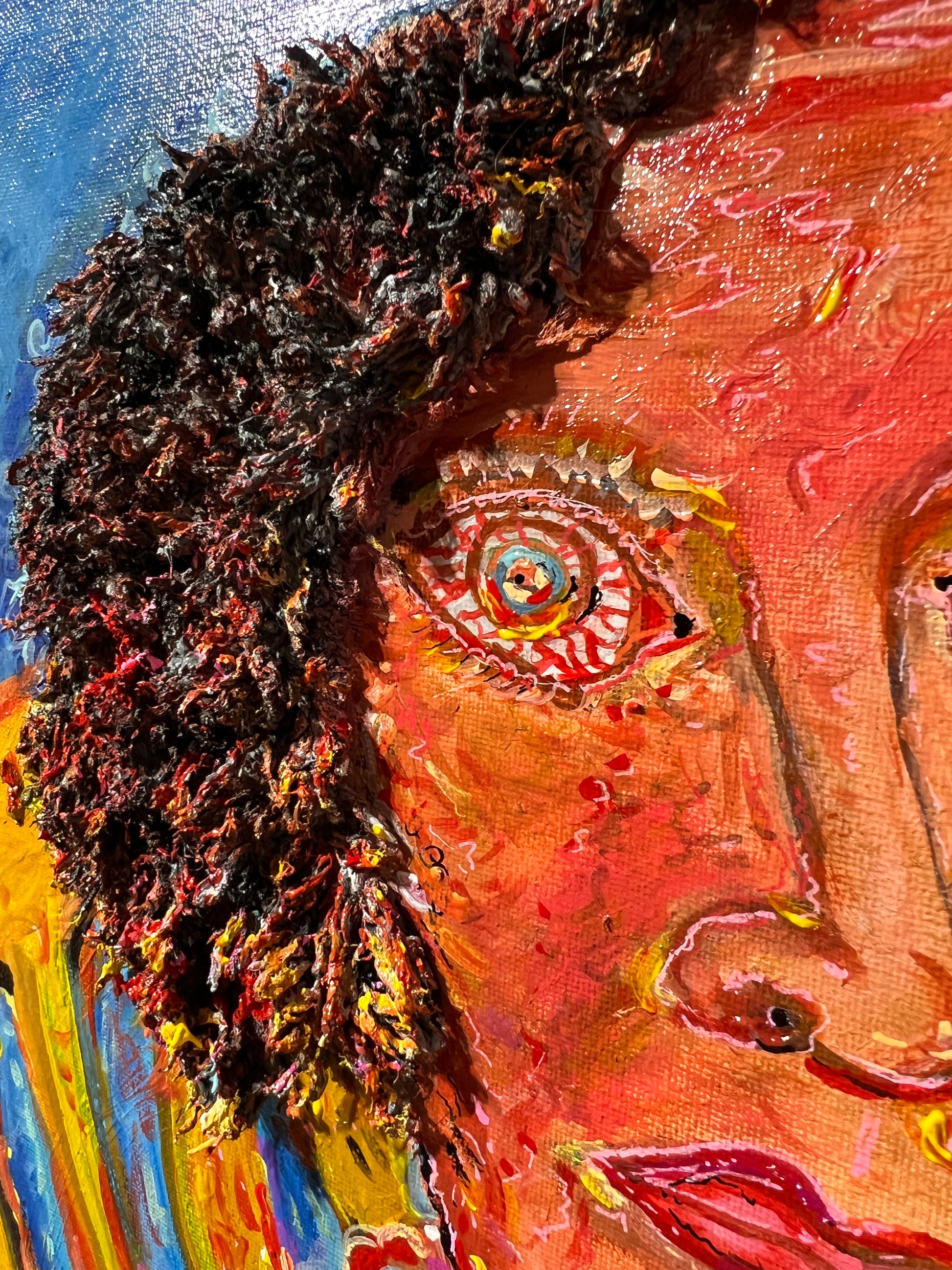 Serg Graff reimagines Washington with vibrant colors and expressive brushstrokes, transforming the iconic portrait into something modern, whimsical, and full of energy. The face, rendered in warm tones of orange, red, and pink, is enriched with swirling textures and sharp lines that lend it an almost sculptural depth. Large, intense eyes command attention, while the textured hair blends black with bright color highlights, playfully reinterpreting Washington’s traditional powdered wig.