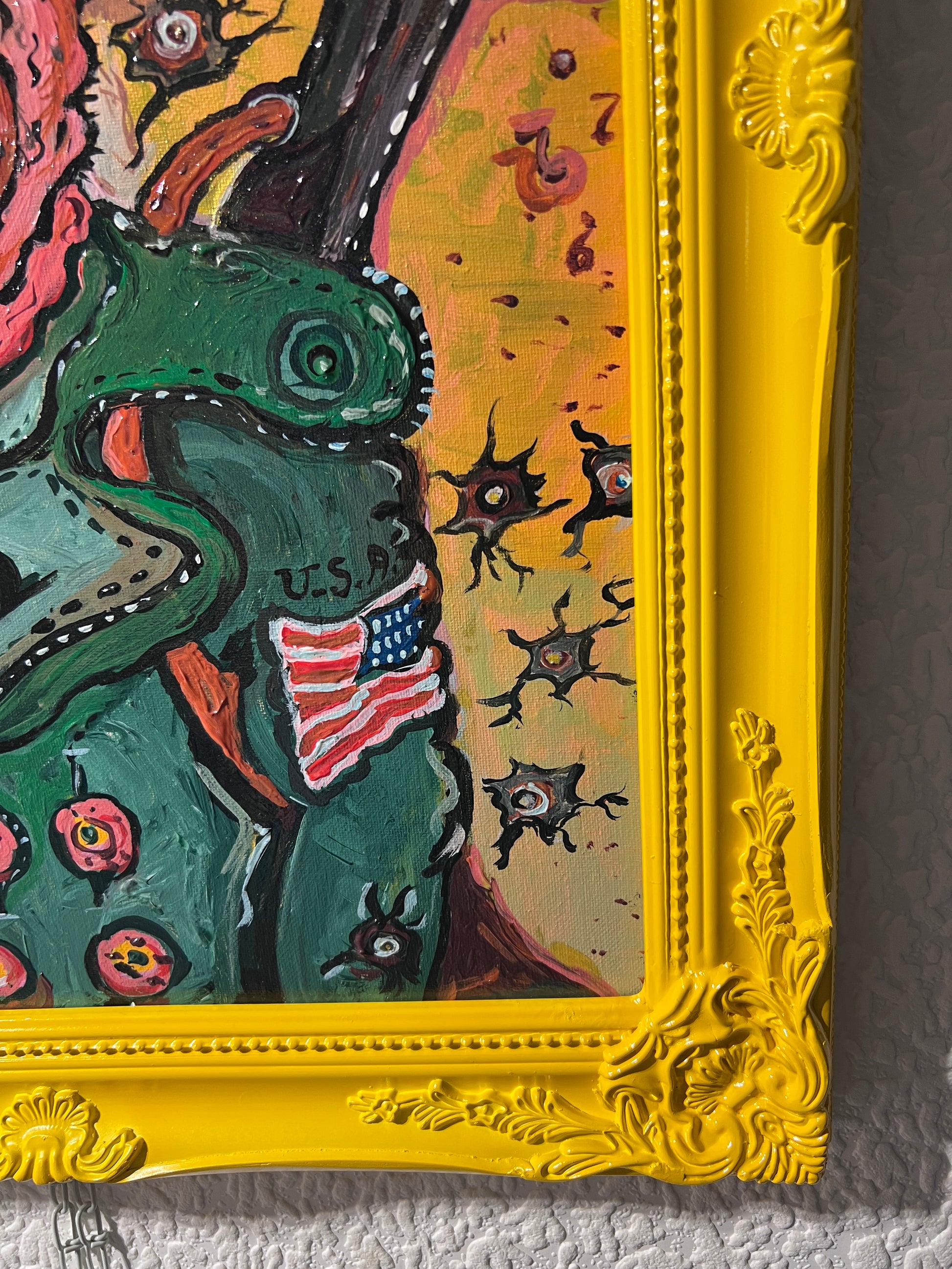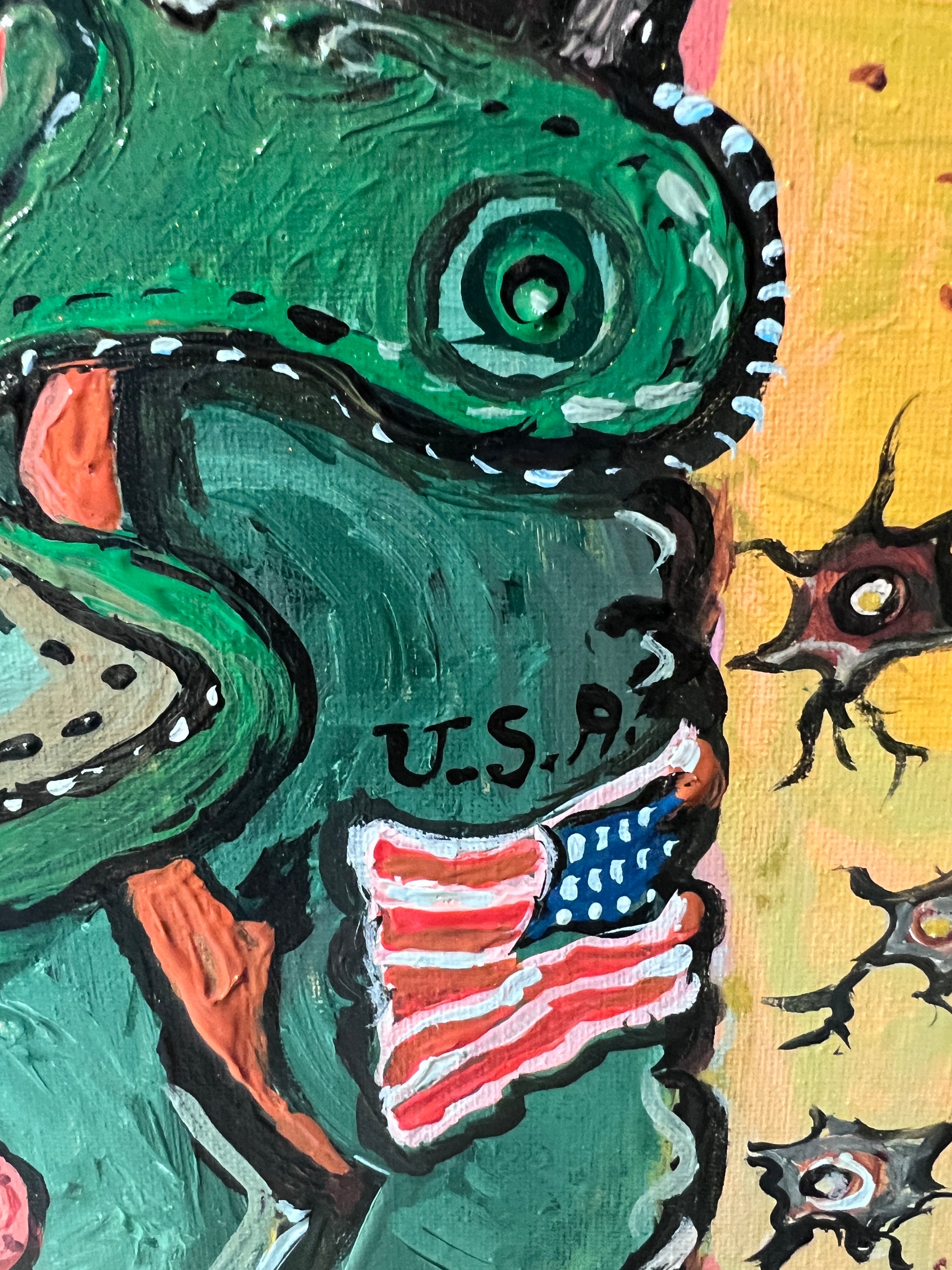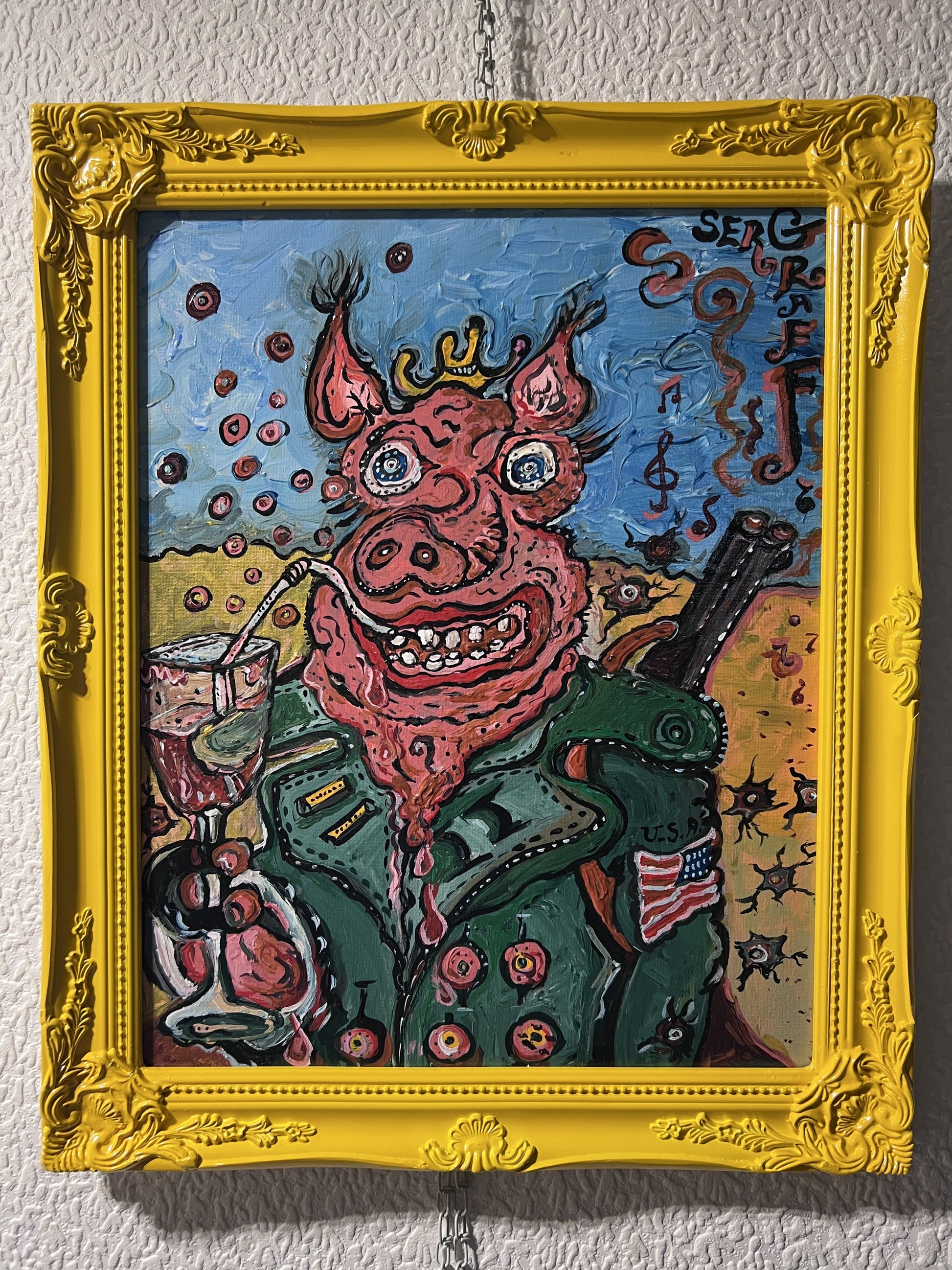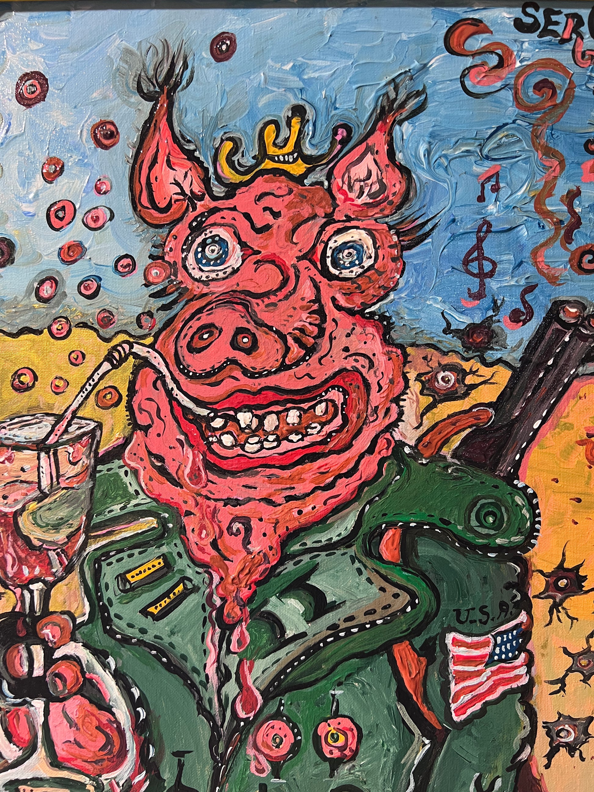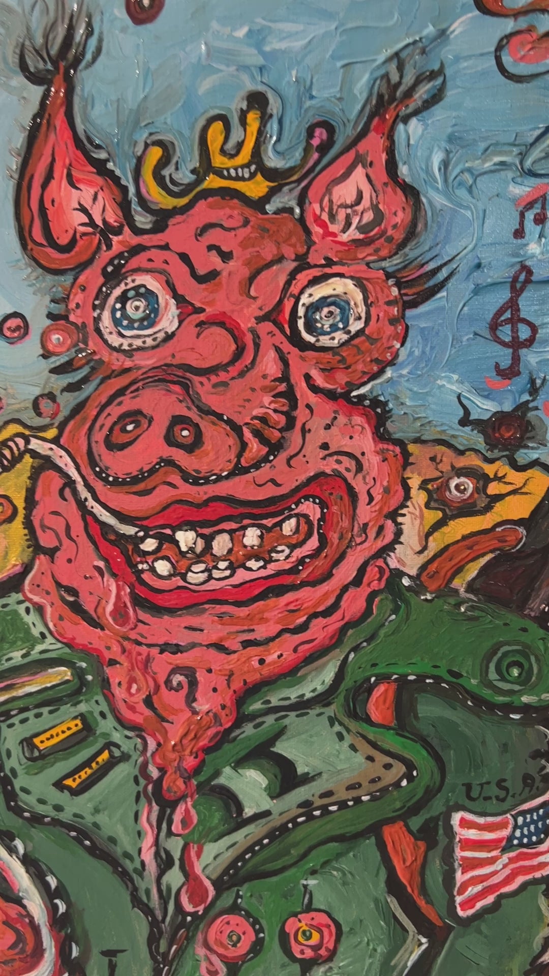 The painting is a striking and provocative satire, portraying a surreal image of a pig dressed in a decorated green military uniform. Medals and an American flag patch embellish the jacket, underscoring themes of militarism, patriotism, and authority. The pig’s face is exaggerated, with wide, crazed eyes and a maniacal grin, creating an intense and chaotic energy that draws the viewer in.