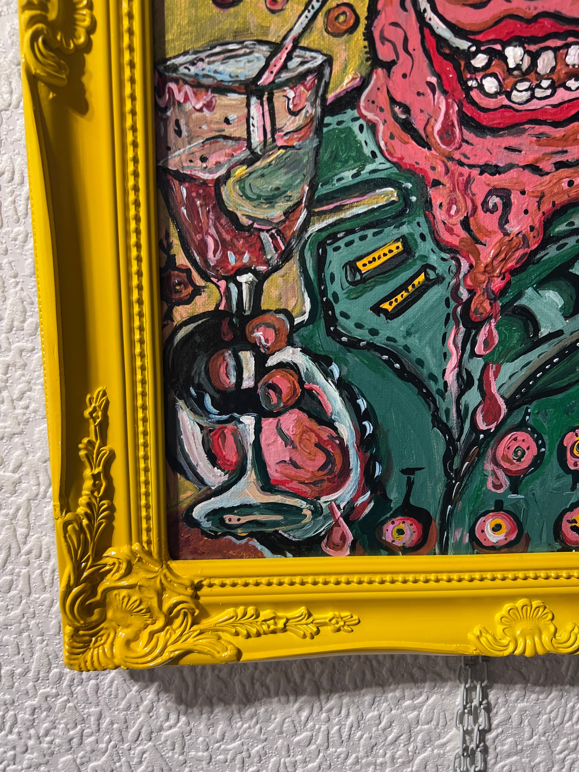 Adding to the biting humor, the pig wears a crown perched atop its head—an ironic nod to power and dominance—while holding a glass of wine with a straw in one hoof, further amplifying the absurdity and satirical tone. The expressive brushwork and vibrant colors create a dynamic, almost theatrical composition that blends whimsy with critique, making this piece both visually engaging and conceptually intriguing.