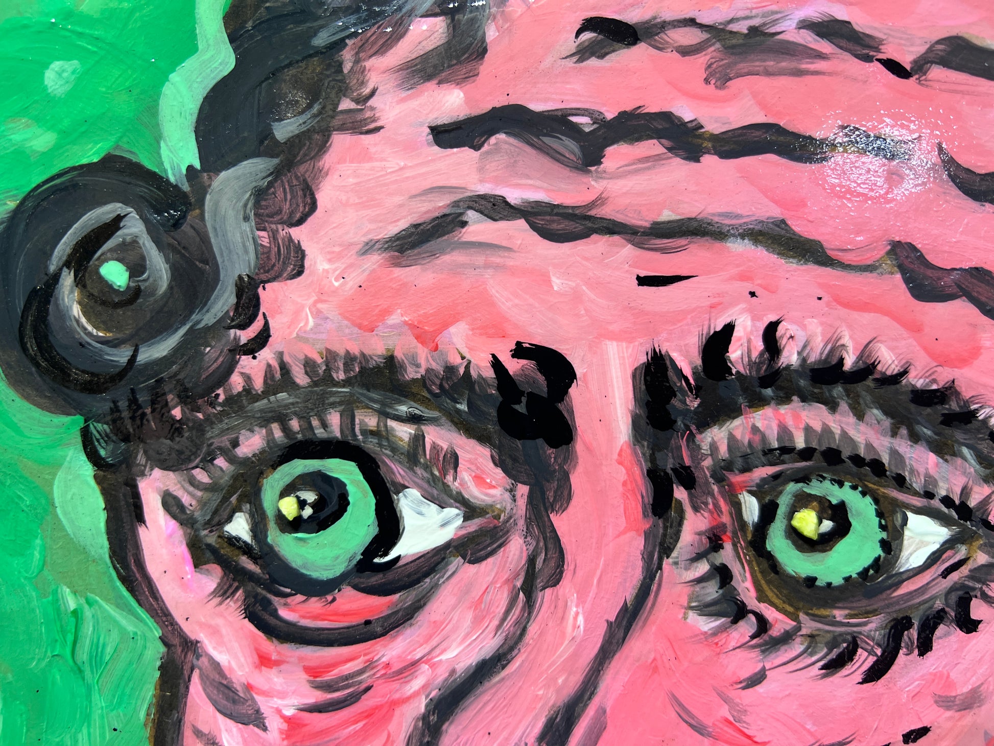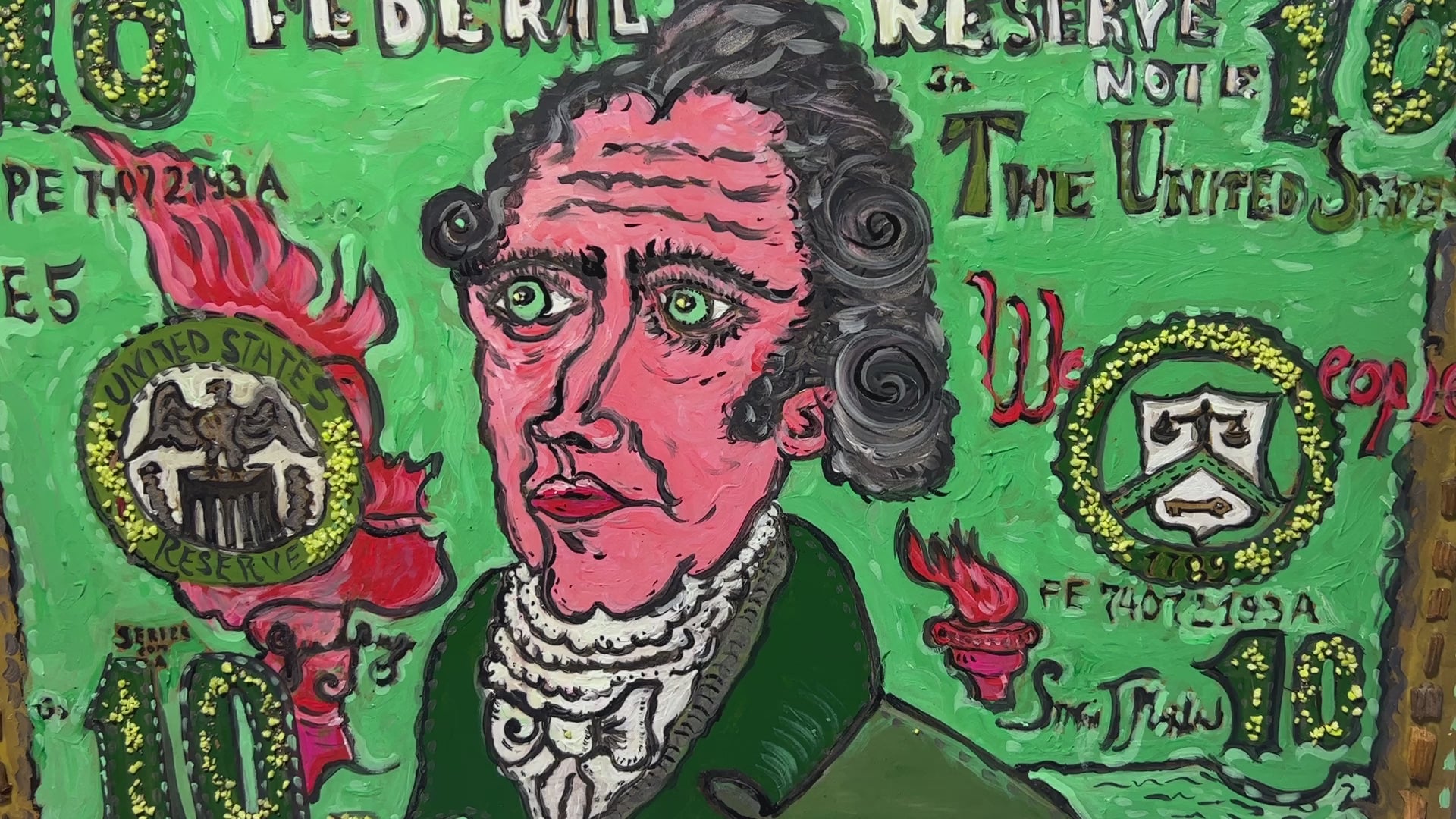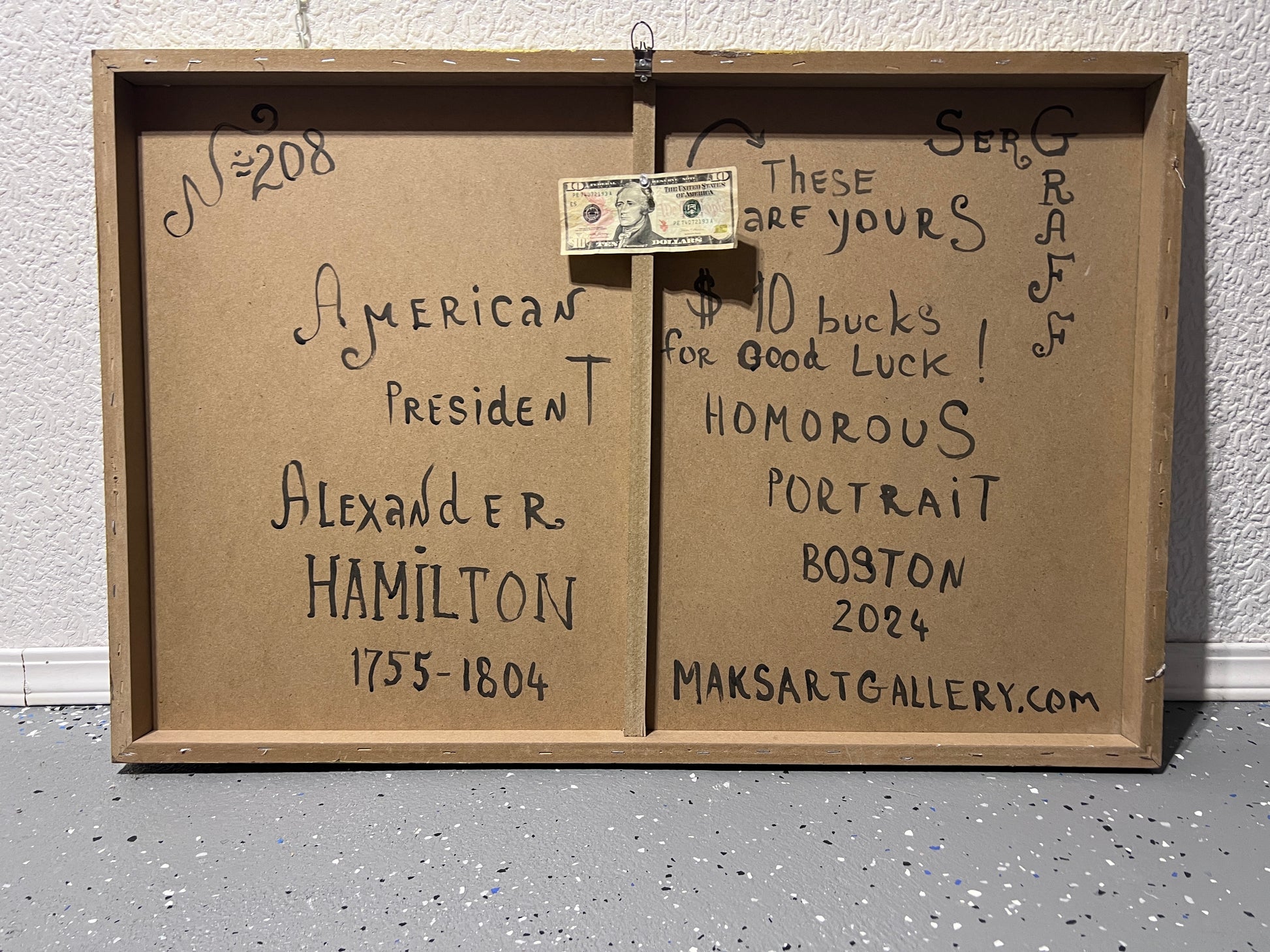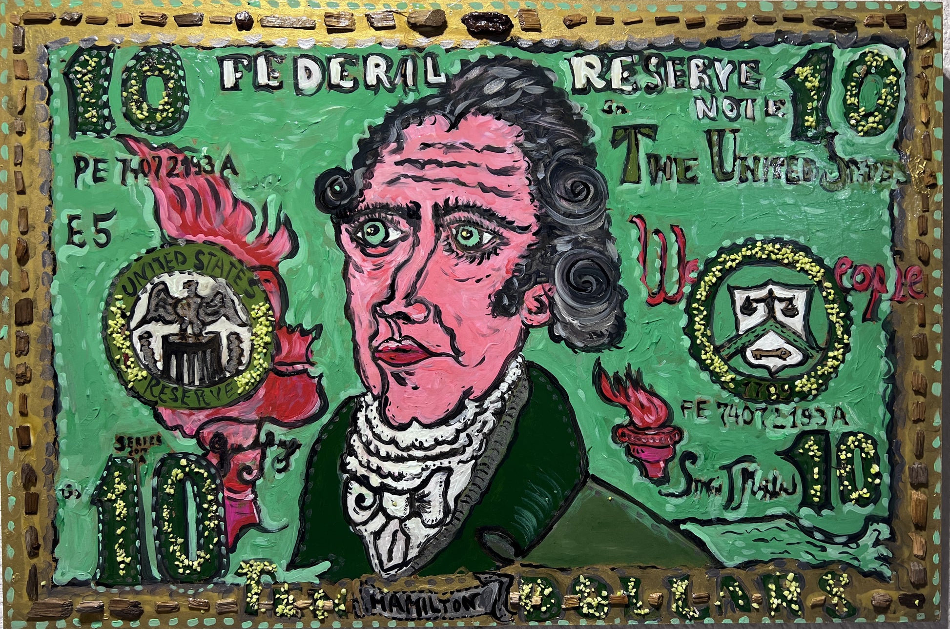 The painting is an expressive reinterpretation of the portrait of Alexander Hamilton featured on the U.S. ten‑dollar bill. Highly stylized, it blends elements of pop art and folk art, bringing new energy to a familiar historical figure. Hamilton’s face is rendered in a striking intense pink tone, with large, wide eyes that lend him a surreal, almost dreamlike expression. His dark hair forms swirling curls, and his attire—including collar and jacket—is painted in deep green tones, adding a strong visual contrast.