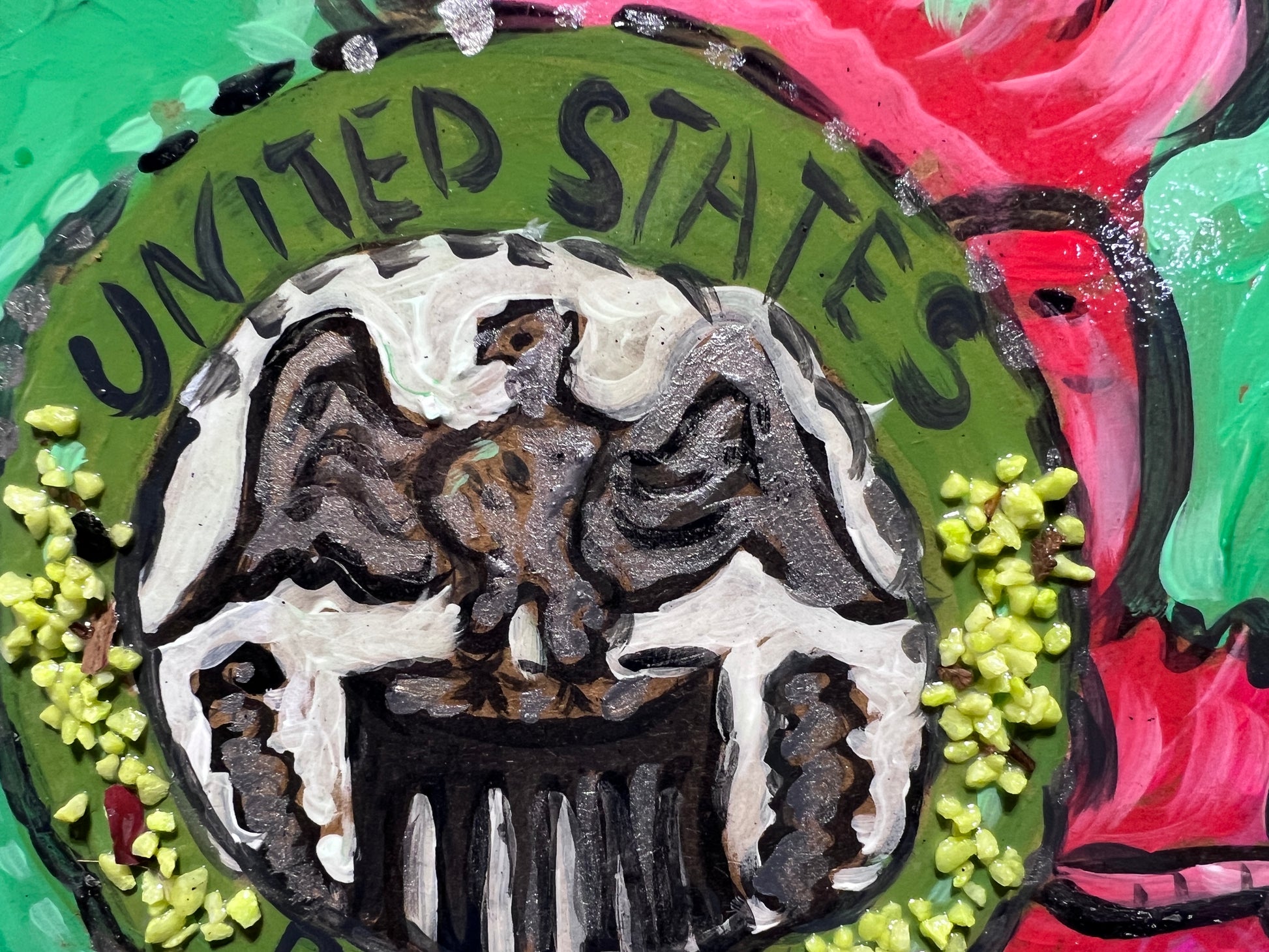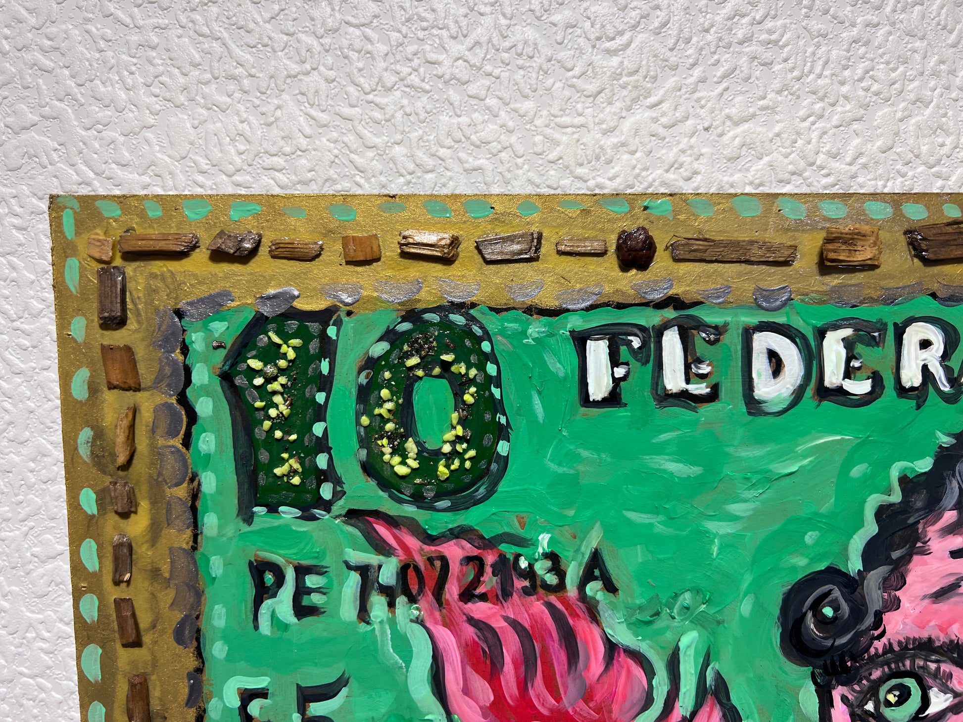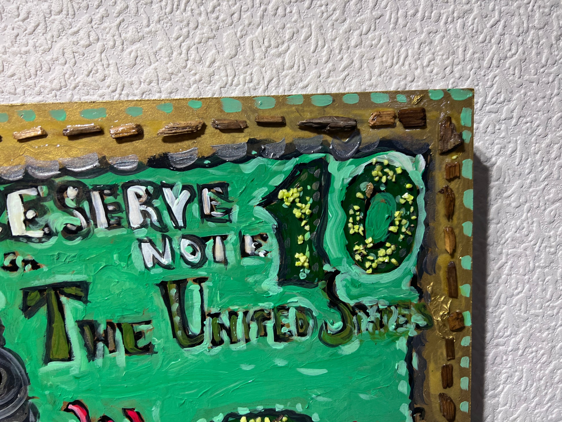 The surface is alive with a mix of textures and bright, contrasting colors, creating a lively and unconventional take on a symbol of American currency. Though unframed, the painting’s composition and vibrant palette make it a commanding and playful statement piece, rich with humor and creativity.