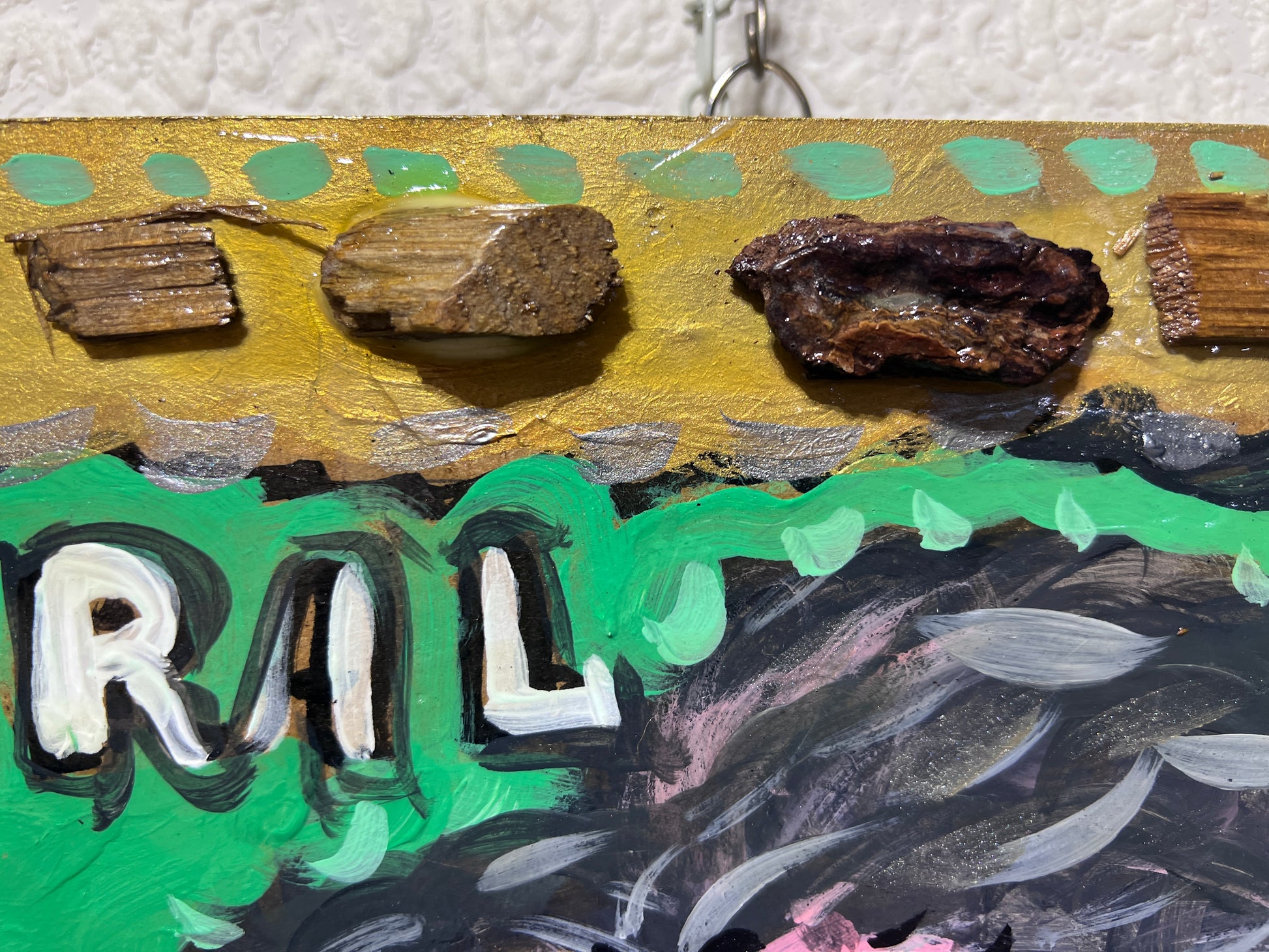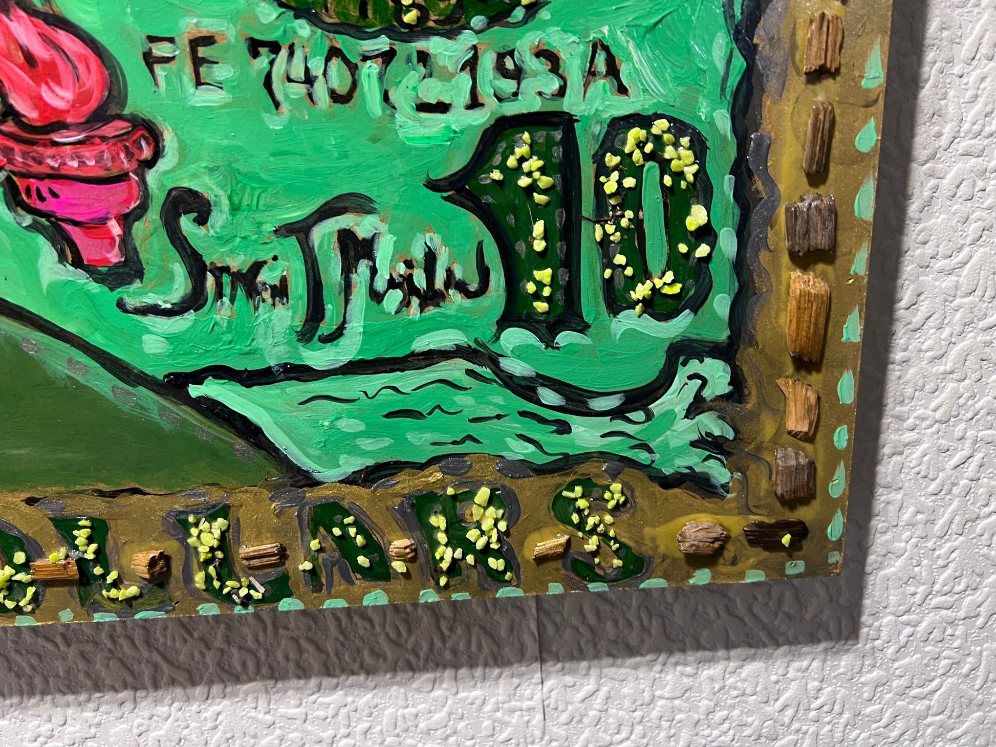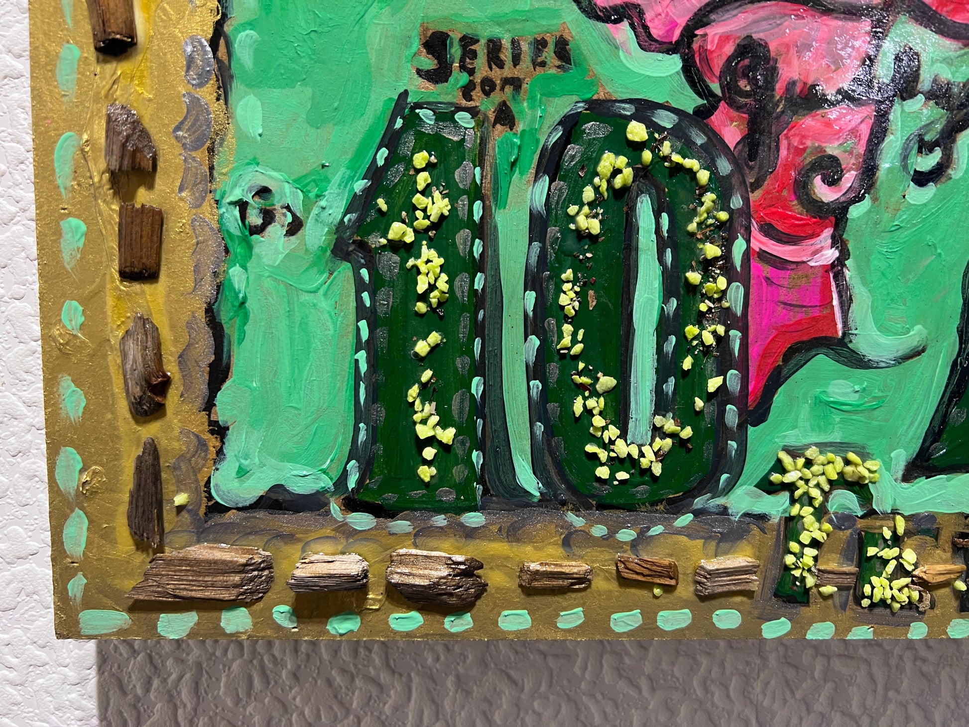 The surface is alive with a mix of textures and bright, contrasting colors, creating a lively and unconventional take on a symbol of American currency. Though unframed, the painting’s composition and vibrant palette make it a commanding and playful statement piece, rich with humor and creativity.