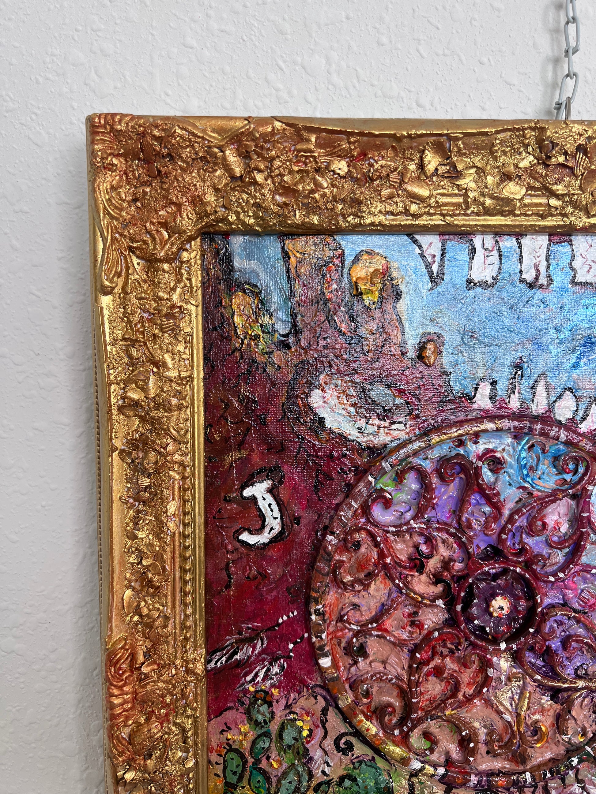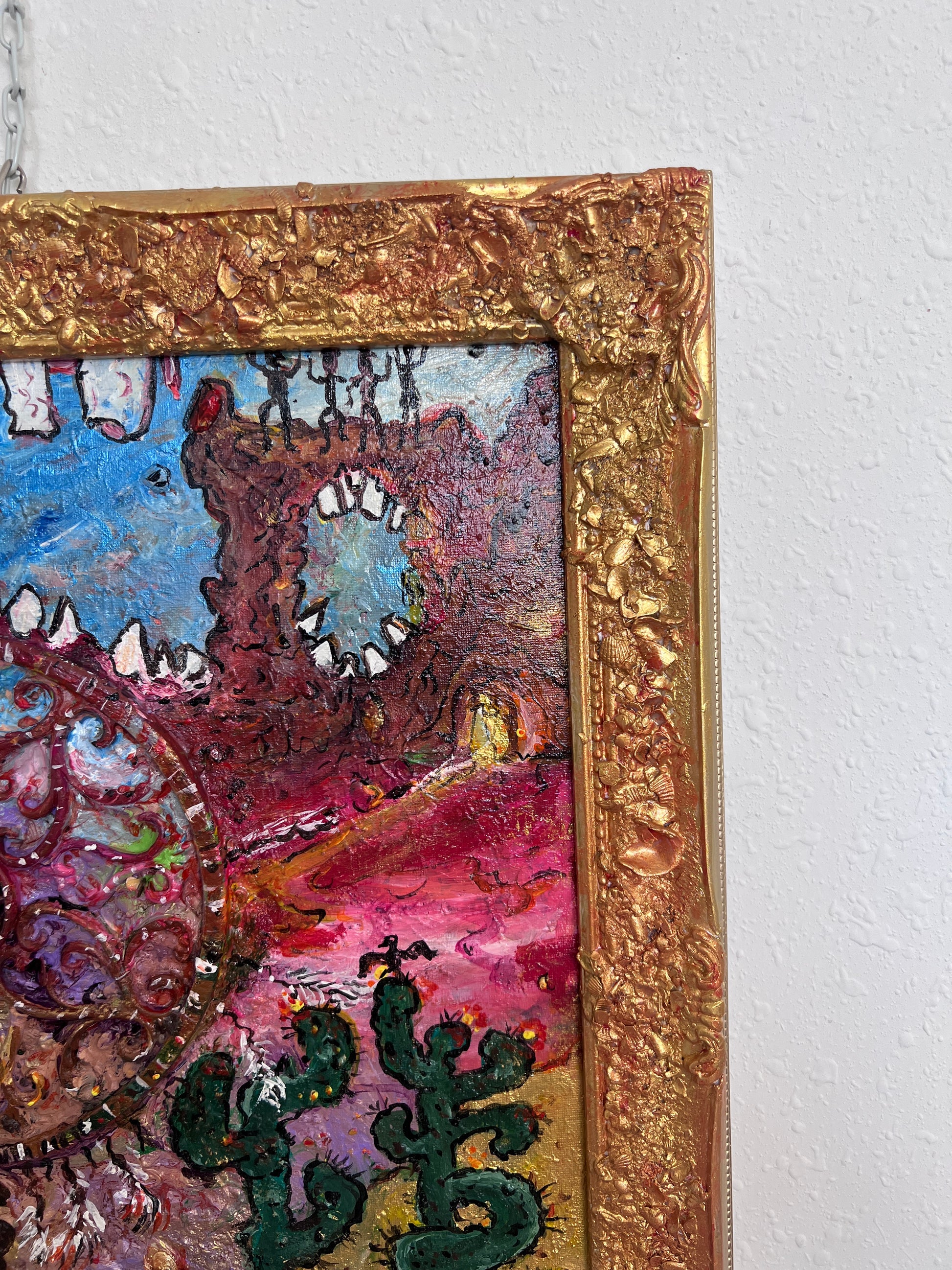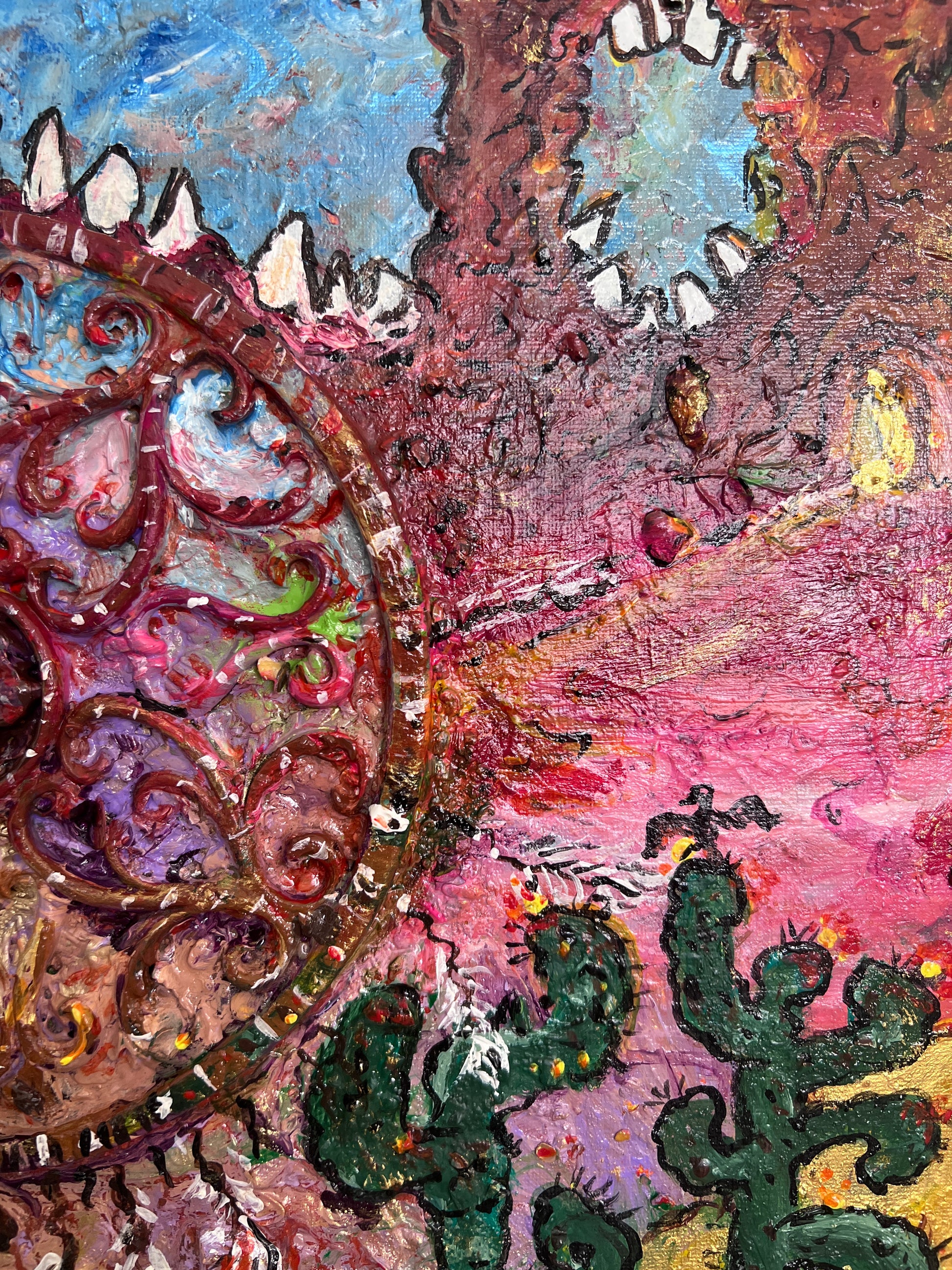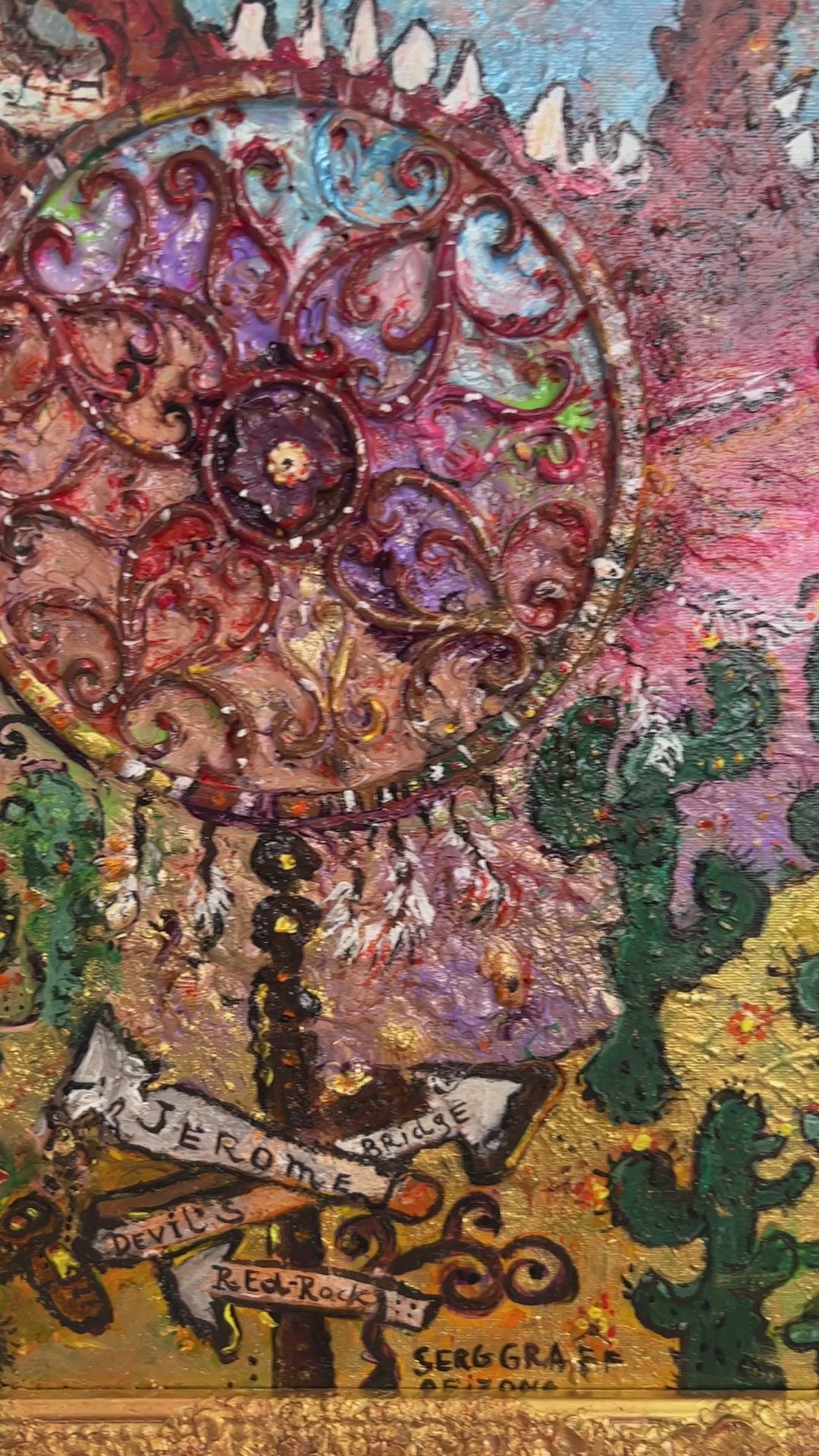 At the heart of the composition lies a large ornate circular motif—part dreamcatcher, part wrought‑iron window—drawing the viewer into a swirling world of color. Layers of fiery reds, deep purples, and shimmering golds evoke the heat and grandeur of Arizona’s canyonlands. Sculptural textures and glittering pigments create a surface alive with movement and light, while playful three‑dimensional elements invite closer inspection.