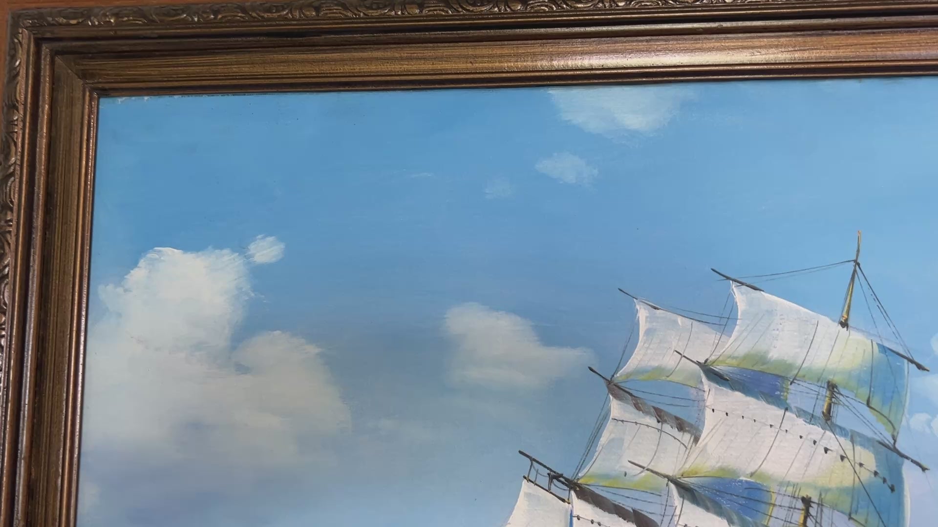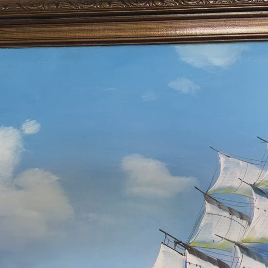 This impressive seascape captures a majestic clipper ship cutting through deep rolling waves under a bright sky. The artist uses bold, confident brushwork to create movement in the sails and water, giving the scene a sense of life and forward momentum. Soft white clouds drift across the sky while seagulls circle above, adding both atmosphere and scale. The palette of blues, greens, and clean whites creates a crisp nautical mood that works beautifully in coastal interiors, offices, or maritime collections.