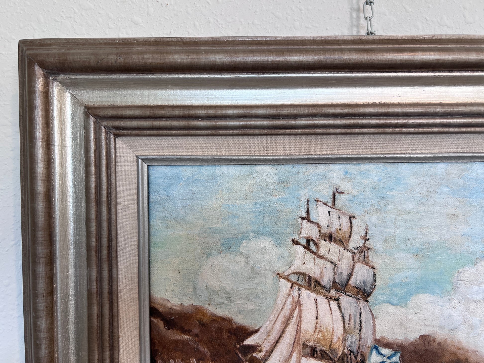 This vintage oil on canvas depicts a stately tall ship with full sails unfurled, navigating coastal waters with land rising in the background. The artist has signed the work in the lower right corner (signature partially stylized), and the composition conveys a sense of maritime heritage and seafaring adventure.
