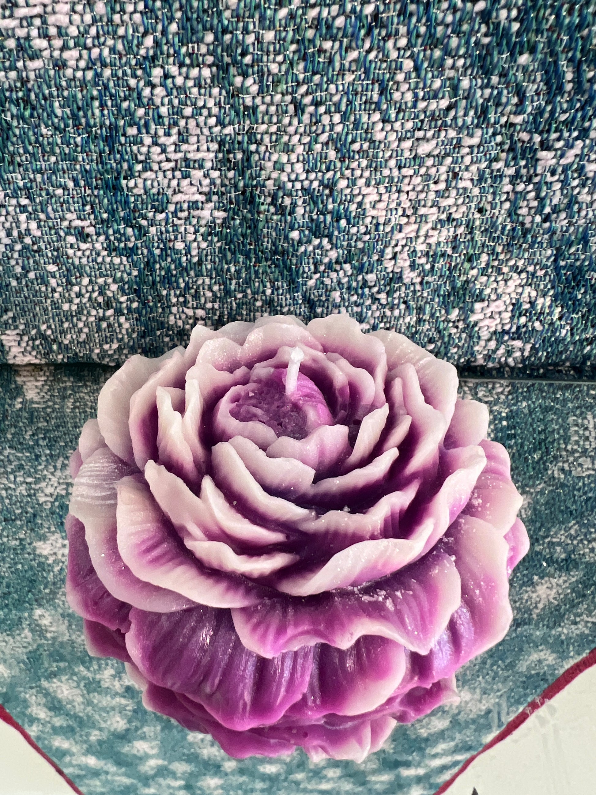 The candle, shaped like a blooming purple peony, is delicately hand-poured from 100% natural soy wax and infused with the romantic aroma of fresh lilac. The shimmering pearlescent finish gives it a soft, radiant glow when lit — perfect for décor, gifting, or a cozy night in.