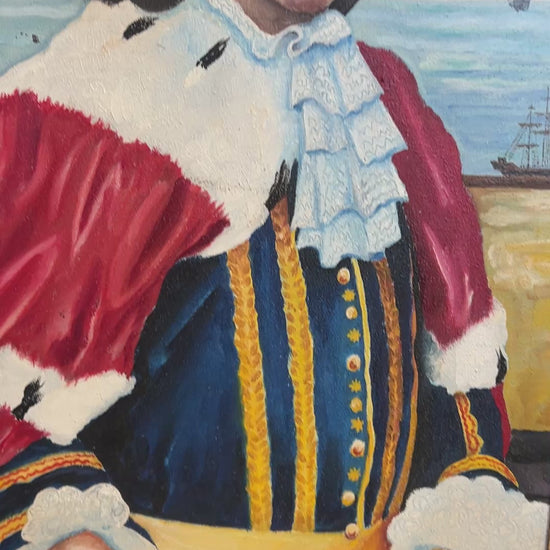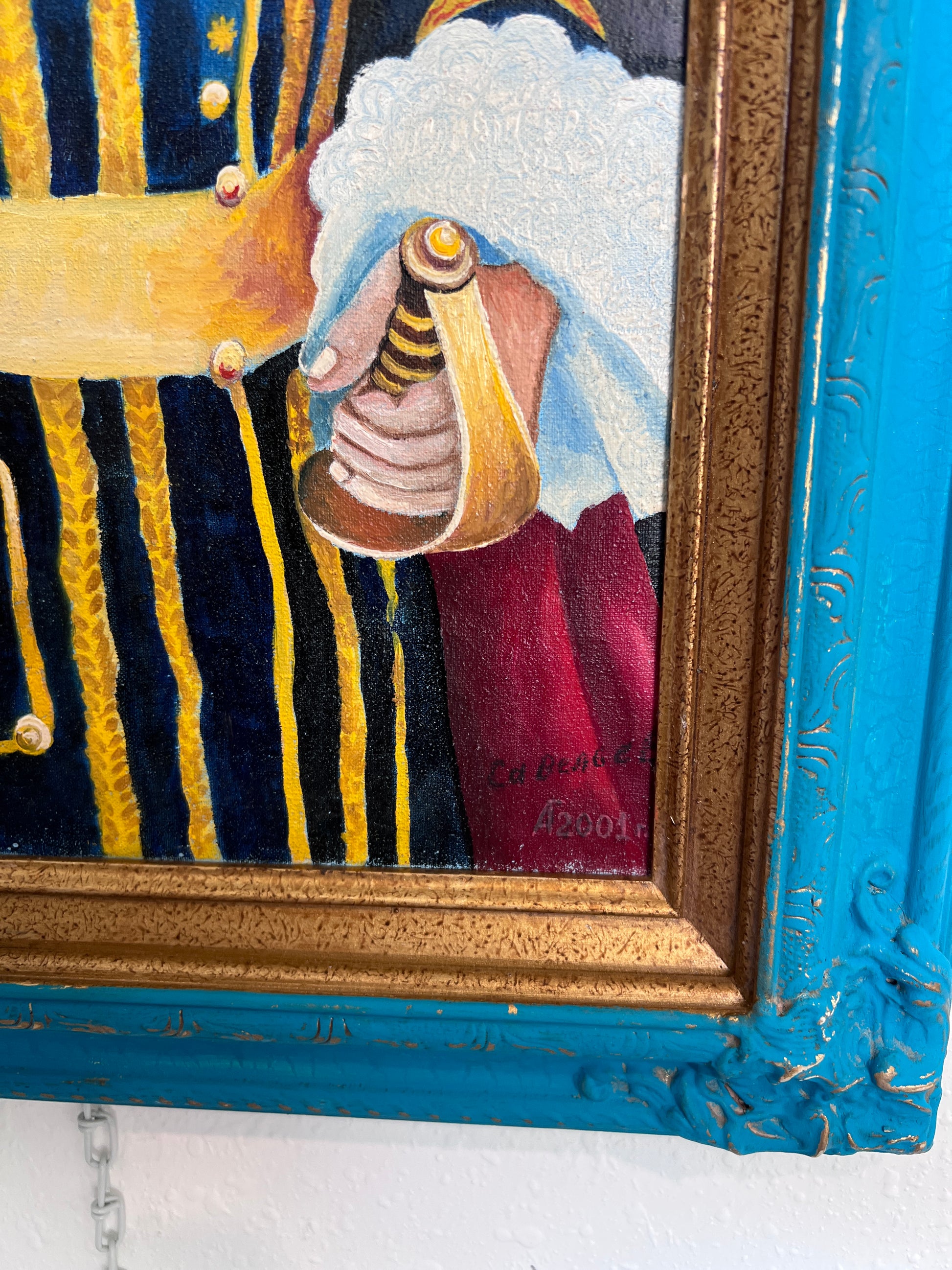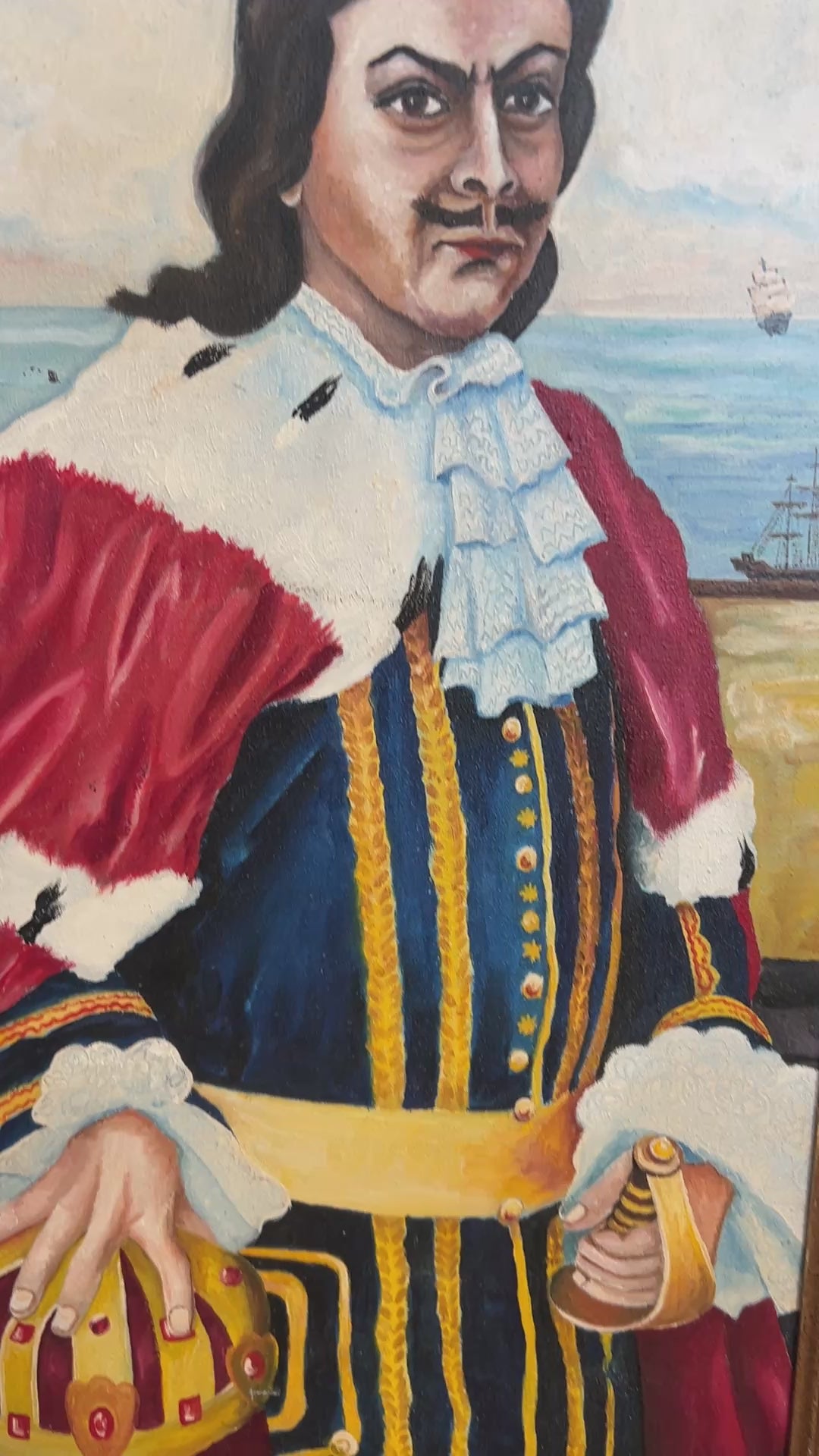 This striking oil on canvas, painted and signed by Russian artist A.G. Saveliev (Савельев А.Г.) in 2001, depicts Peter I (Peter the Great, 1672–1725), the first Emperor of Russia. The composition presents the tsar in full ceremonial attire, holding a golden crown in one hand and a sword in the other, with sailing ships visible in the seascape background—an allusion to Peter’s naval reforms and Russia’s rise as a maritime power.