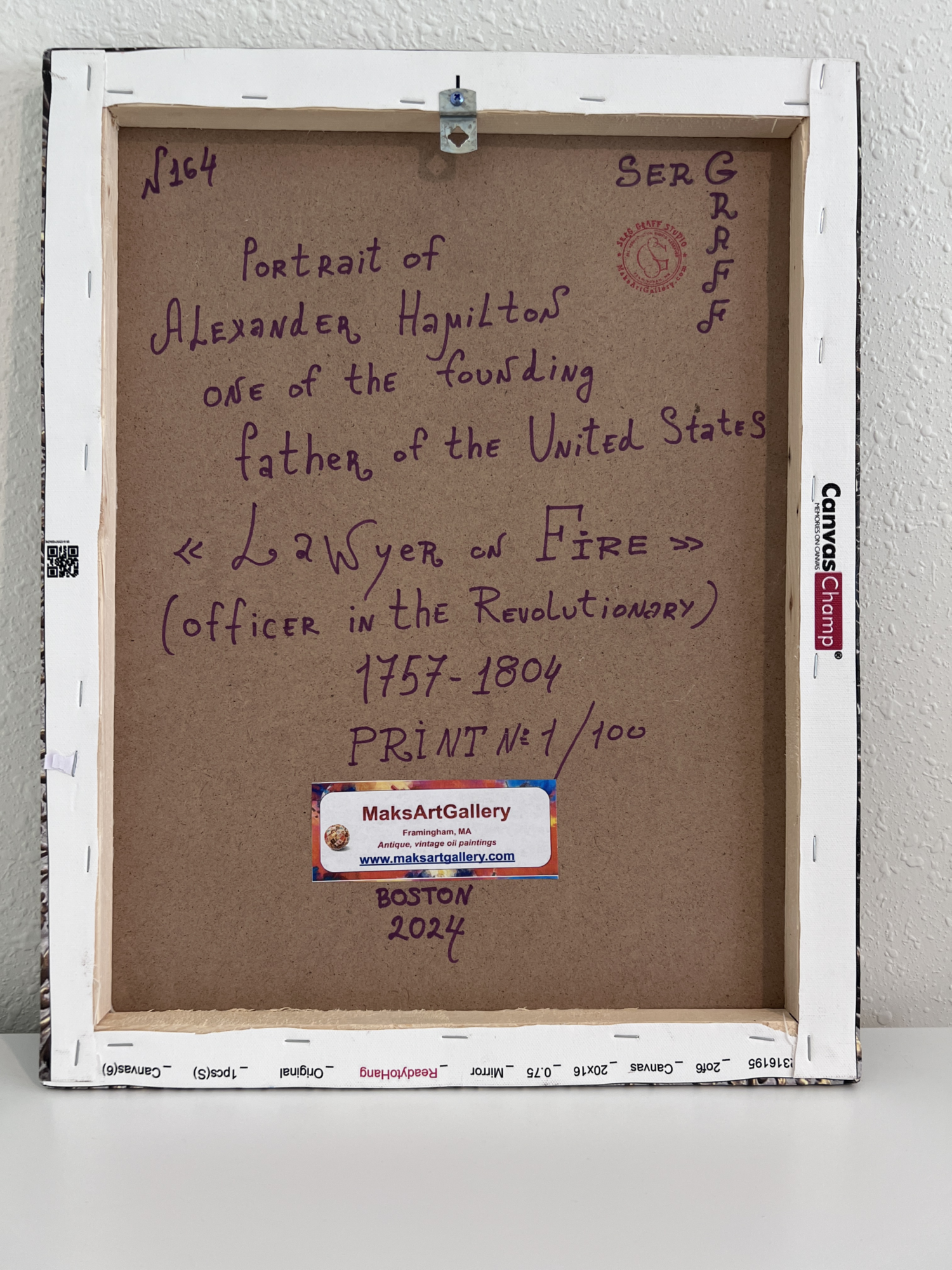 PRINT On Canvas, Portrait ALEXANDER HAMILTON By Serg Graff Limited Edition COA