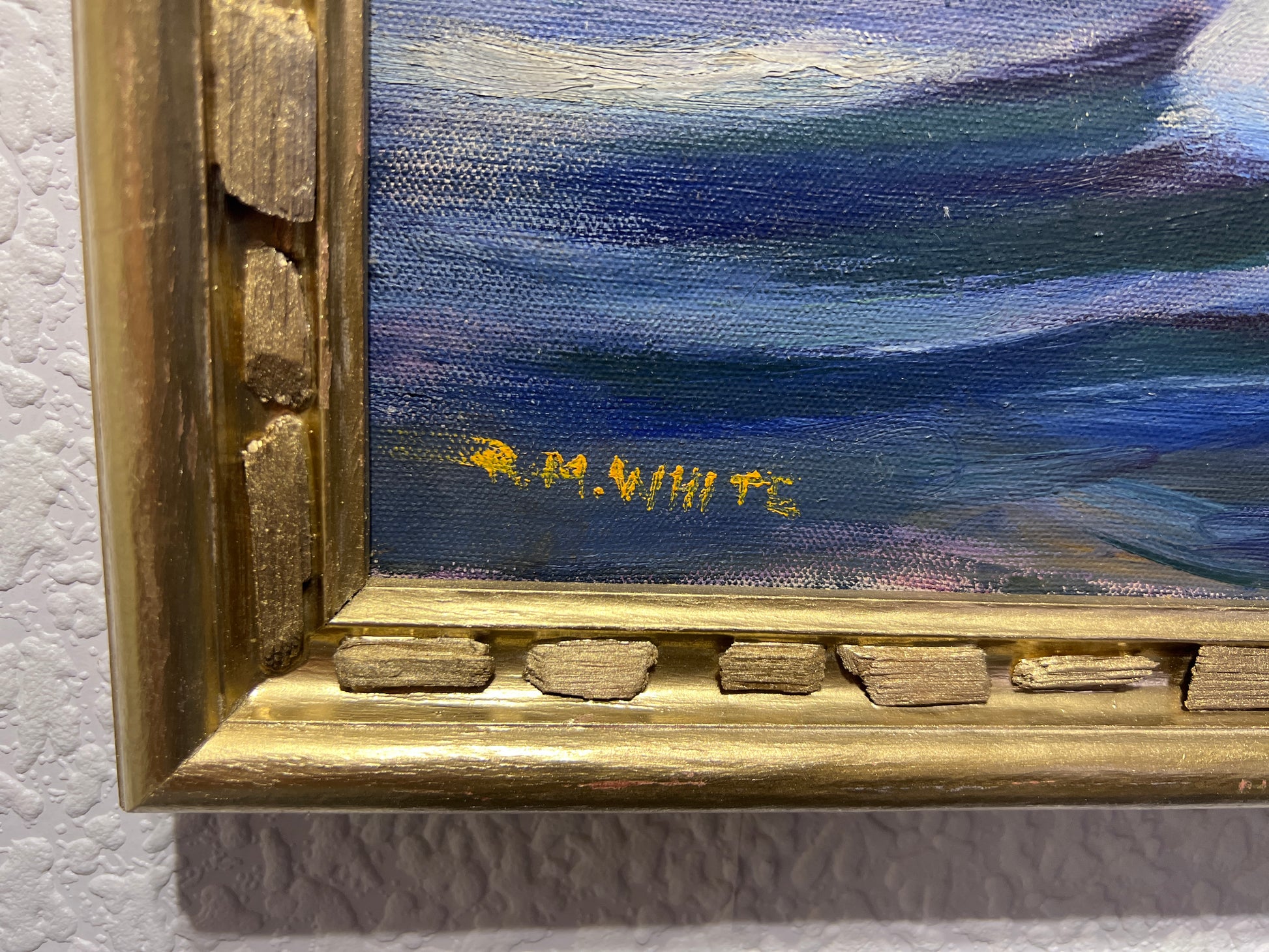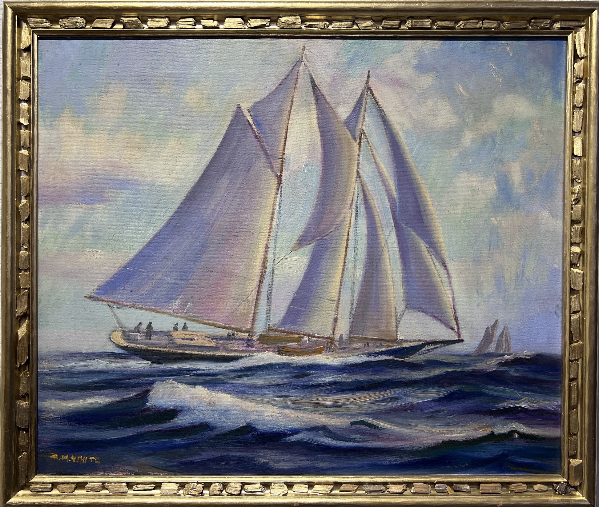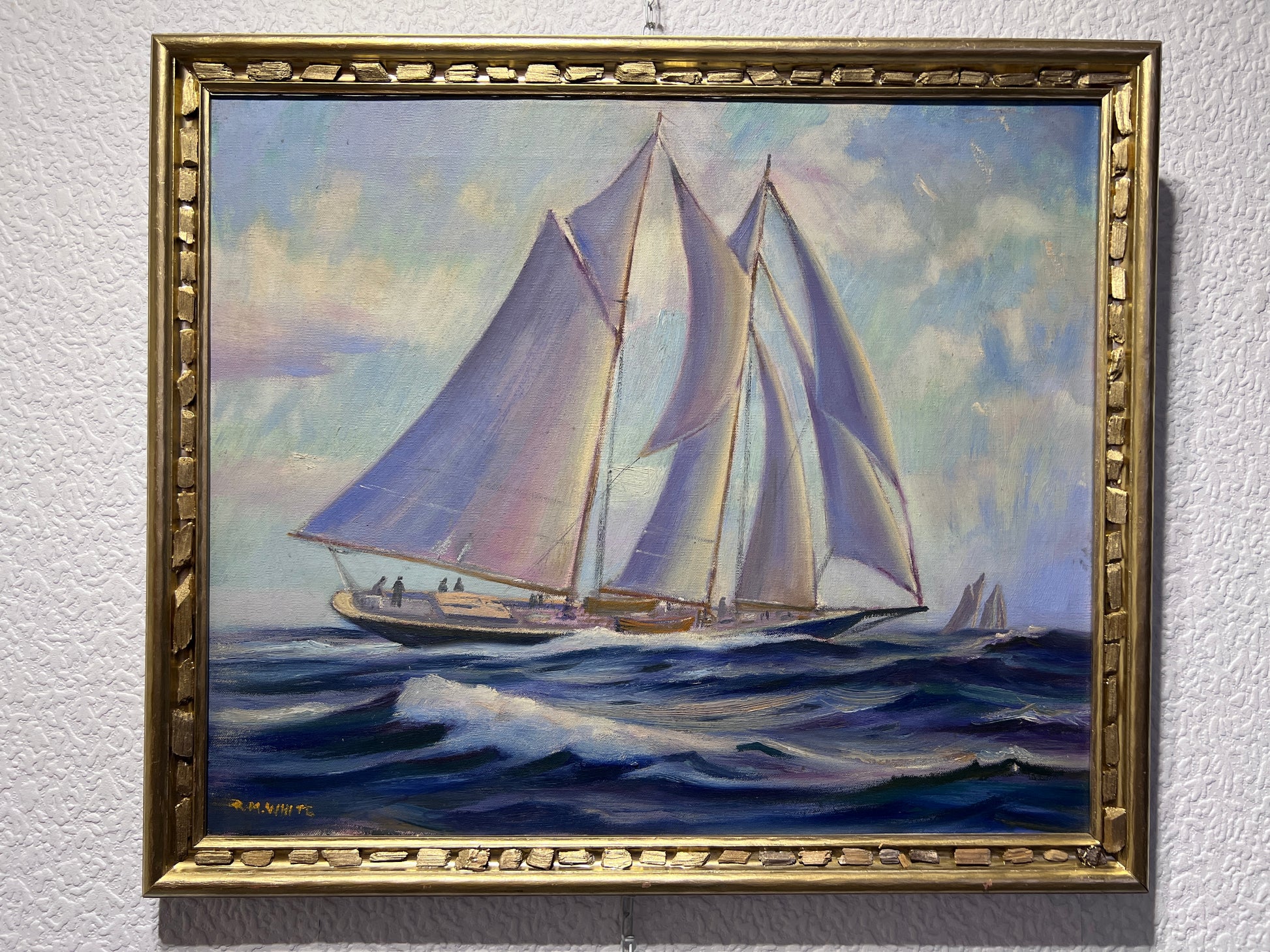 R.M. WHITE Vintage Oil painting on canvas Seascape, Sailing Ship in the ocean