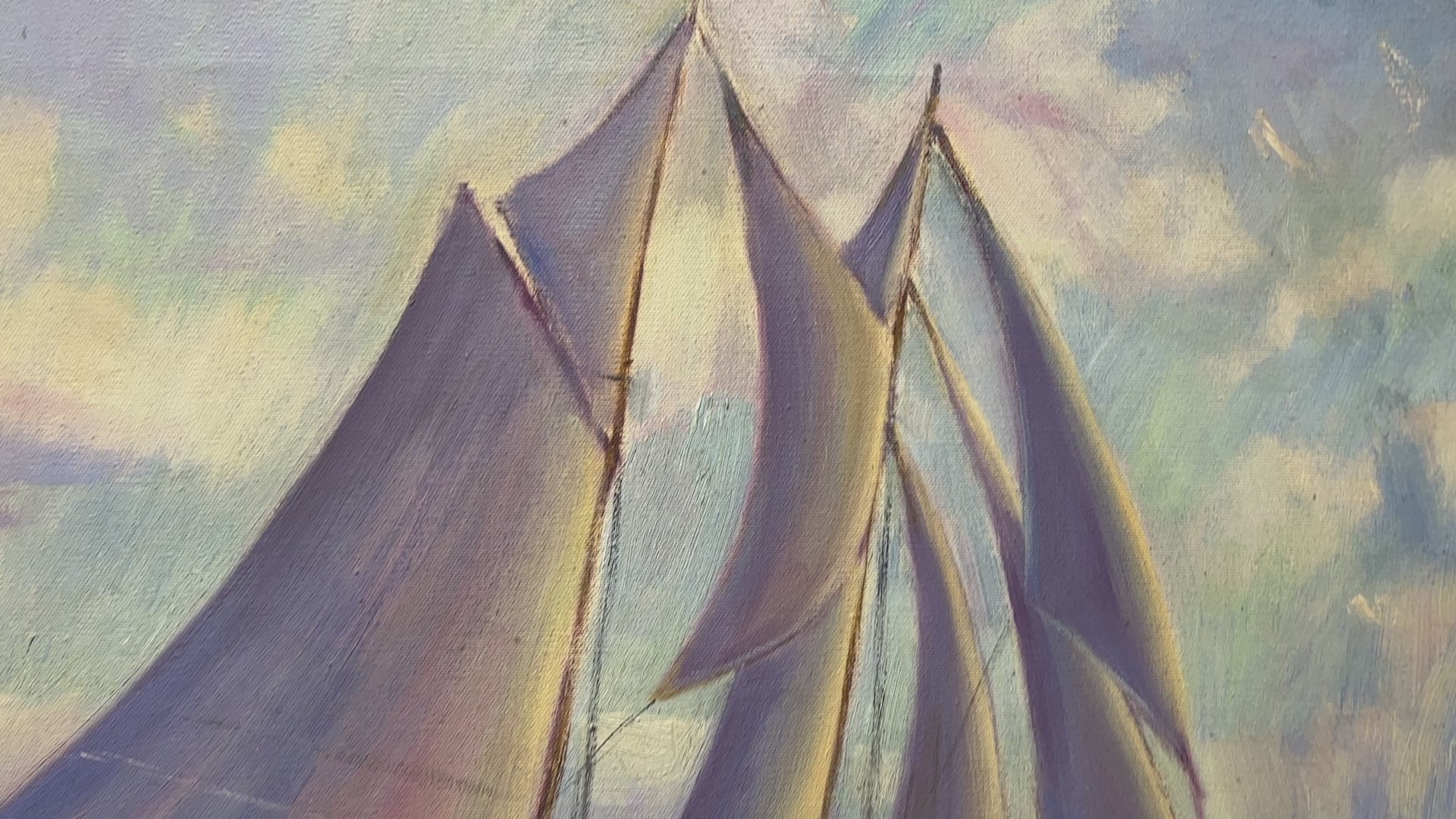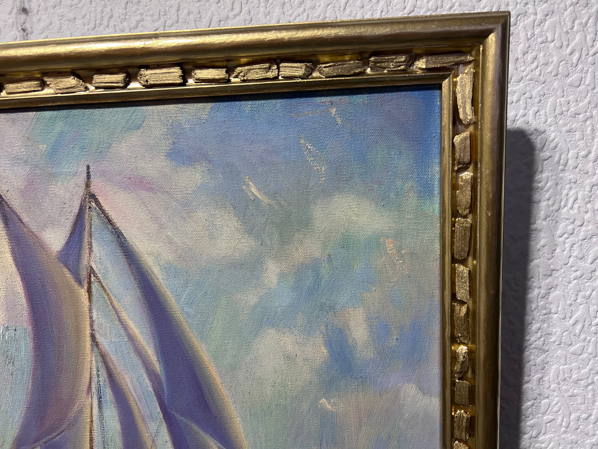 This is an original vintage oil painting on canvas depicting a majestic sailing ship cutting gracefully through the ocean. The ship’s white sails are fully billowed, catching the wind as it glides across the rolling waves. The water is rendered in shades of blue and white, beautifully capturing the motion and texture of the sea. Above, a soft pastel sky with drifting clouds creates a serene yet dynamic atmosphere.