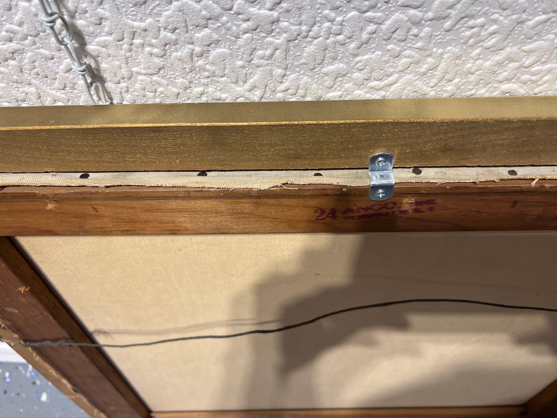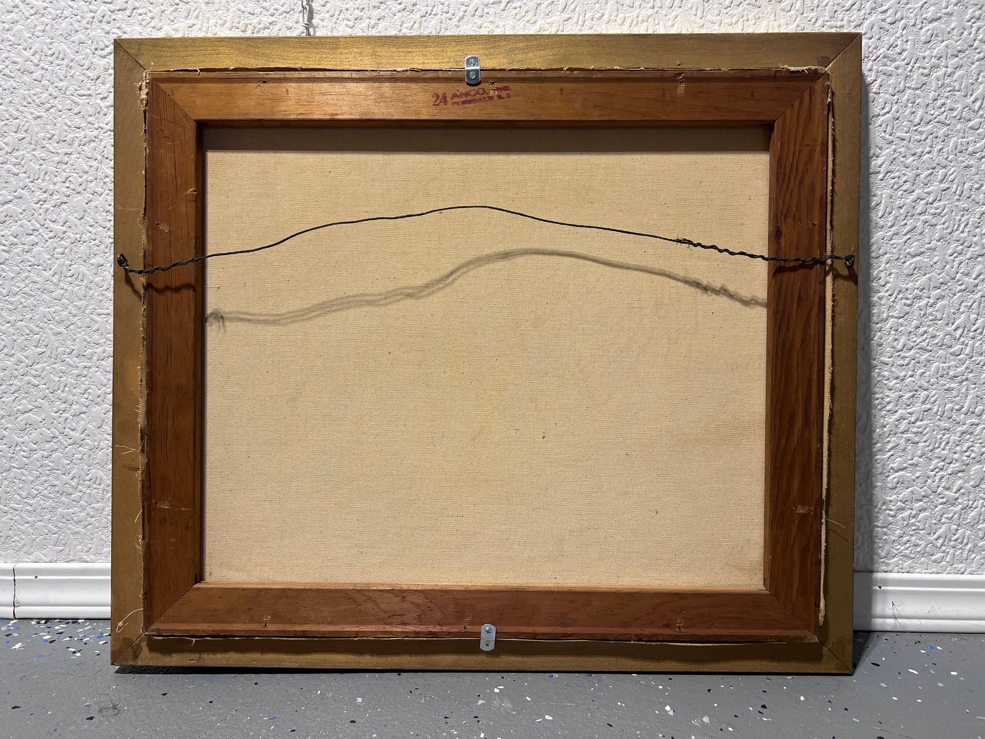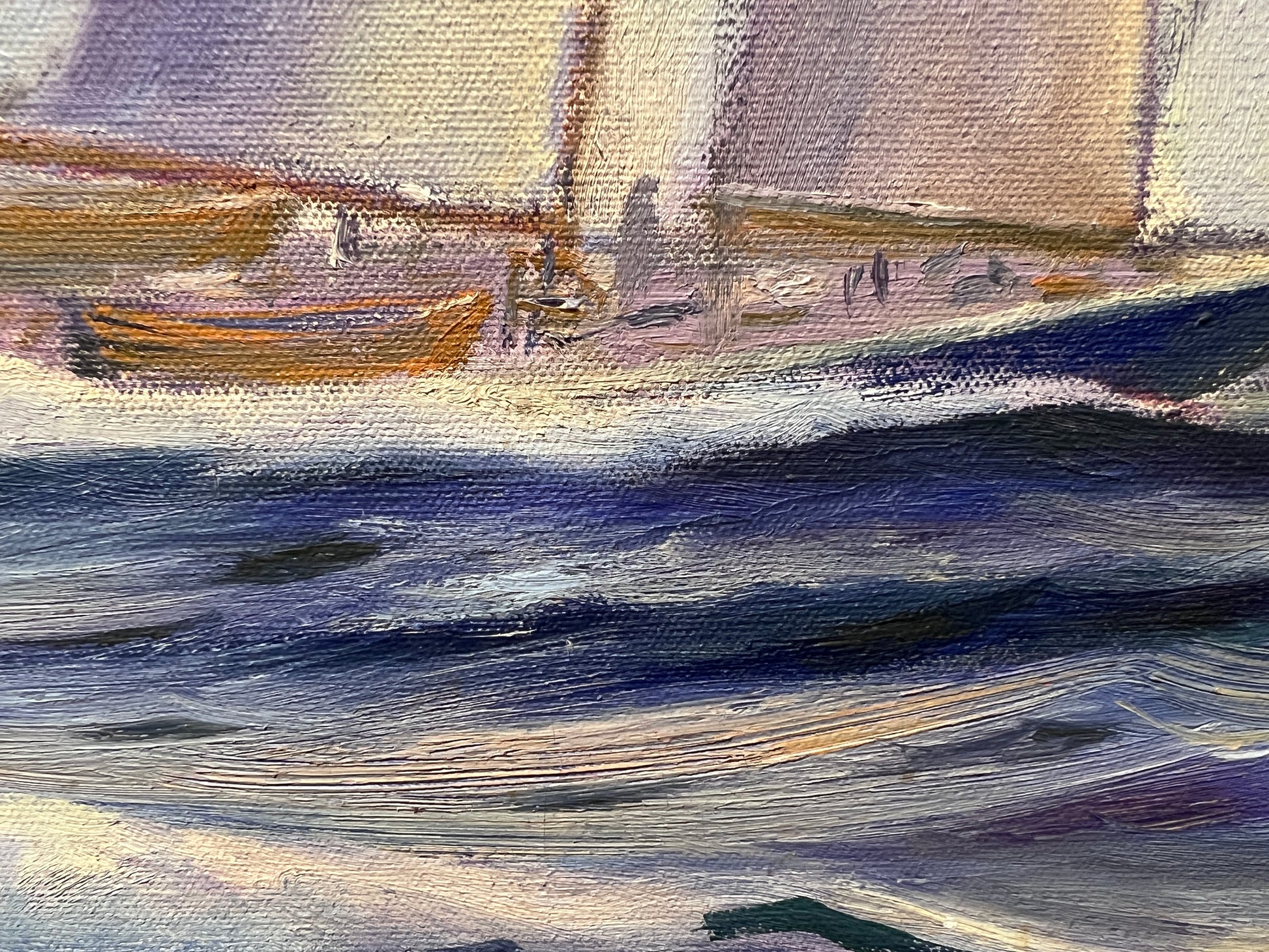 The painting is presented in a hand-decorated frame that complements its nautical charm. A wonderful piece for maritime collectors or anyone who appreciates classic seascapes.