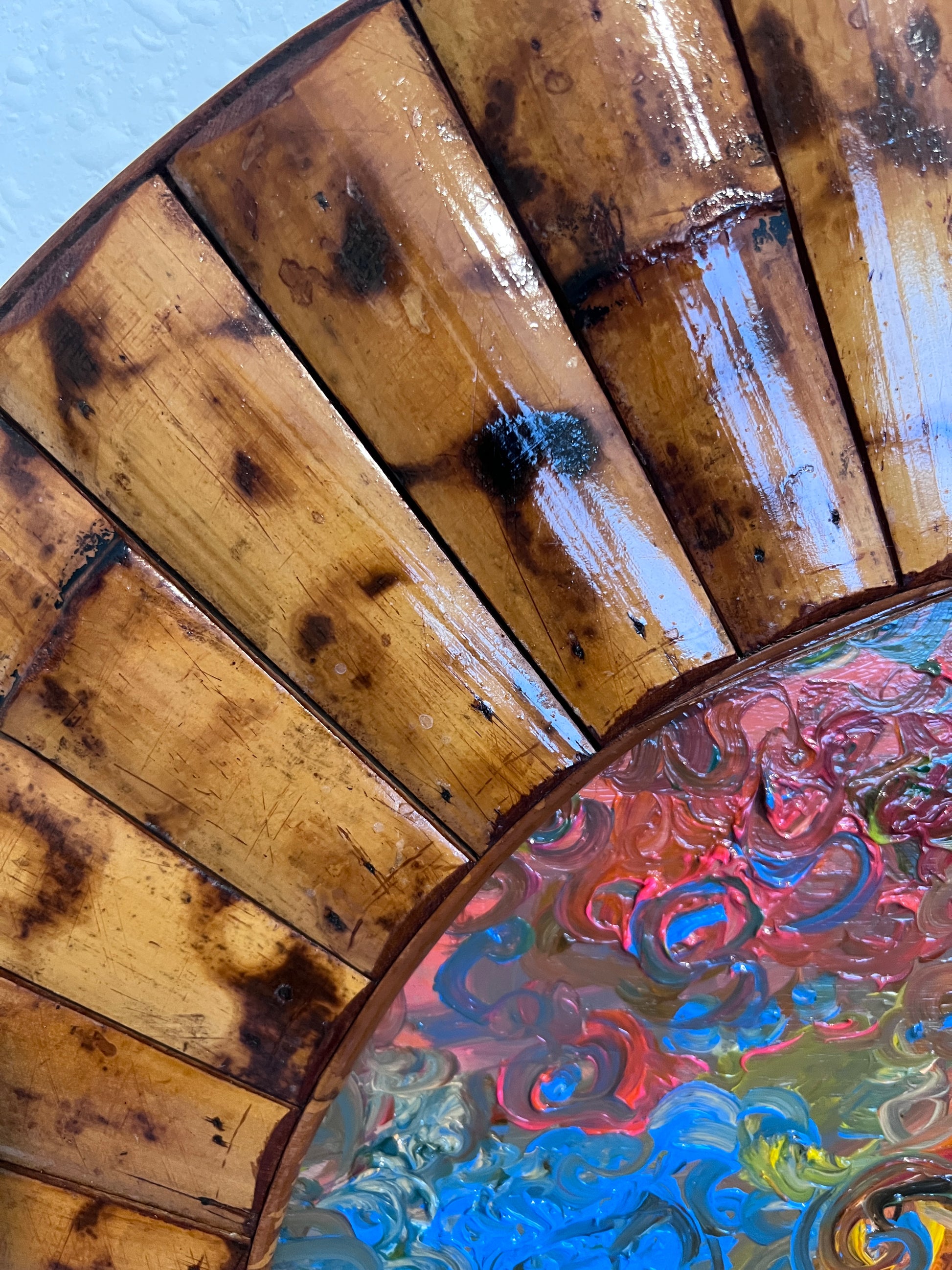 🖼️ Frame: Custom round varnished wood frame, highly detailed and in good condition