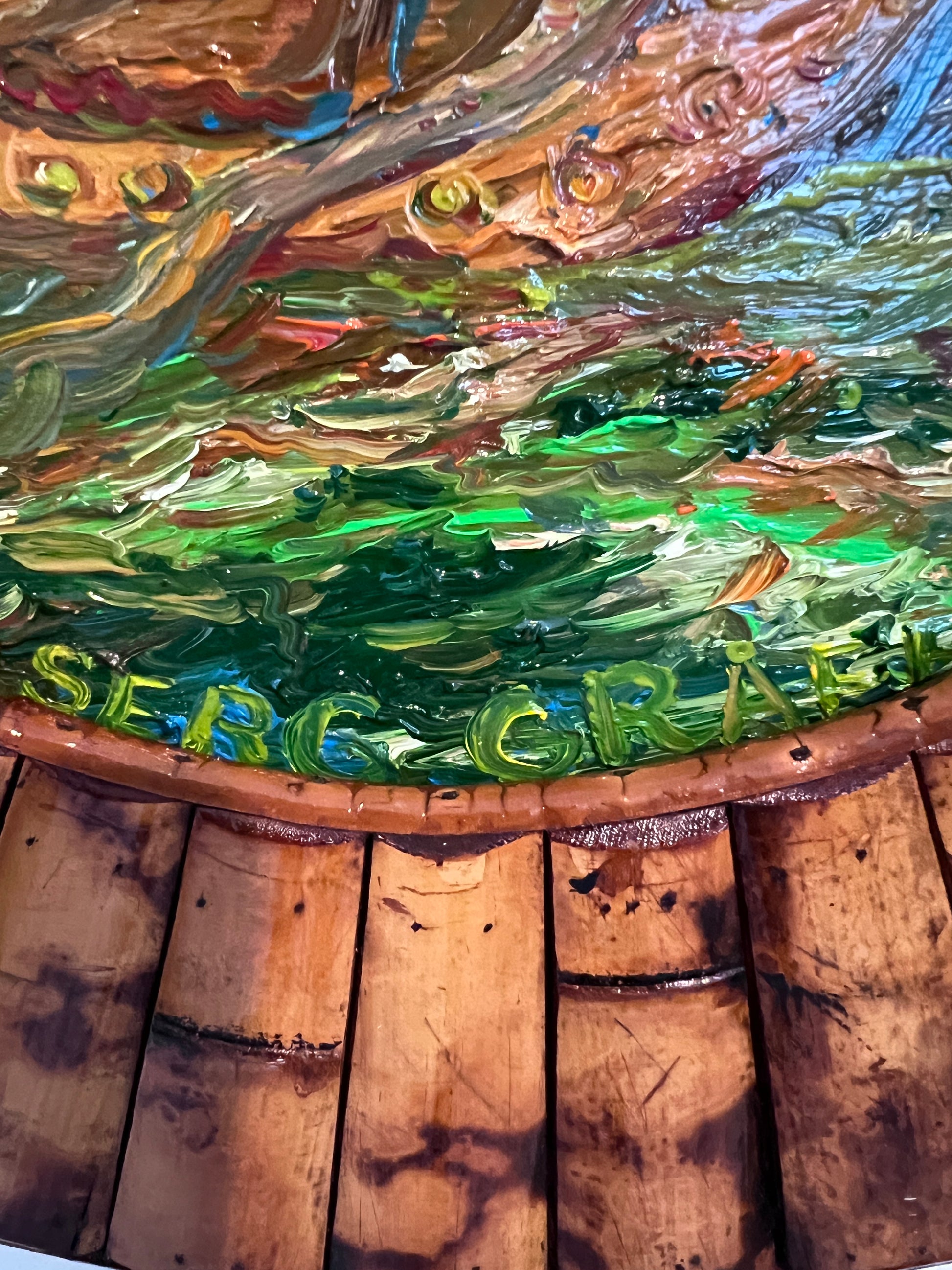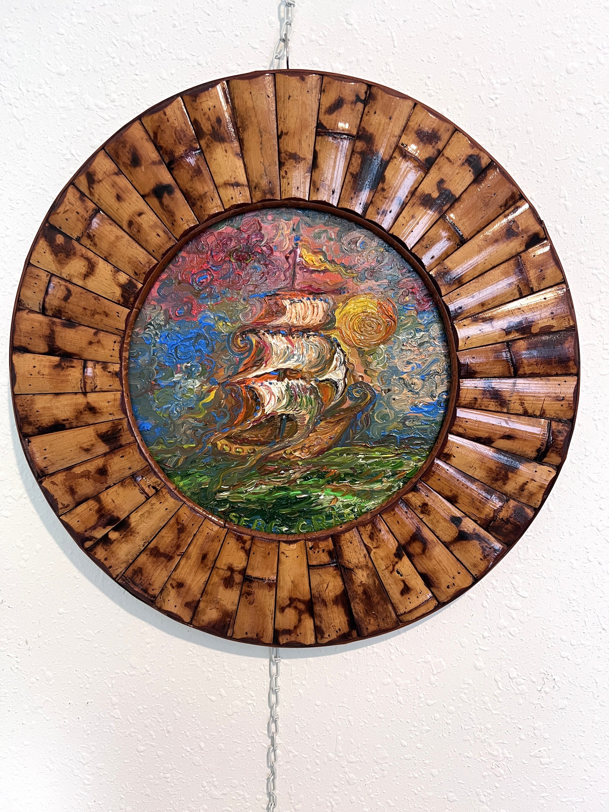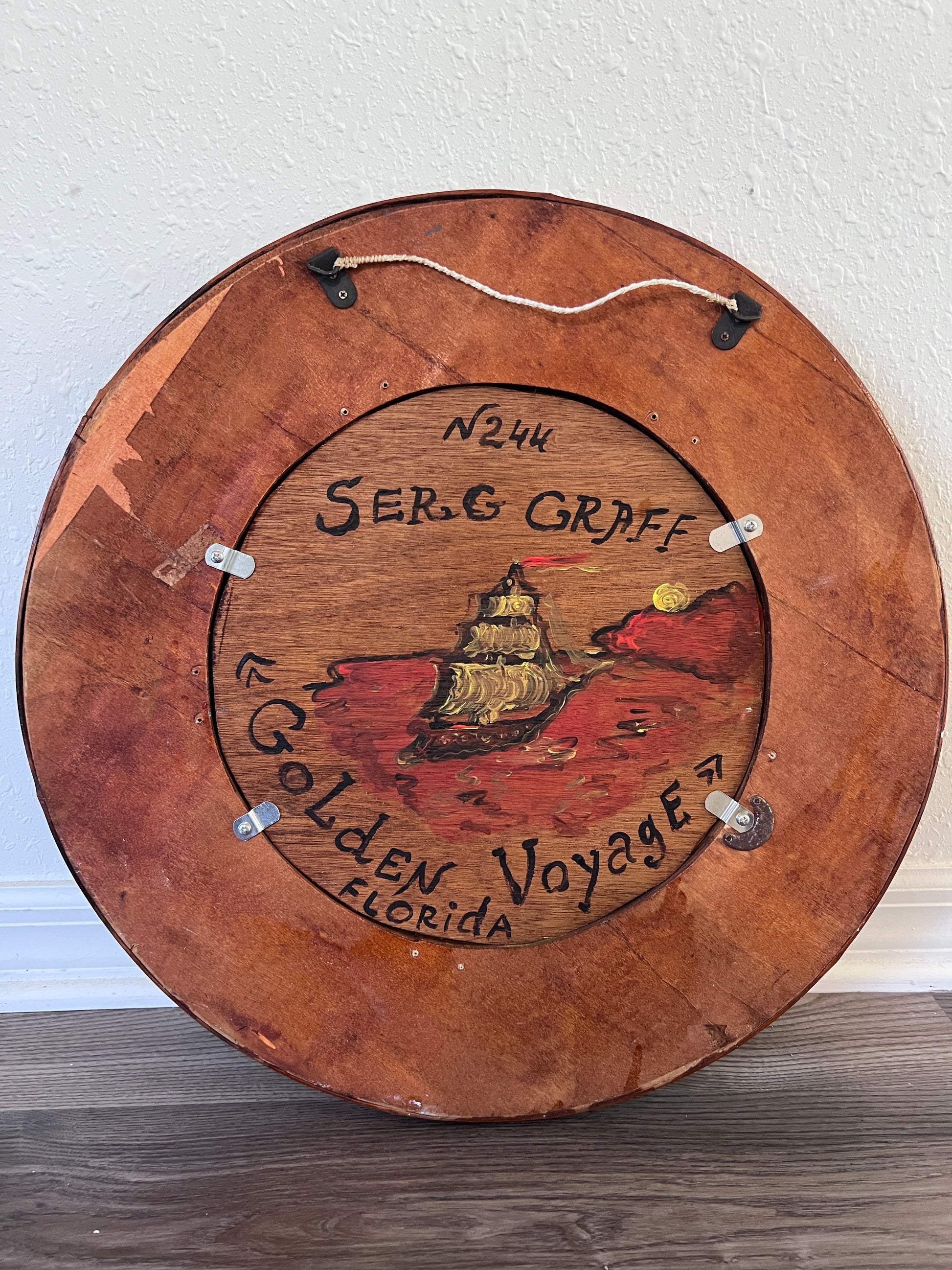 The round composition is mounted within a unique hand-crafted wood frame resembling a ship’s wheel, accentuating the maritime theme and giving the piece a distinctly nautical charm. A Certificate of Authenticity (COA) from Serg Graff is included.