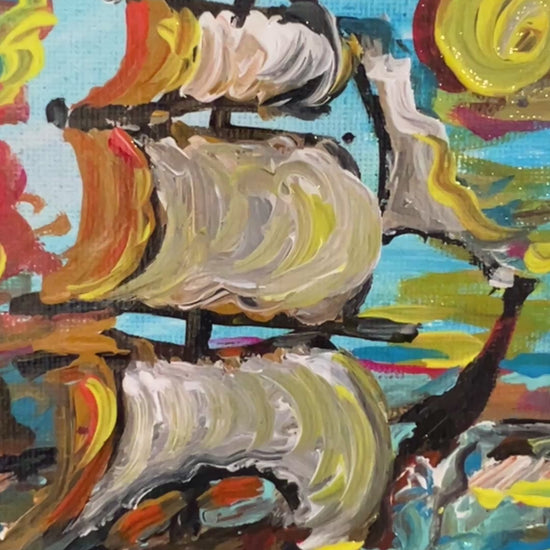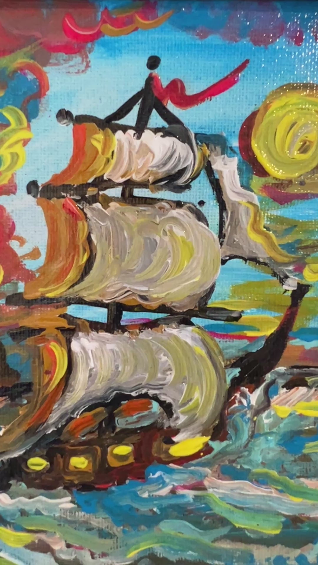 This striking original acrylic painting by Serg Graff, titled “Brigel” , captures the luminous power of the open sea and the symbolic voyage of human spirit. Painted in 2025, the work portrays a tall ship cutting through vibrant turquoise waters beneath a radiant golden sun — a hallmark of Graff’s bold, expressionistic style.