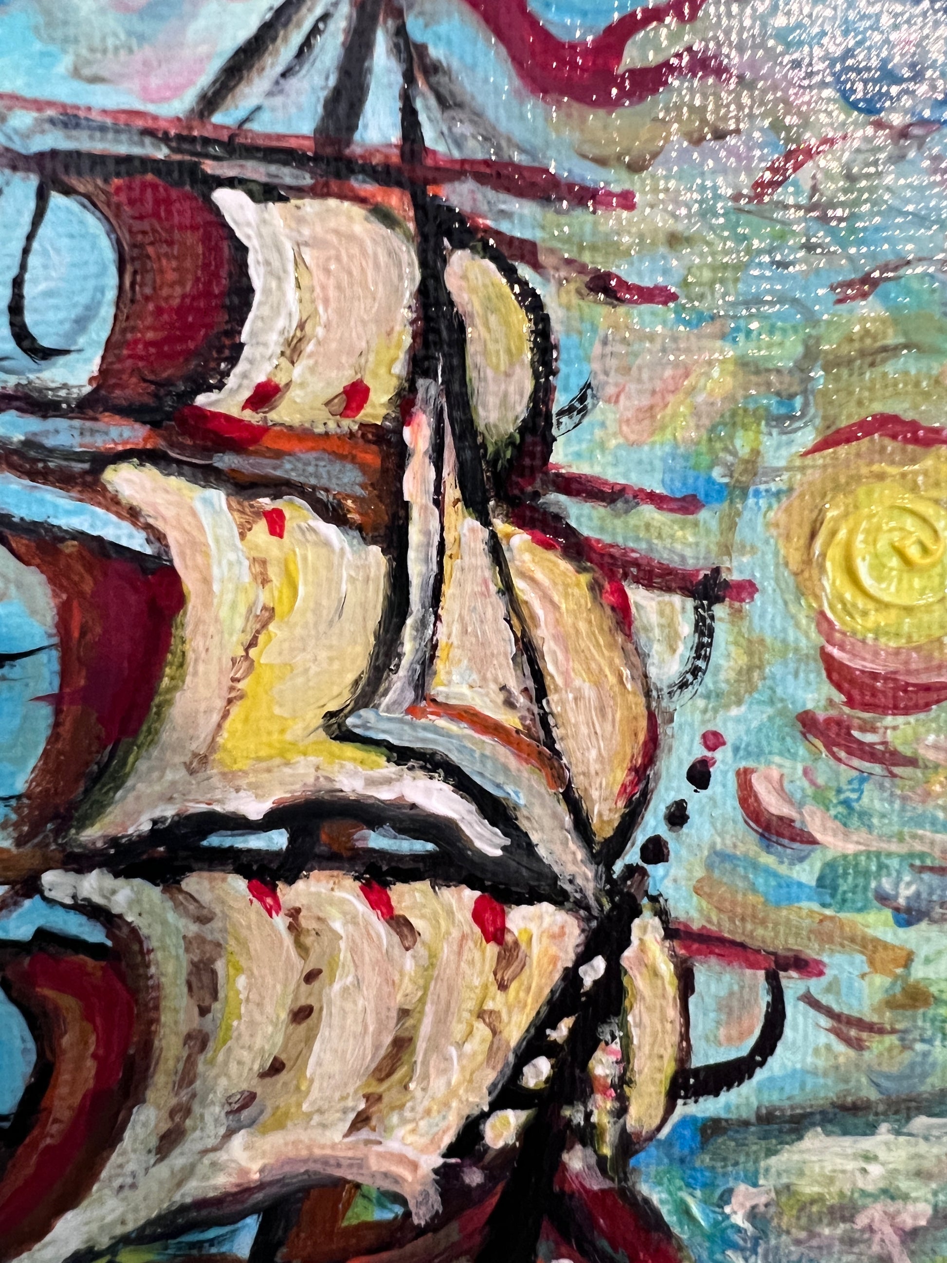 This captivating original acrylic painting by Serg Graff, titled “Maris” , portrays a luminous ship sailing through a radiant sea under a swirling golden sun. The artist’s signature impasto technique and vibrant color palette — pink skies, teal waves, and bursts of yellow — create a sense of mystical energy and motion.