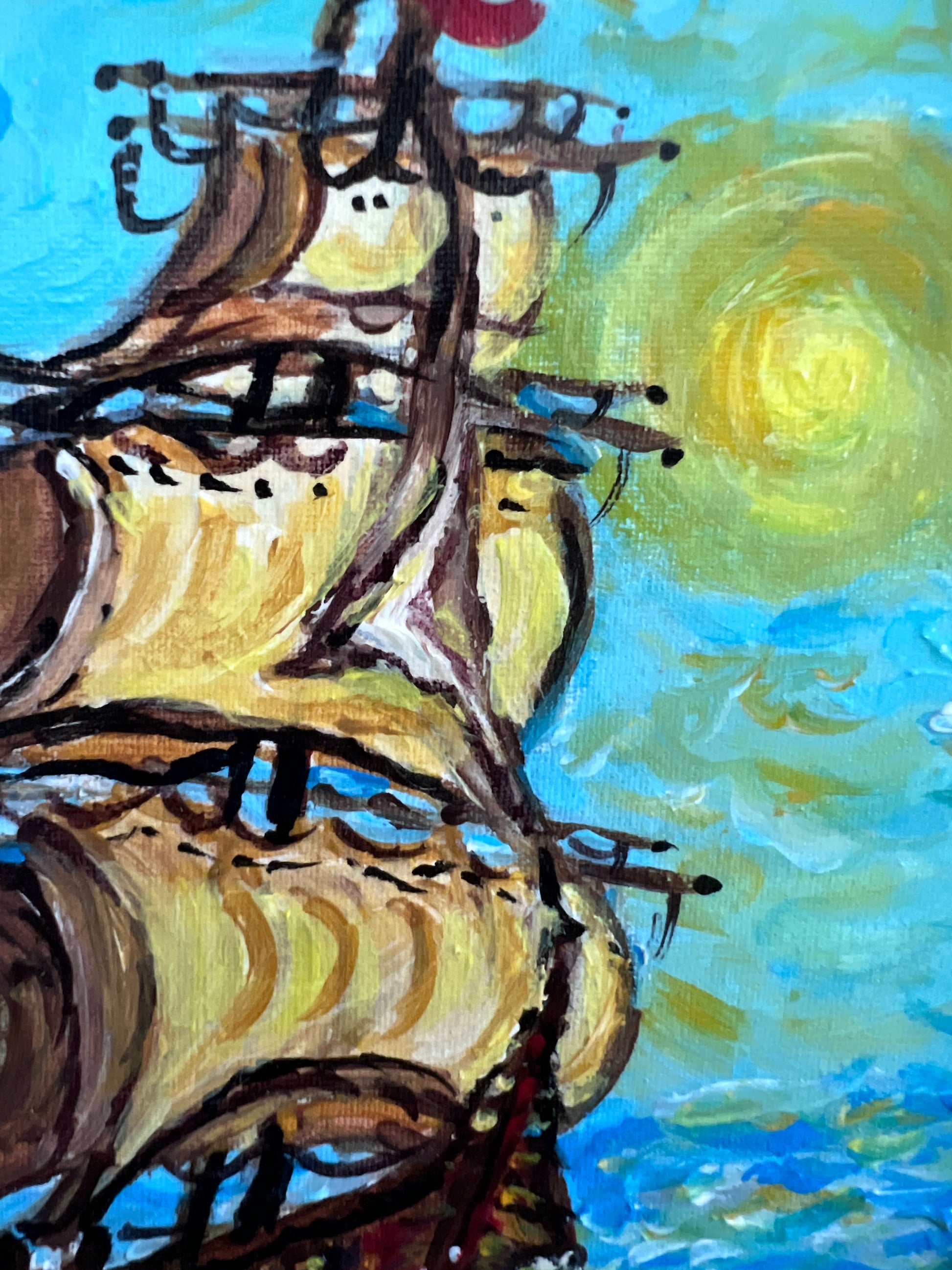 This captivating original acrylic painting by Serg Graff, titled “Mirage” , portrays a luminous ship sailing through a radiant sea under a swirling golden sun. The artist’s signature impasto technique and vibrant color palette — pink skies, teal waves, and bursts of yellow — create a sense of mystical energy and motion.