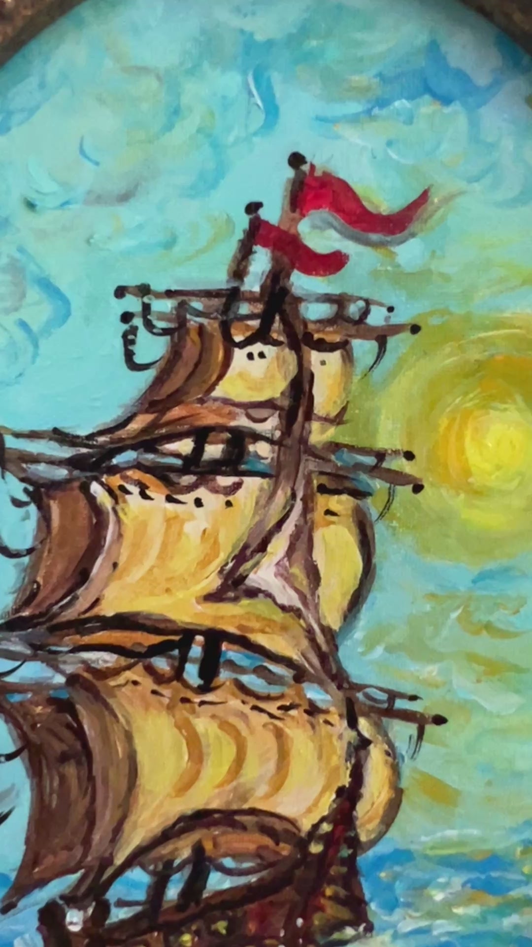 Graff’s miniature works are known for their symbolic storytelling and vivid maritime themes. This piece embodies freedom and inner light, painted in 2025 in Florida and framed in an exquisite vintage-style gold ornate frame, which perfectly complements its radiant tones.