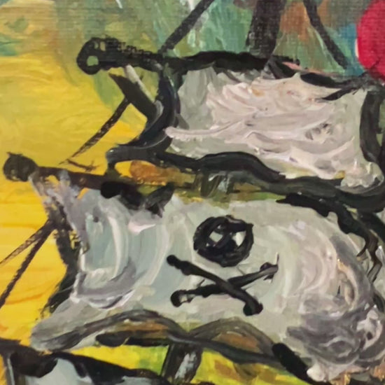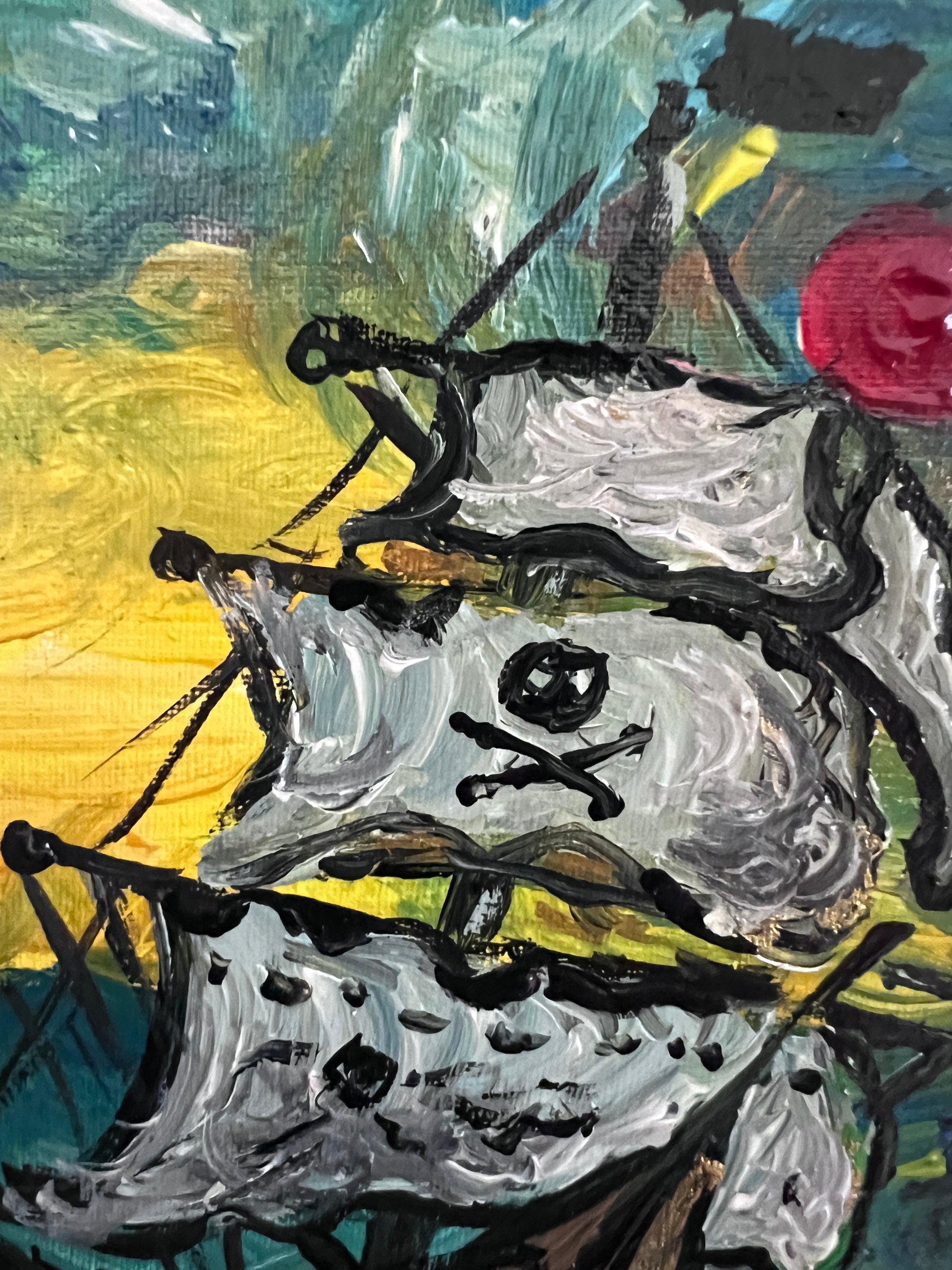 This original acrylic painting on canvas board, titled “Black Wake”, is a dynamic maritime artwork by contemporary artist Serg Graff (2025). The piece captures a bold pirate ship battling through wild, swirling waters under a vivid yellow-blue sky and blazing red sun — a trademark of Graff’s expressive, impasto-driven brushwork.