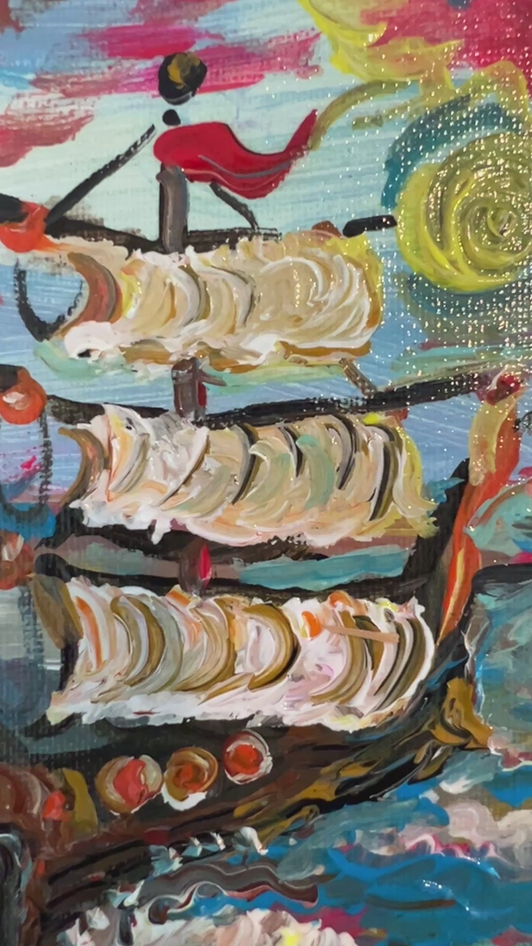 This captivating original acrylic painting by Serg Graff, titled “Yeloria” , portrays a luminous ship sailing through a radiant sea under a swirling golden sun. The artist’s signature impasto technique and vibrant color palette — pink skies, teal waves, and bursts of yellow — create a sense of mystical energy and motion.