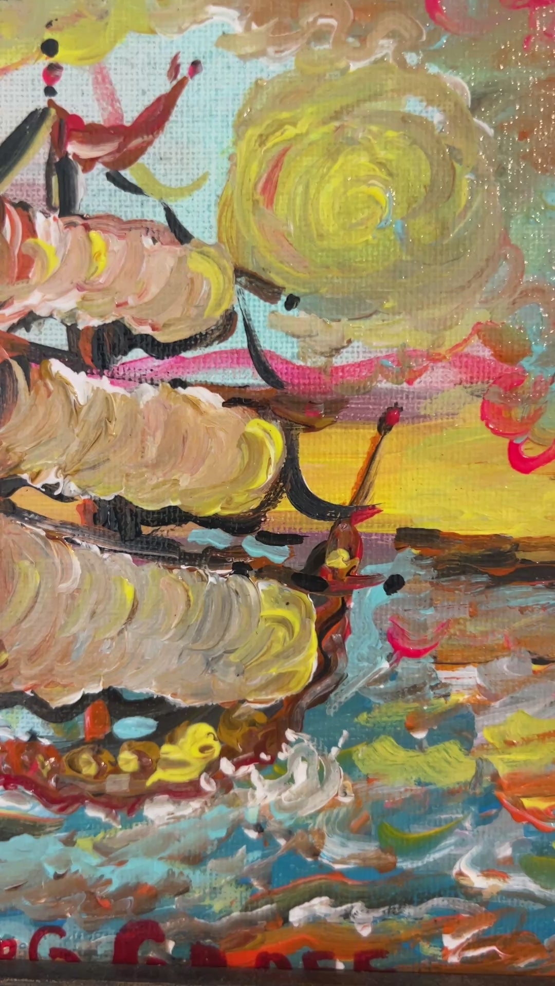 The artist’s signature impasto brushwork and use of contrasting tones — cobalt blue skies, warm amber sails, and crimson reflections — evoke both motion and meditation. Set within a richly textured dark gold frame.
