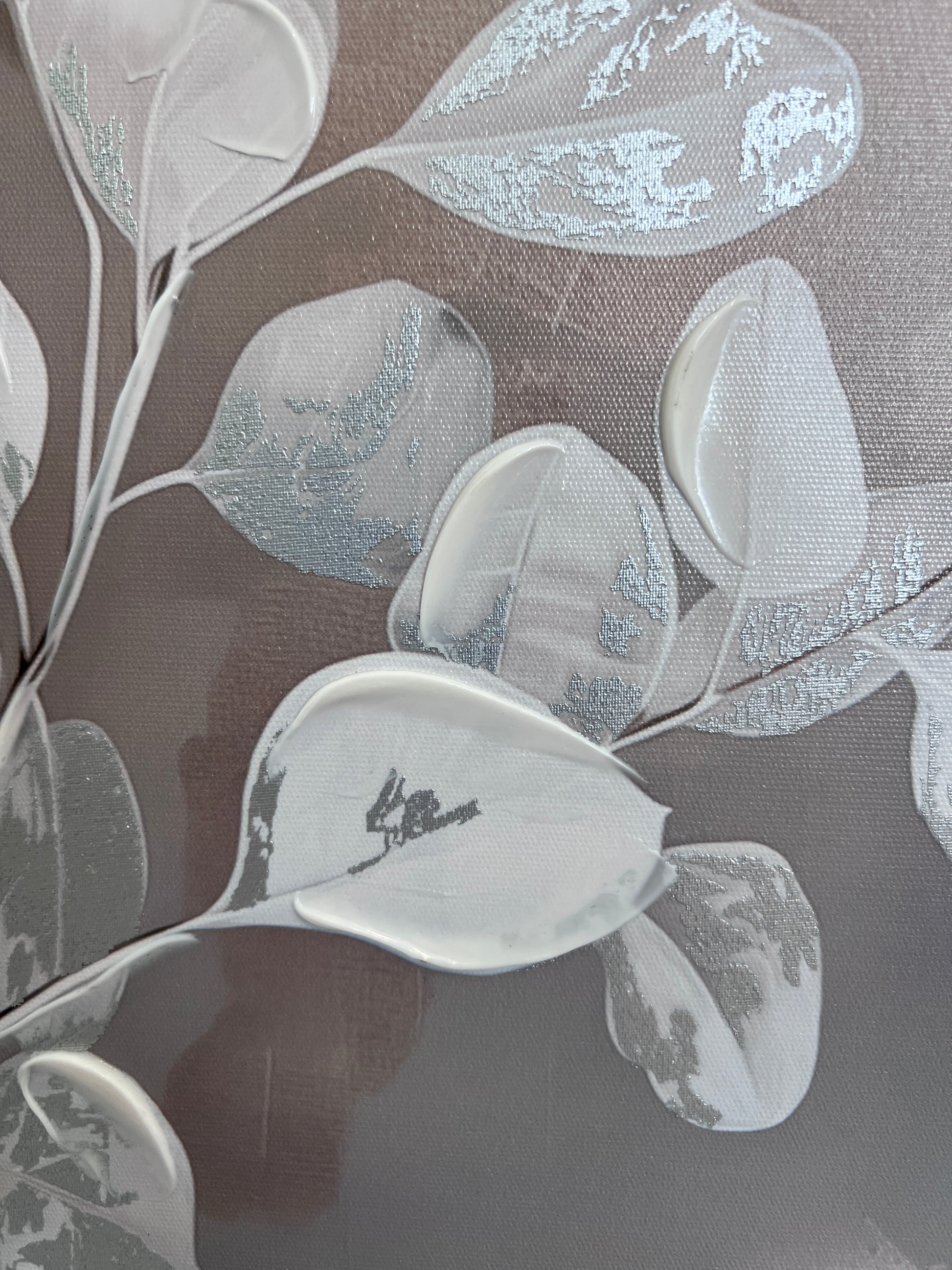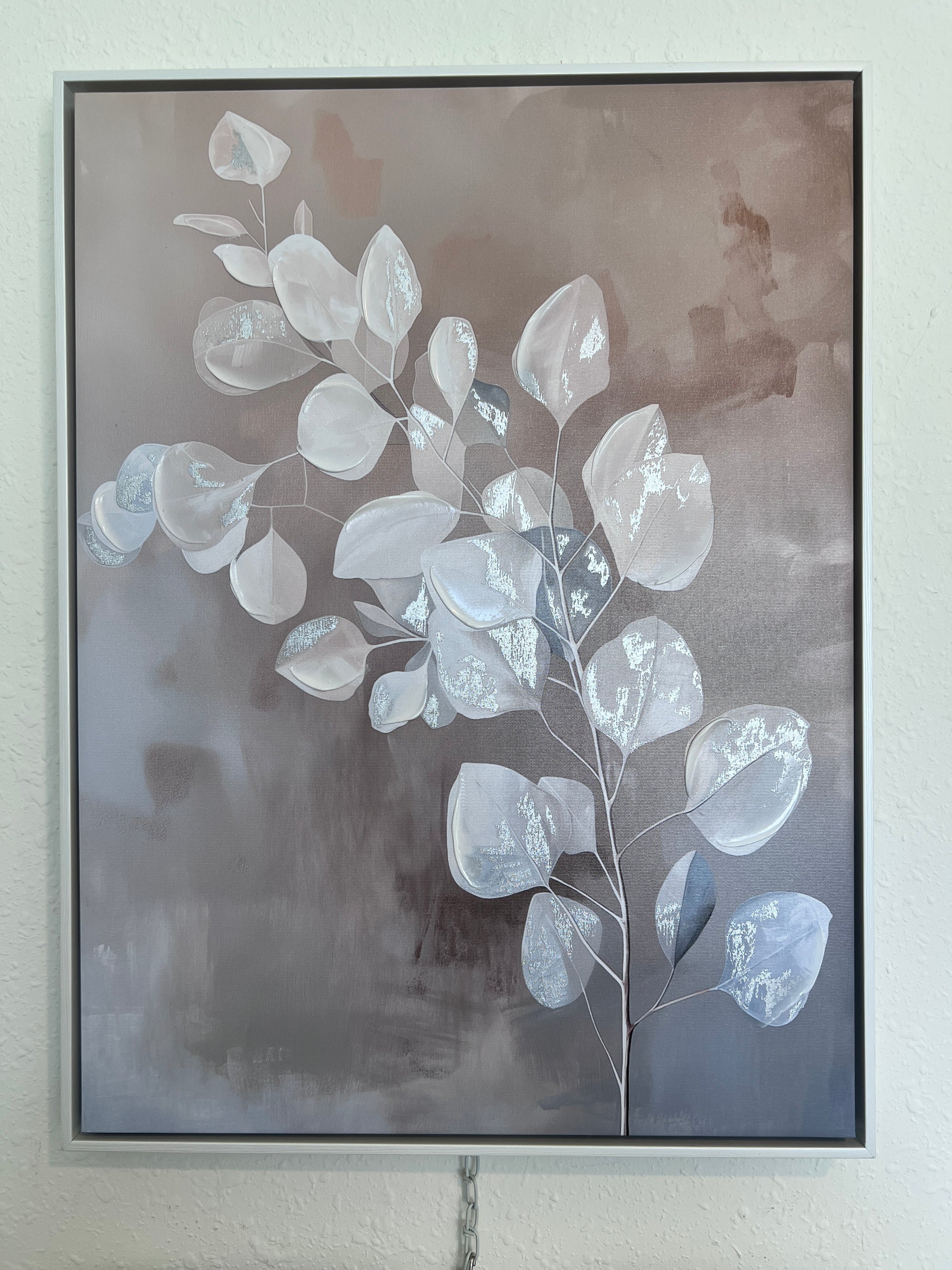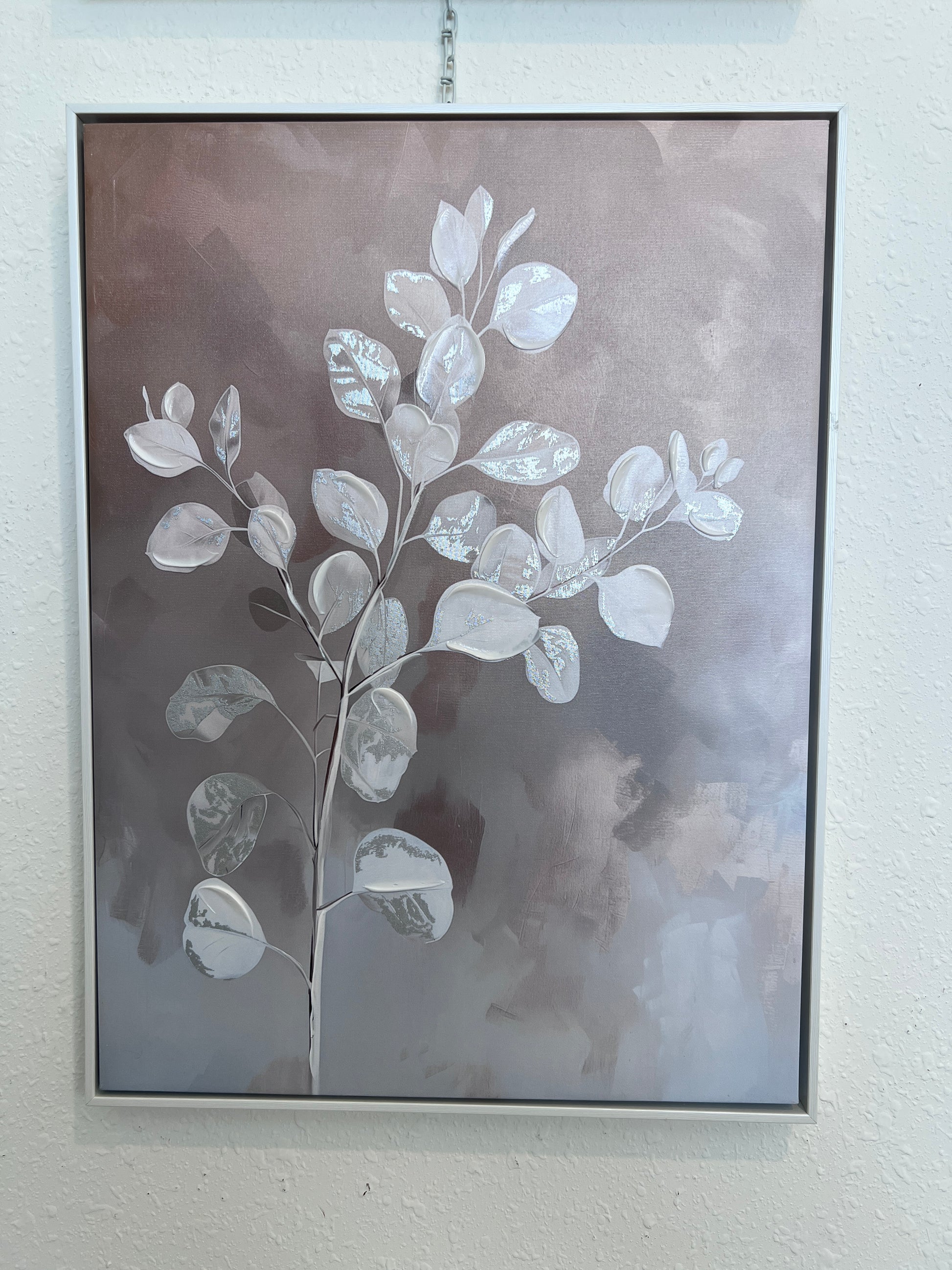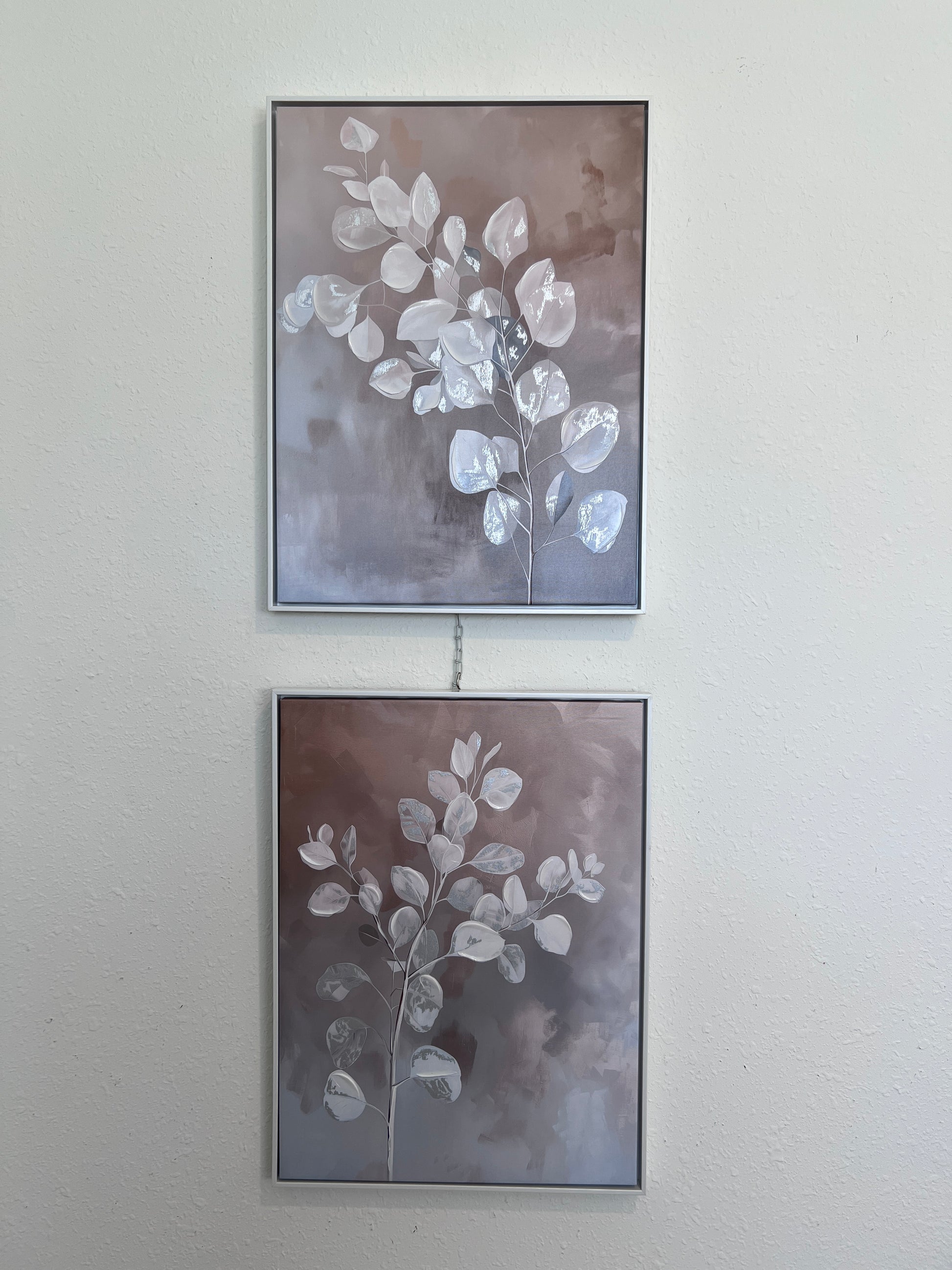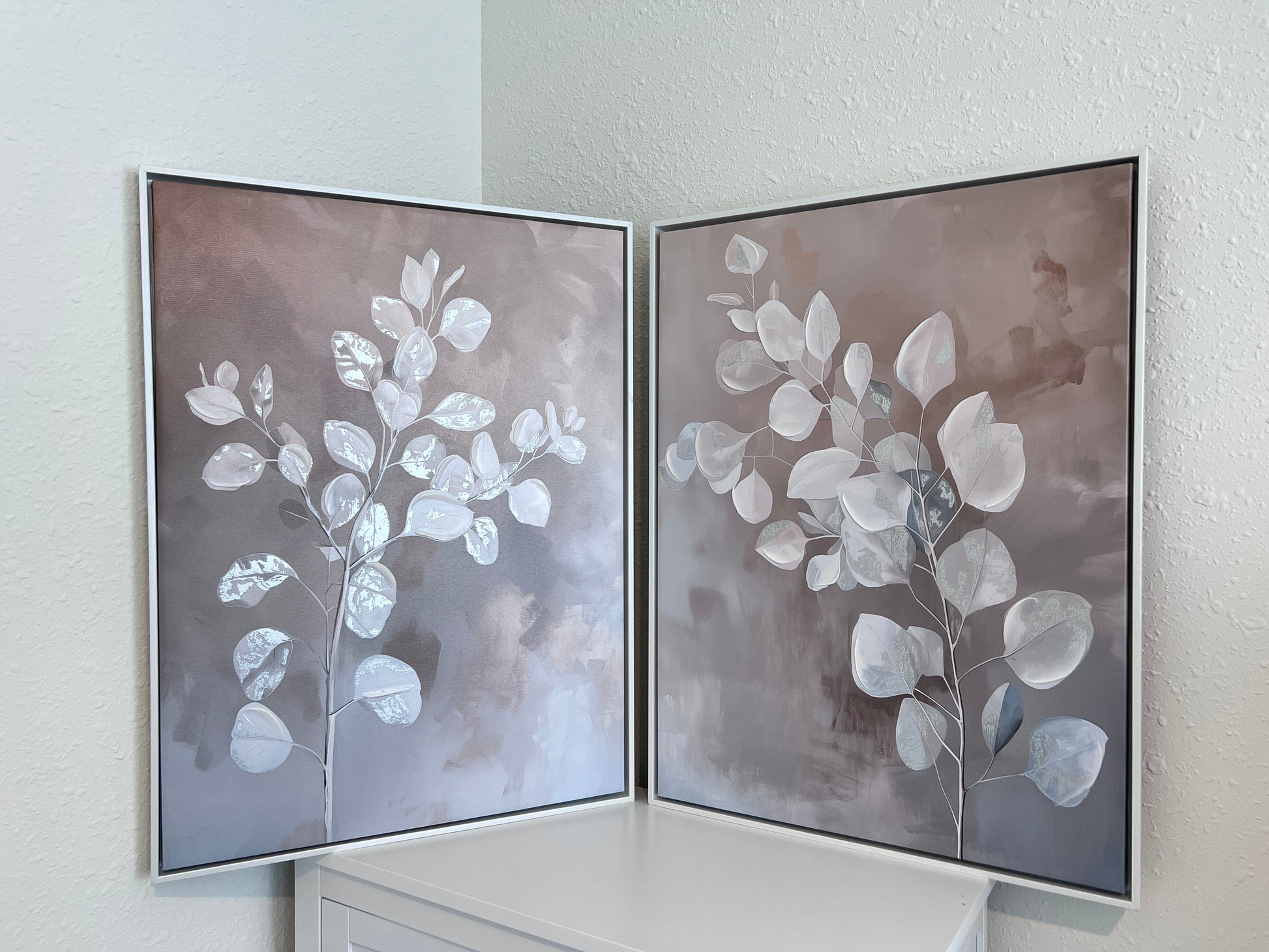 This elegant set of two matching framed canvas prints features a soft, neutral-toned background with delicate white botanical leaf designs. Each piece showcases subtle metallic accents and raised textures that add dimension and sophistication to any room.