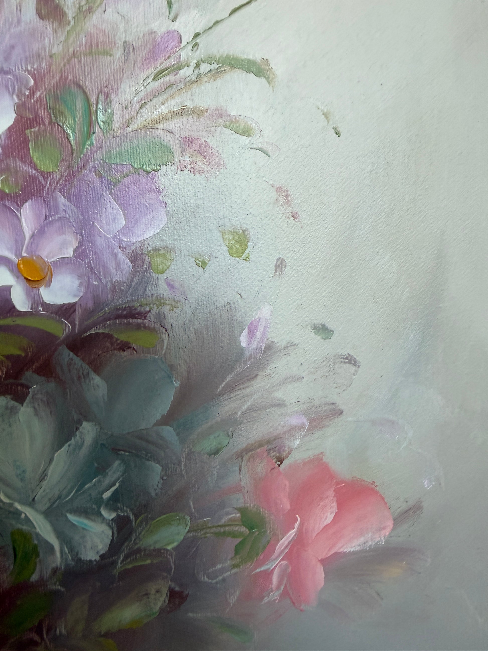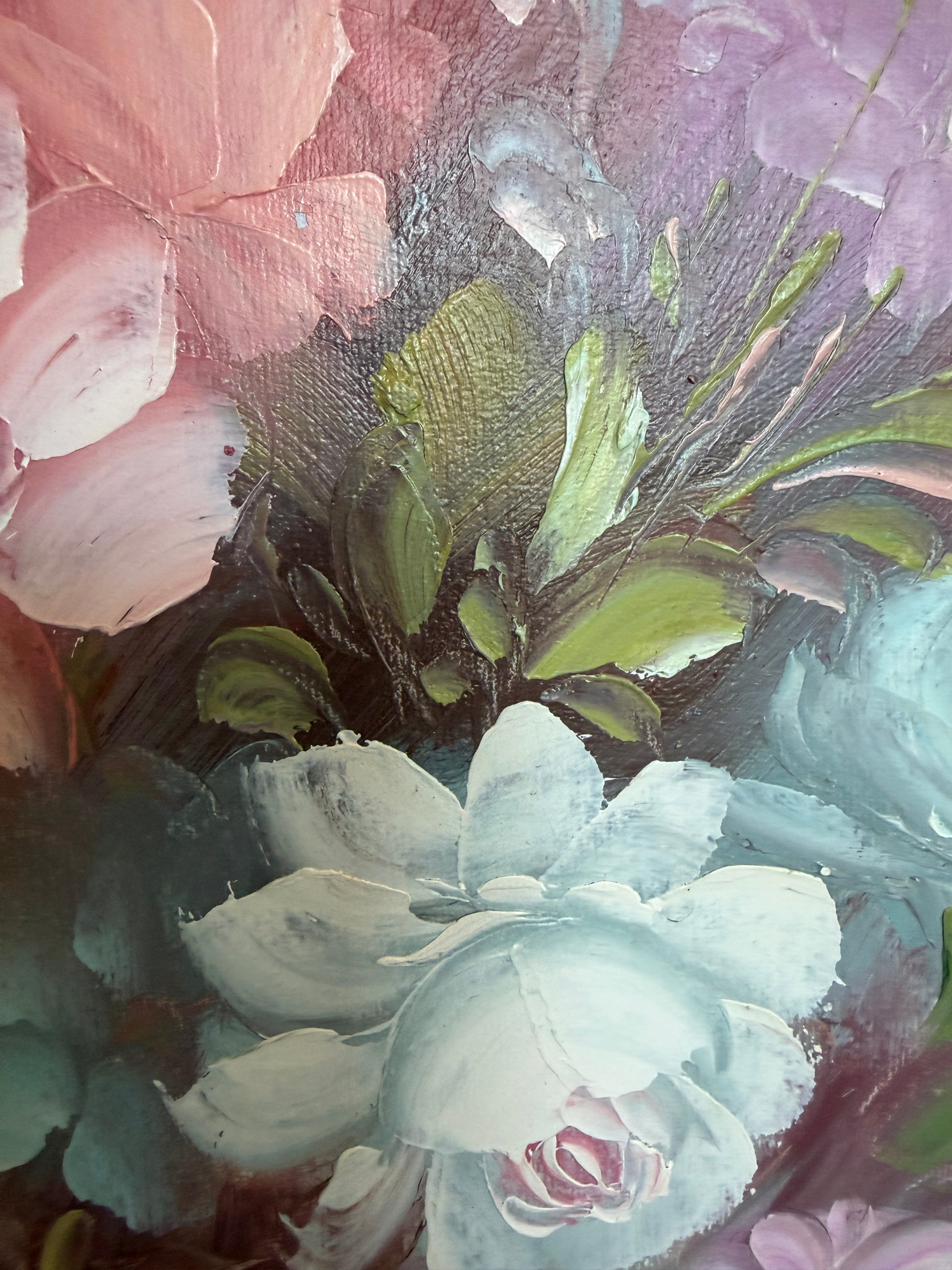 This elegant floral still life oil painting by Robert Cox (1934–2001) presents a richly arranged bouquet rendered in a refined, decorative classic style. Soft pinks, creams, blues, and lilac tones are layered with confident handling, creating depth and gentle luminosity against a muted background. The composition feels balanced and timeless, with the flowers modeled to emphasize volume and harmony, making this work ideal for classic interiors, dining spaces, bedrooms, or curated traditional décor.
