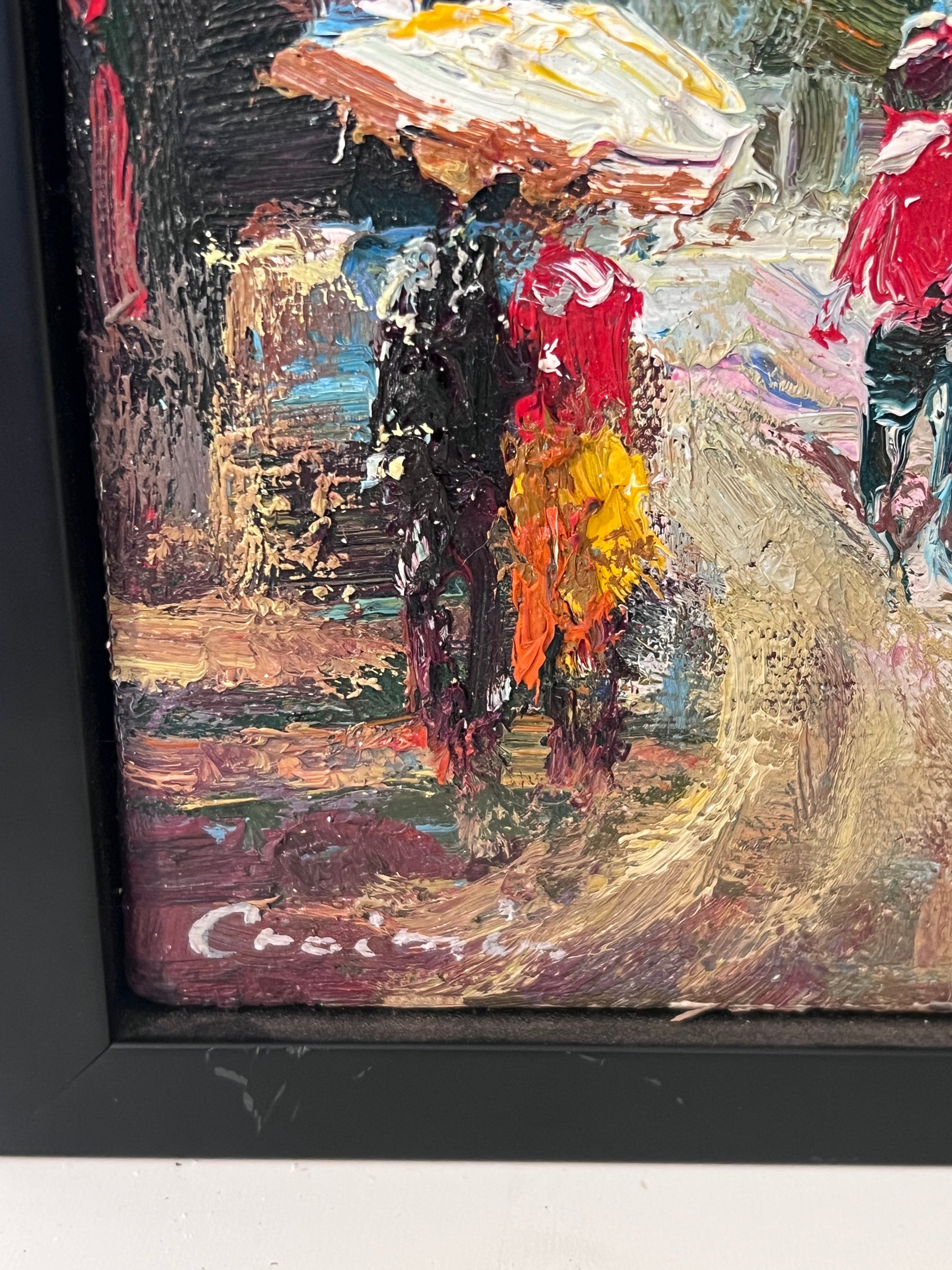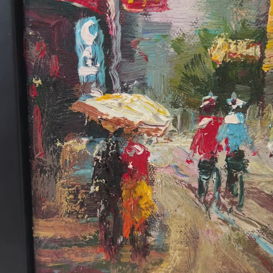 The heavy impasto technique creates a dynamic, tactile surface that enhances the realism of wet pavement, clothing folds, and architectural details. This piece brings both atmosphere and personality, making it a striking accent for any interior.