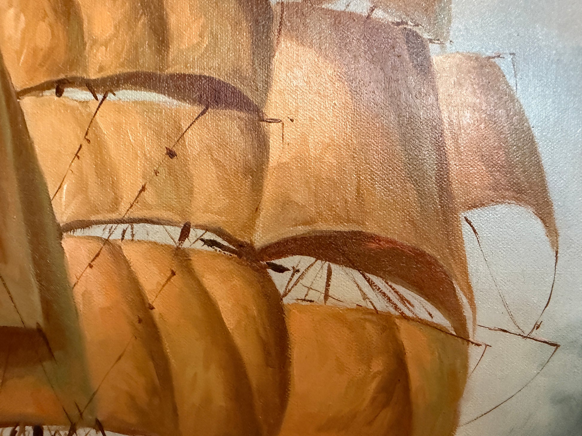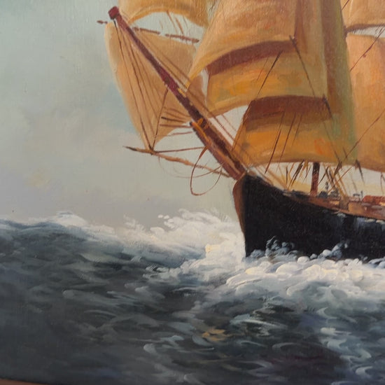 This striking surreal maritime oil painting presents a powerful visual dialogue between a majestic tall ship battling rolling seas and the haunting visage of an old sea captain emerging from mist and clouds. The composition blends realism and symbolism, evoking themes of fate, memory, and the eternal bond between man and the ocean. The ship’s golden sails glow against the stormy blue-gray waters, while the captain’s weathered face, pipe in hand, appears almost mythic, as if he embodies the spirit guiding the vessel through uncertainty. The artist’s controlled brushwork and atmospheric layering create depth, movement, and emotional gravity, making this piece both dramatic and contemplative.