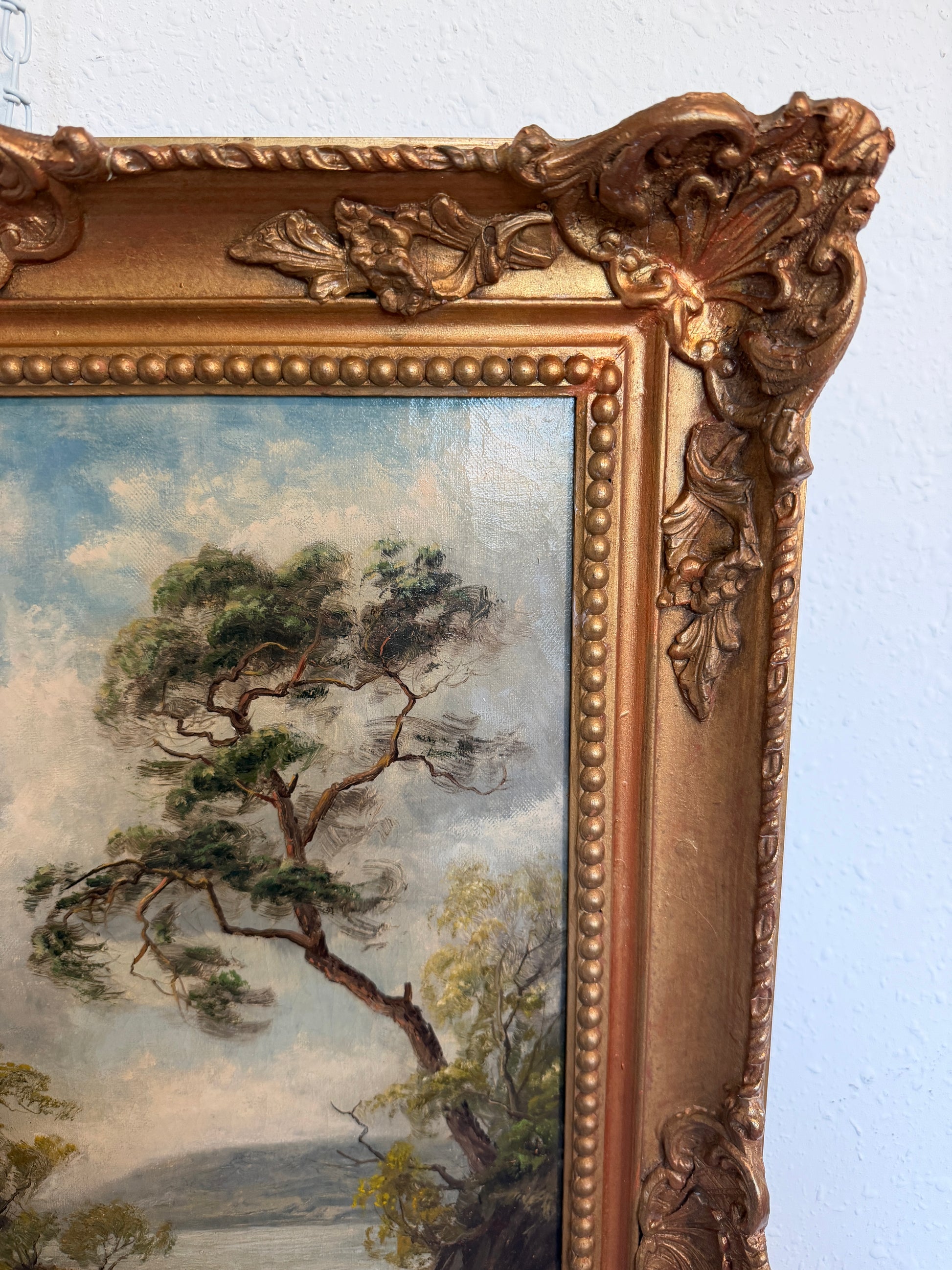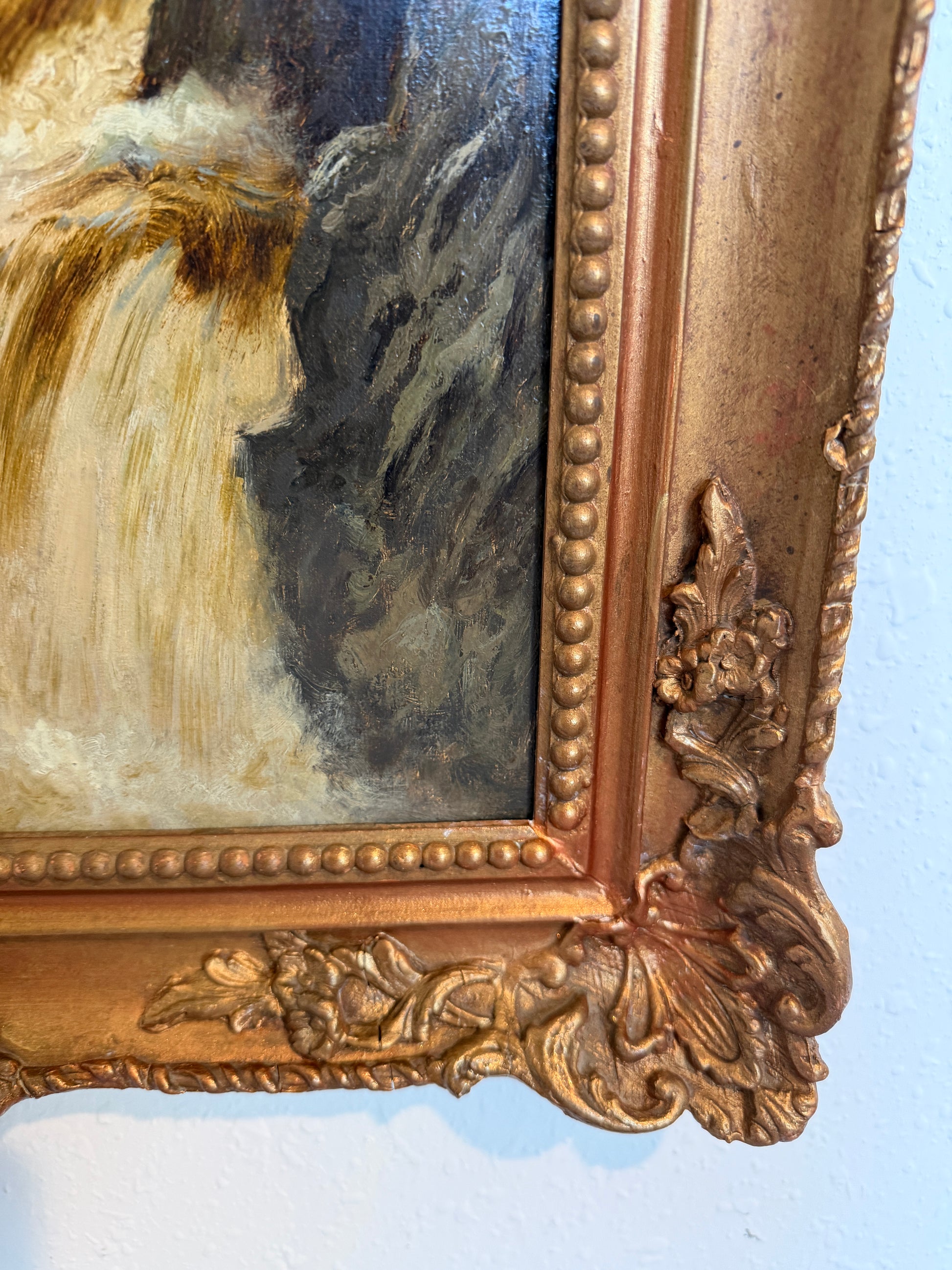 Frame: Ornate gilt frame shows wear: rubbed high points, small scuffs, and typical vintage patina.