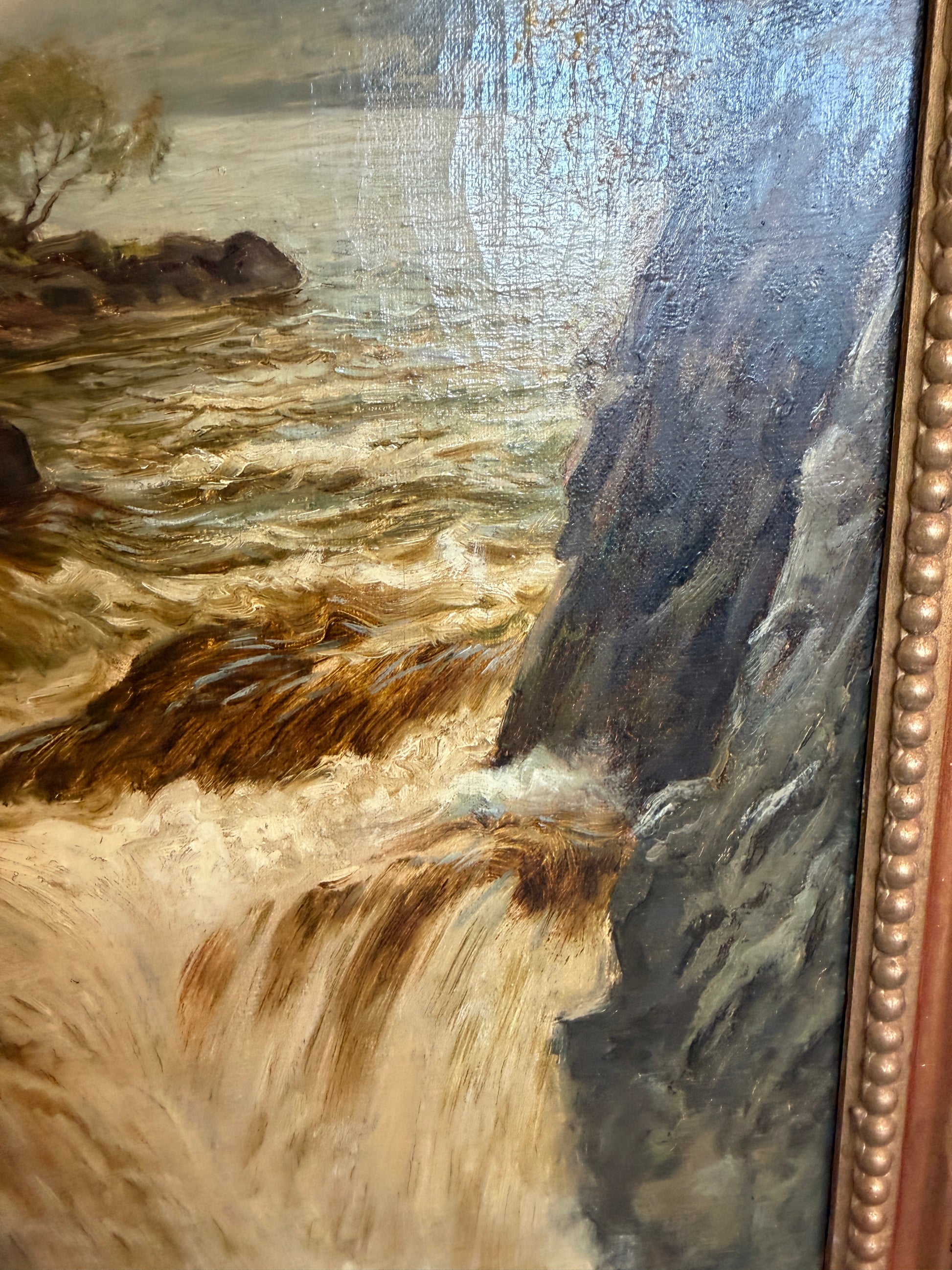 A striking Victorian-era landscape by British Artist Tom Seymour, capturing a dramatic waterfall rushing through rocky banks into a calm loch beyond. The composition leads the eye from the foaming, fast-moving water in the foreground into misty distance, with wind-shaped trees clinging to the cliffs. The palette leans earthy and atmospheric, with soft light breaking through clouds and reflecting on the water’s surface, giving the scene a classic Highland mood.