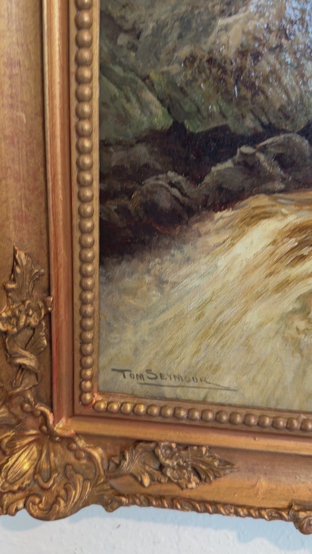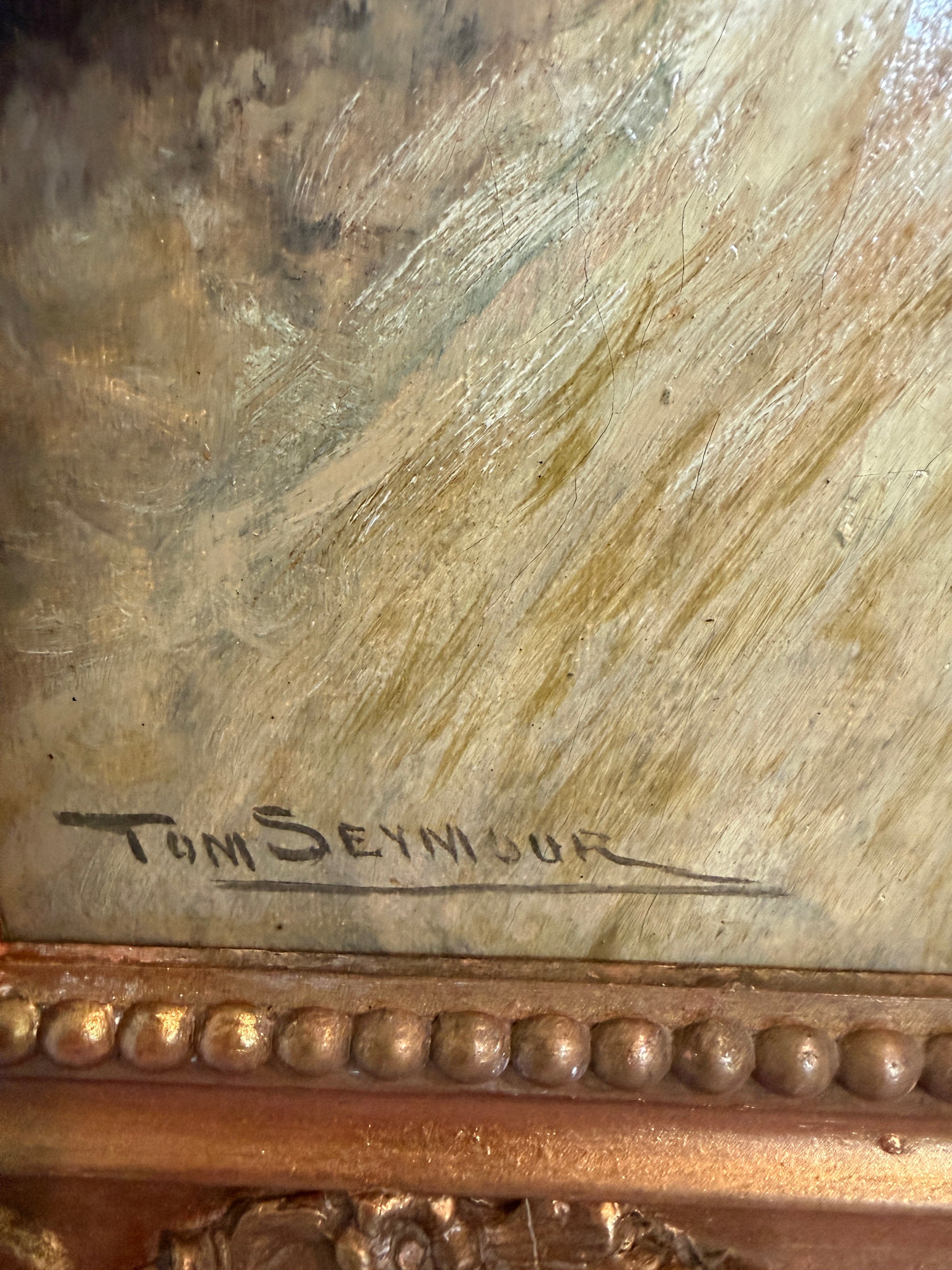 📏 Measurements / Medium / Presentation: Oil on canvas. Signed “Tom Seymour” at the lower left. Presented in an ornate gilt frame with beaded liner.