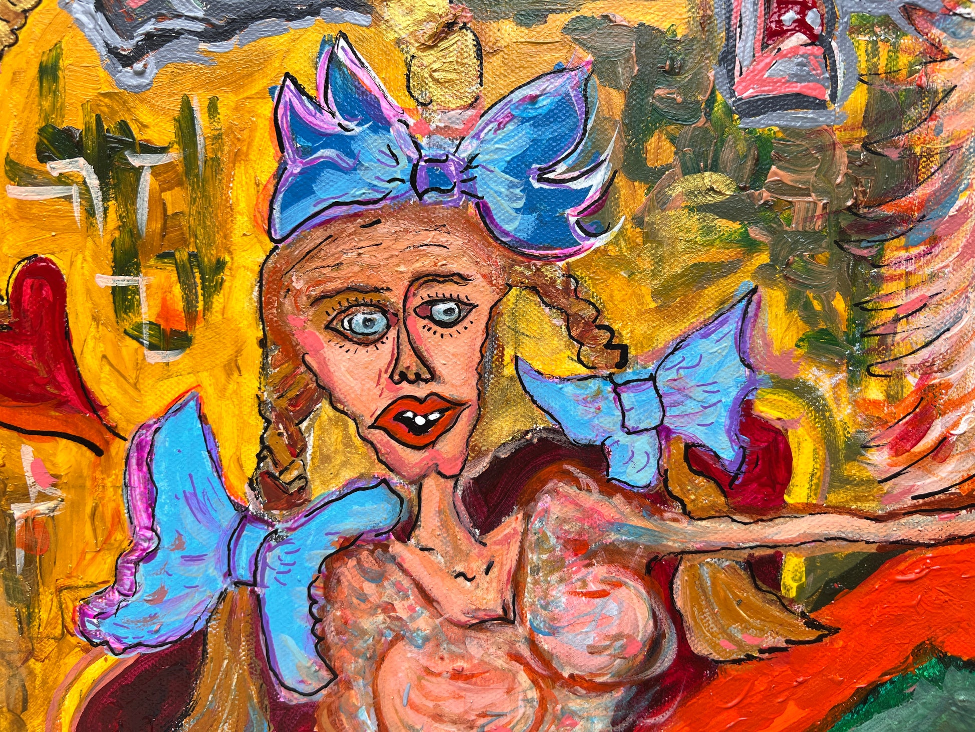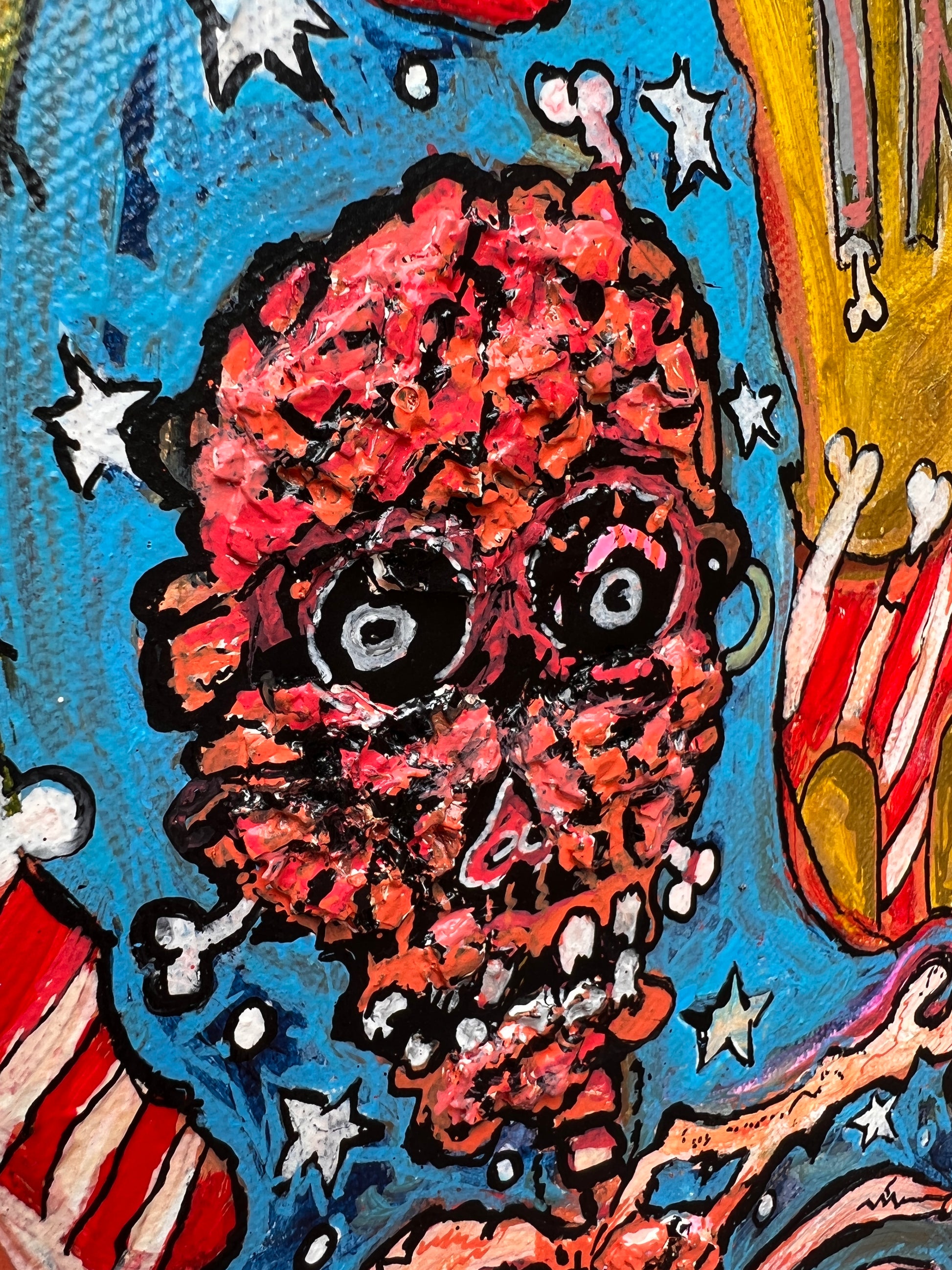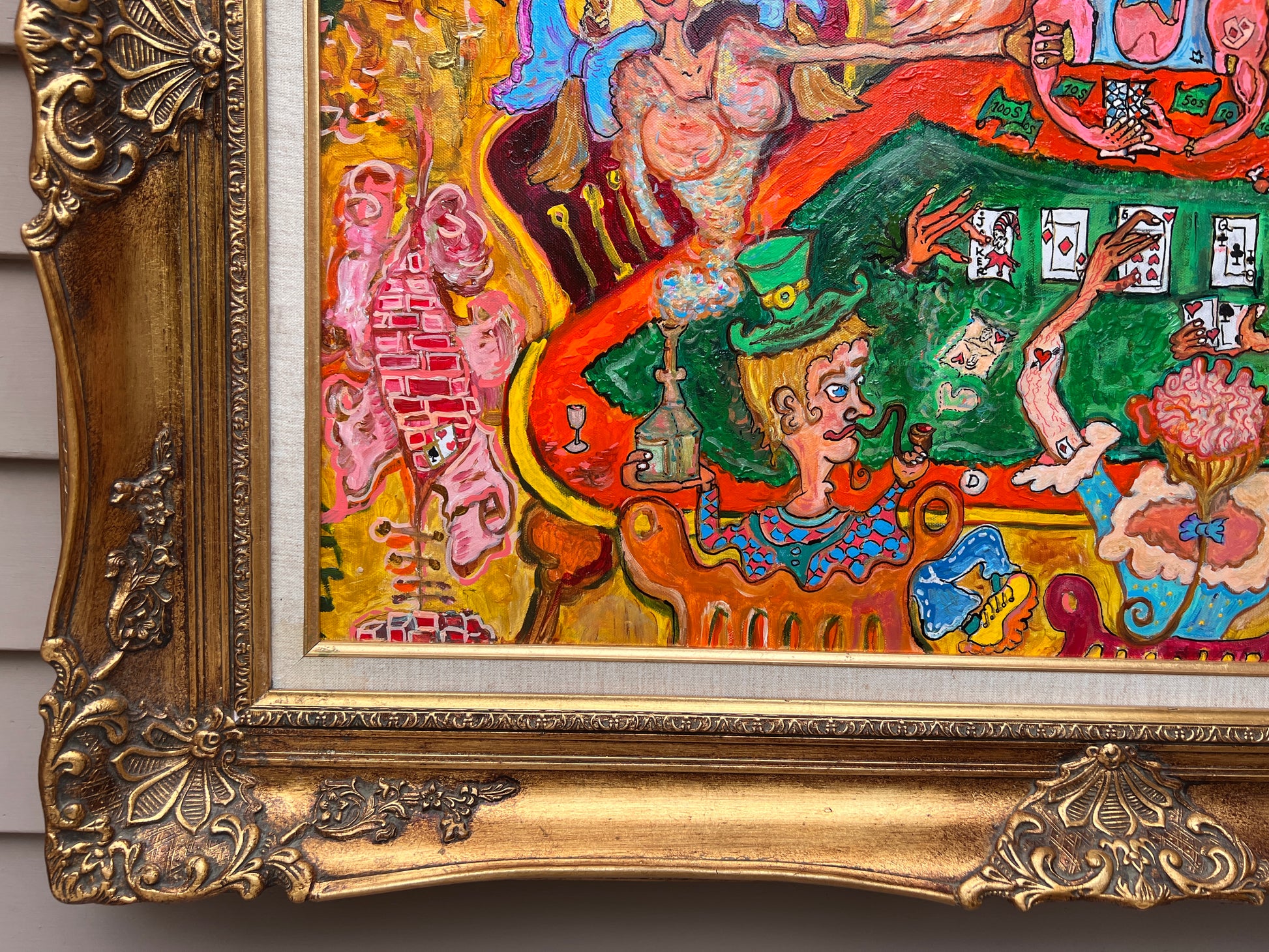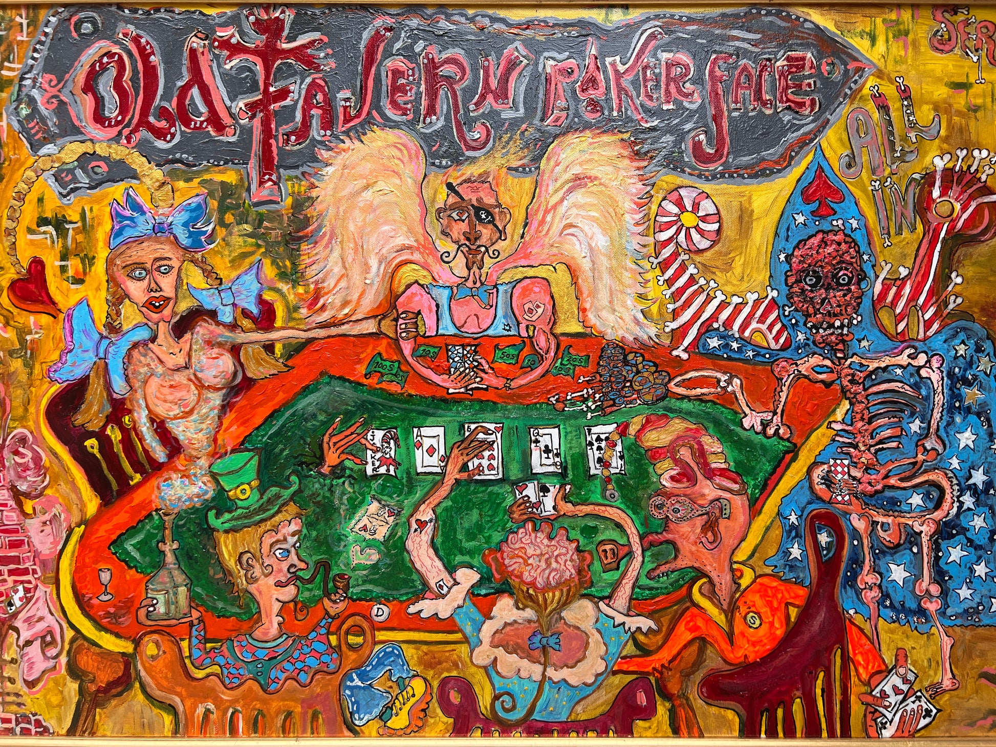 This is a rare, unique, original large acrylic/oil painting on canvas in a naive primitivism style depicting a group of fantasy characters gathered around a poker table.