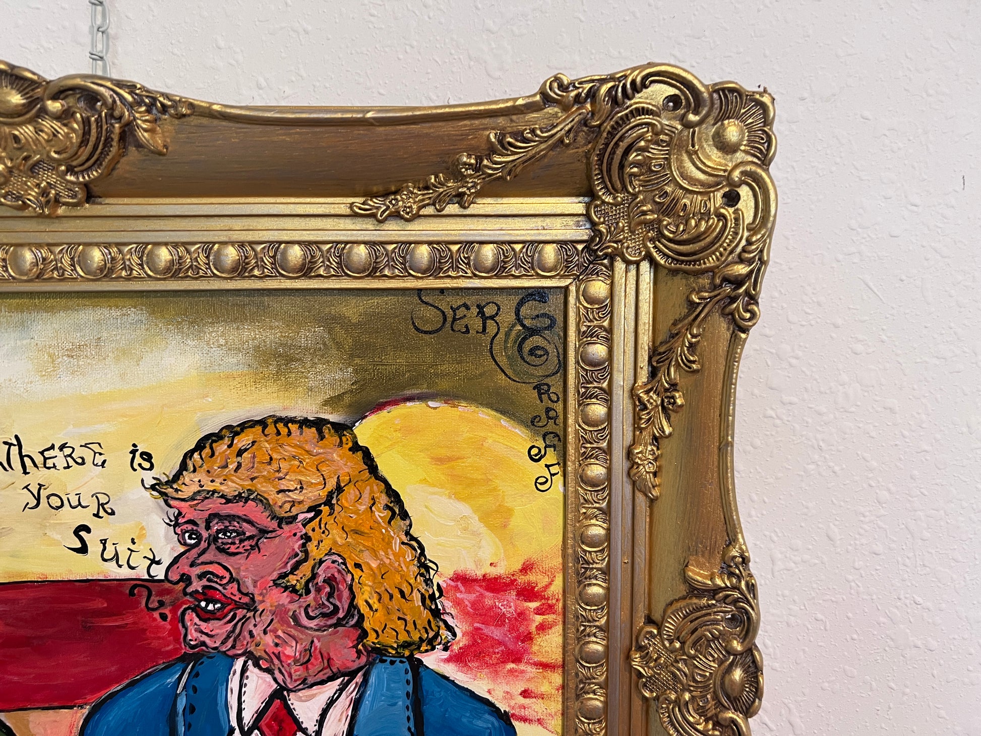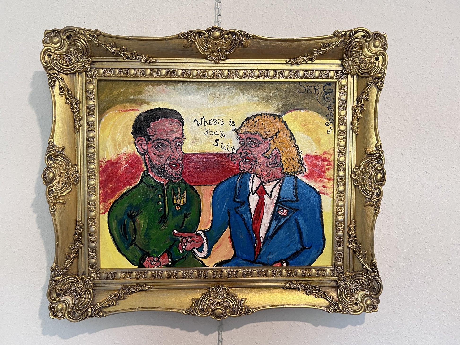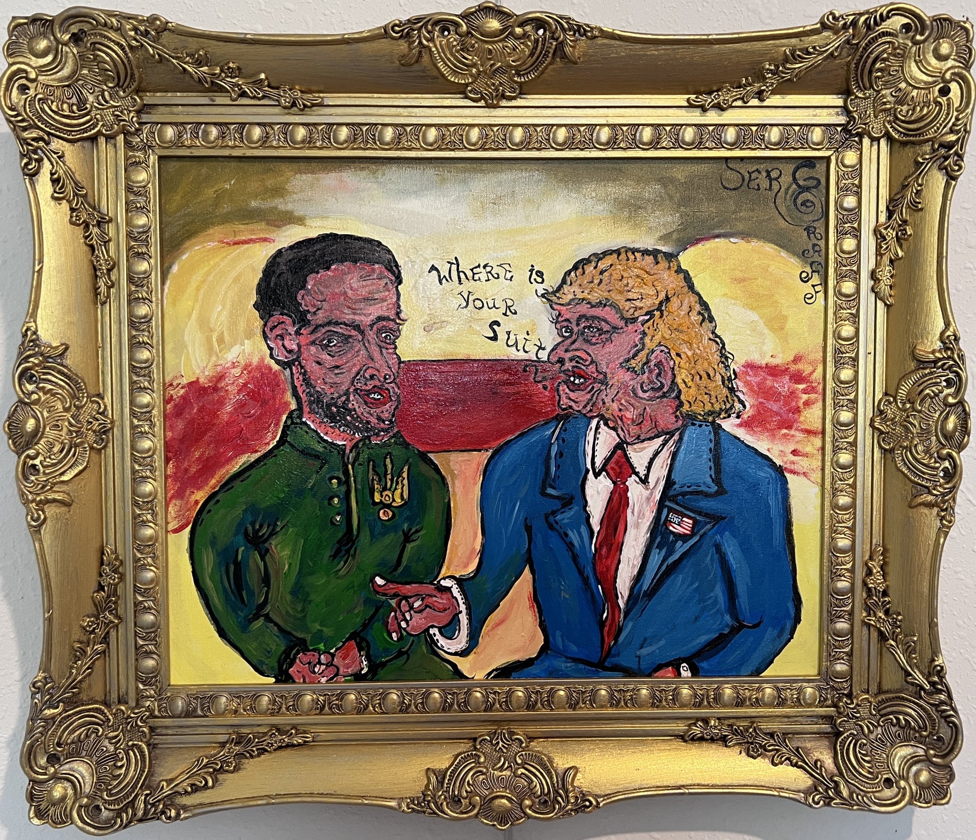 The background is alive with intense reds and yellows, symbolizing conflict, tension, and heated exchange. The contrast between the ornate gold frame and the painting’s bold, crude expression gives the work an ironic, provocative edge. In the upper right corner, the signature “SerG” confirms the artist’s hand. Through humor and confrontation, Graff captures the surreal quality of wartime diplomacy and public image.