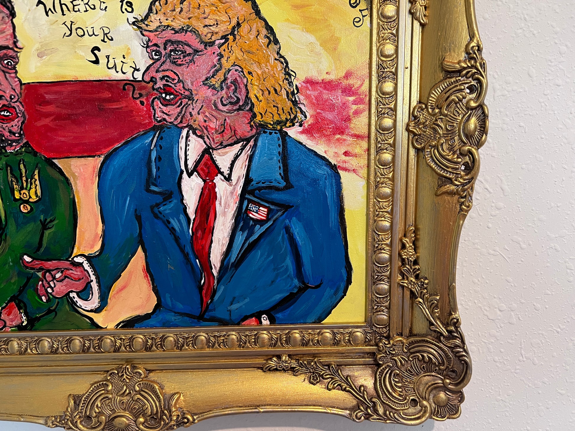 This satirical and expressive artwork portrays a charged diplomatic moment between two instantly recognizable figures. On the right, a man with exaggerated features unmistakably resembling Donald Trump is depicted with distinctive yellowish hair and a dark suit adorned with an American flag pin. His hand is raised in a gesture of accusation or inquiry, accompanied by hand‑painted text asking: “Where is your suit?”