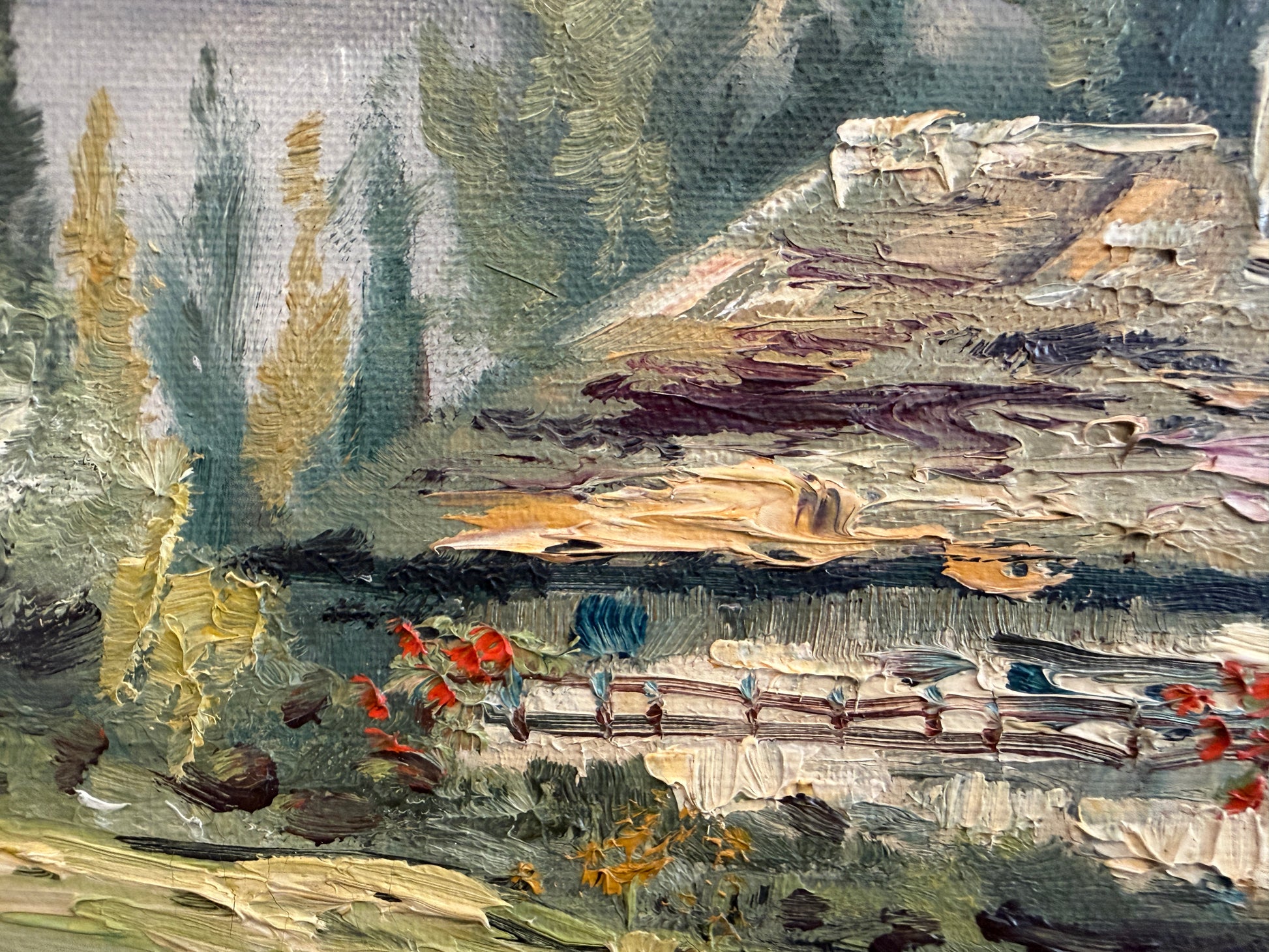 Good vintage condition. The canvas appears stable and well-stretched, with visible brush texture and light, age-appropriate surface wear. Minor craquelure and patina are present, consistent with age and medium. No visible tears or repairs are observed. The frame shows minor noticeable wear.