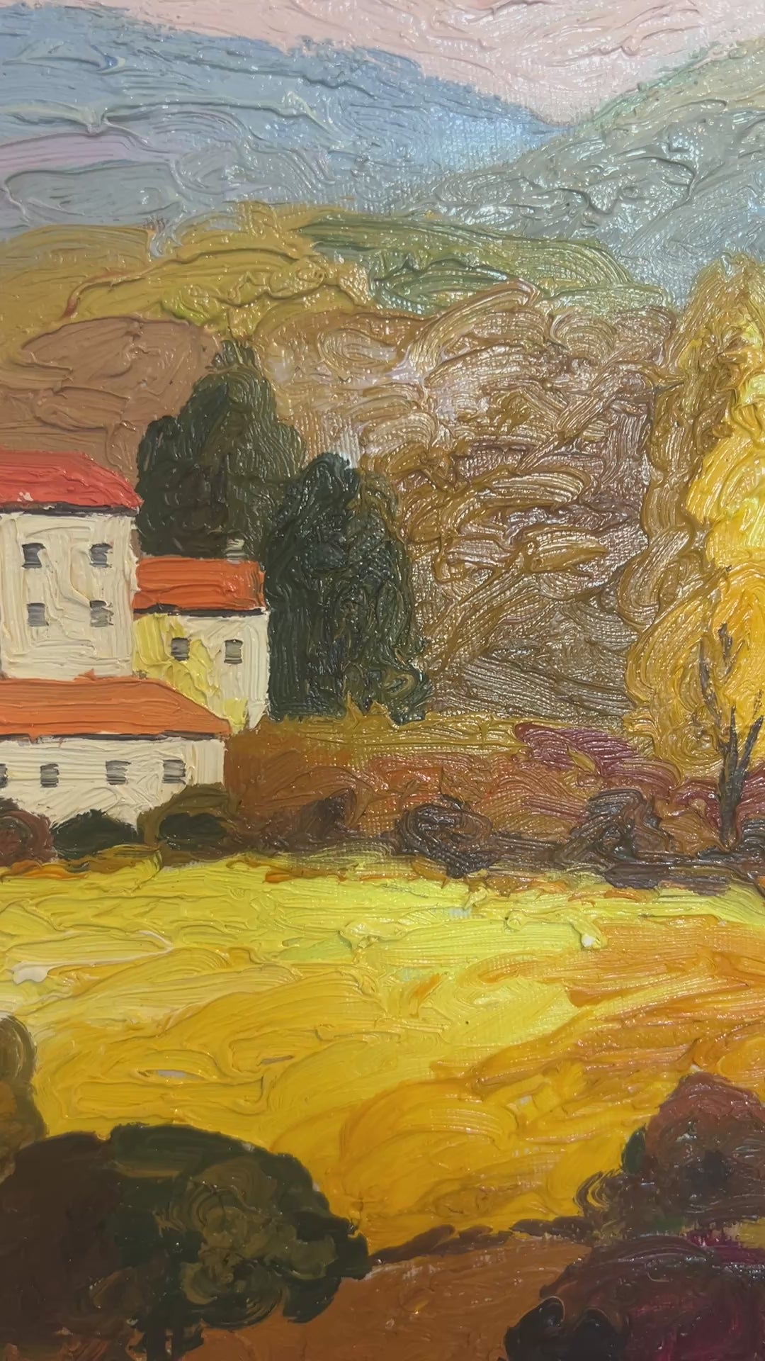 This beautiful vintage oil on canvas landscape captures a warm, pastoral view of the European countryside bathed in soft autumn light. A cluster of whitewashed villas with red-tiled roofs sits peacefully amid rolling fields and cypress trees, leading the viewer’s eye toward the misty mountains and layered pastel sky in the distance.