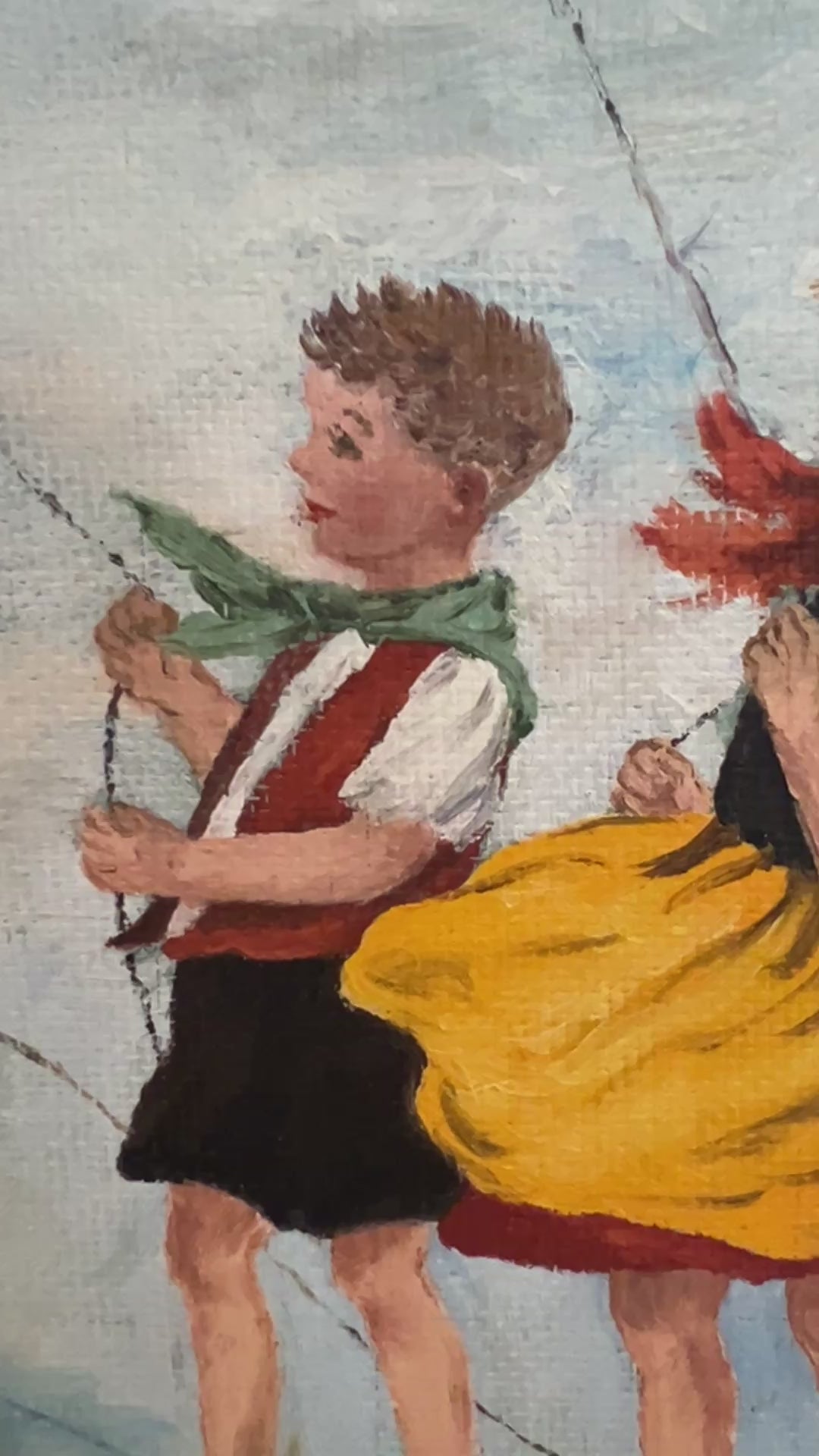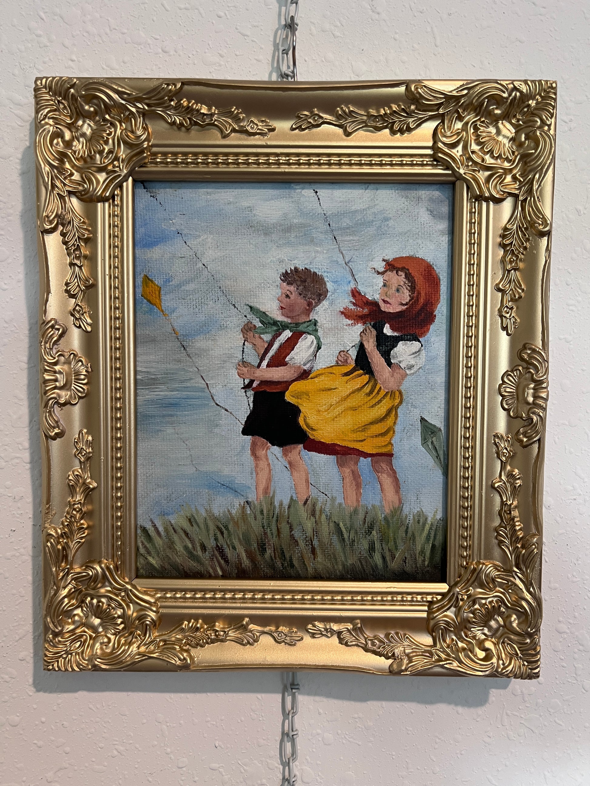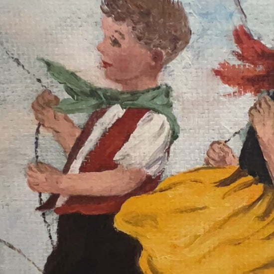 This charming vintage folk art painting captures a joyful scene of two children flying kites on a breezy afternoon. The boy, dressed in suspenders, and the girl, in a yellow skirt and red headscarf, stand in a grassy field as the wind lifts their kites high against a soft, pastel sky. The artist’s expressive brushwork and bright, playful palette convey innocence, nostalgia, and the carefree spirit of youth.
