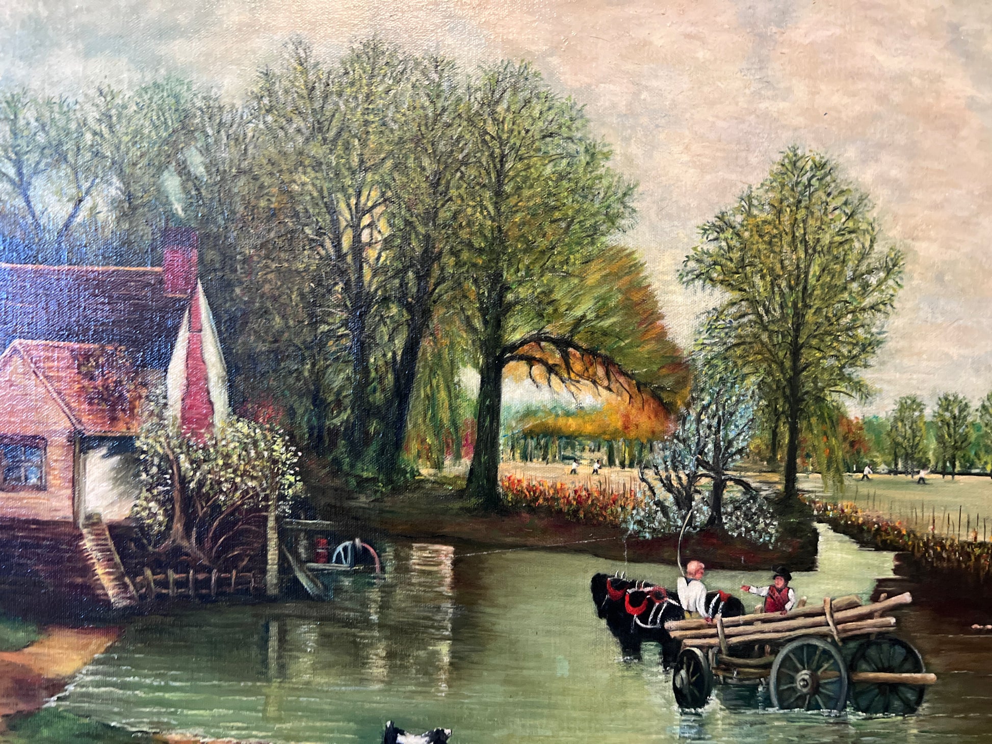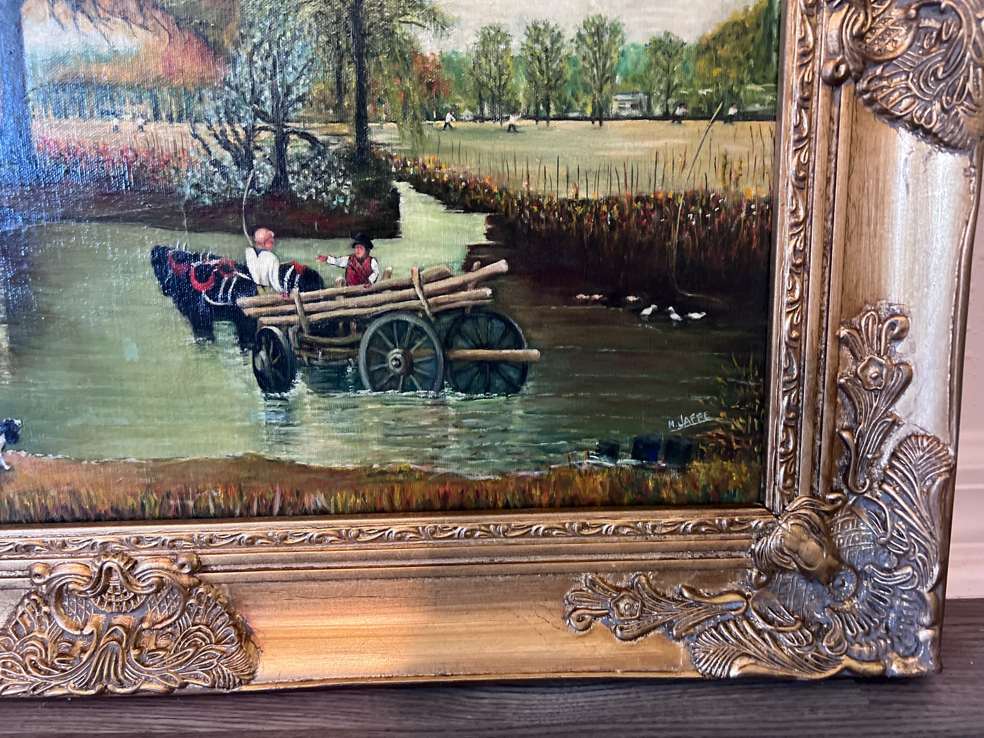 Charming vintage oil painting on canvas signed M. Jaffe, depicting a tranquil countryside scene with a riverside cottage, horse-drawn cart crossing shallow waters, and figures engaged in rustic daily life. The composition evokes warmth and nostalgia, reminiscent of 19th-century English pastoral art.