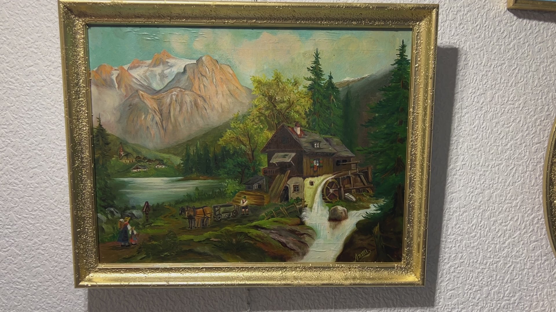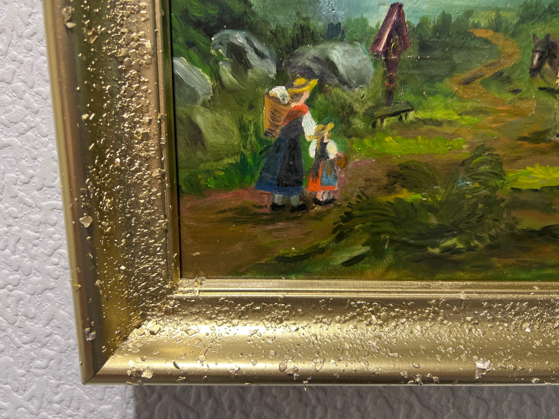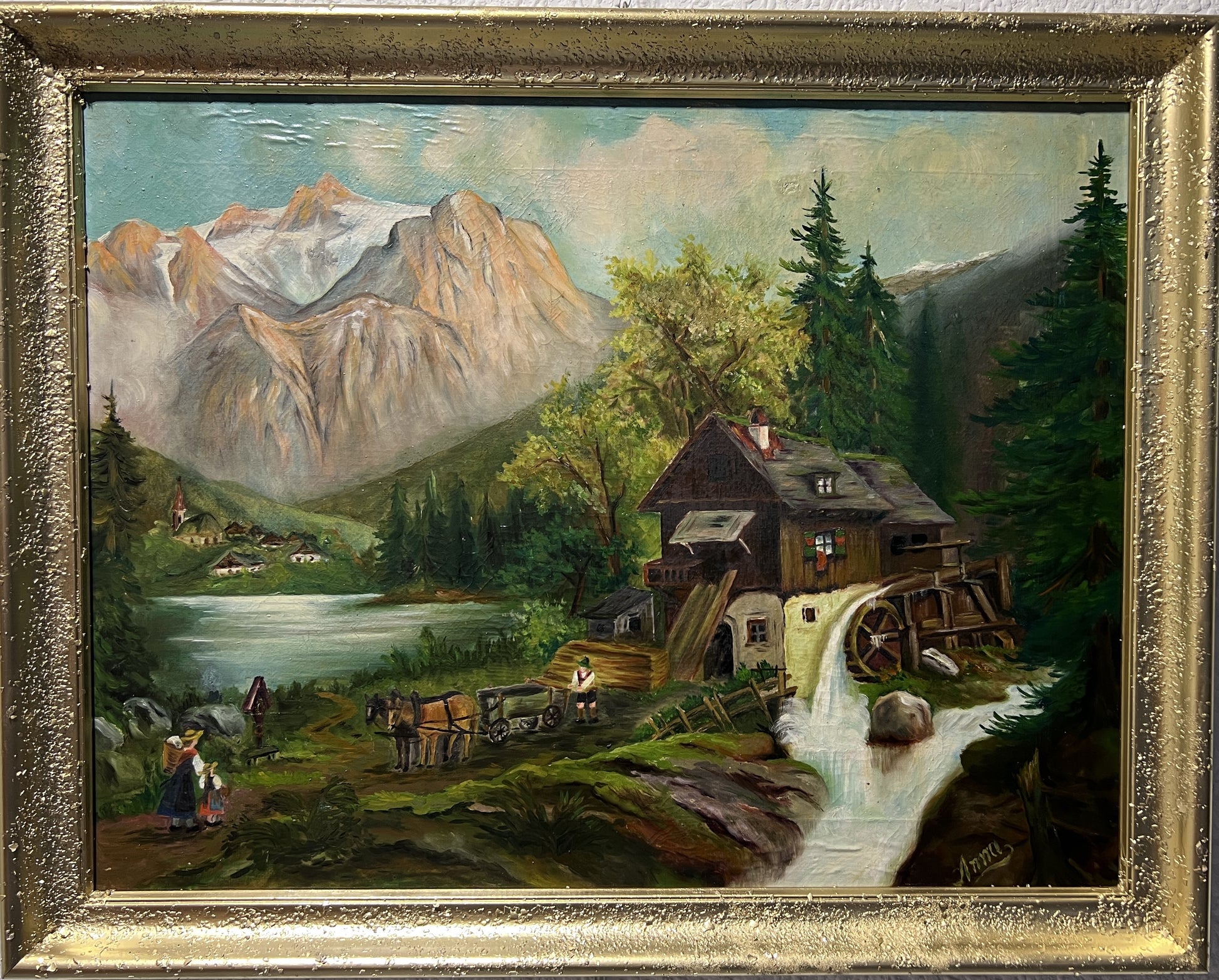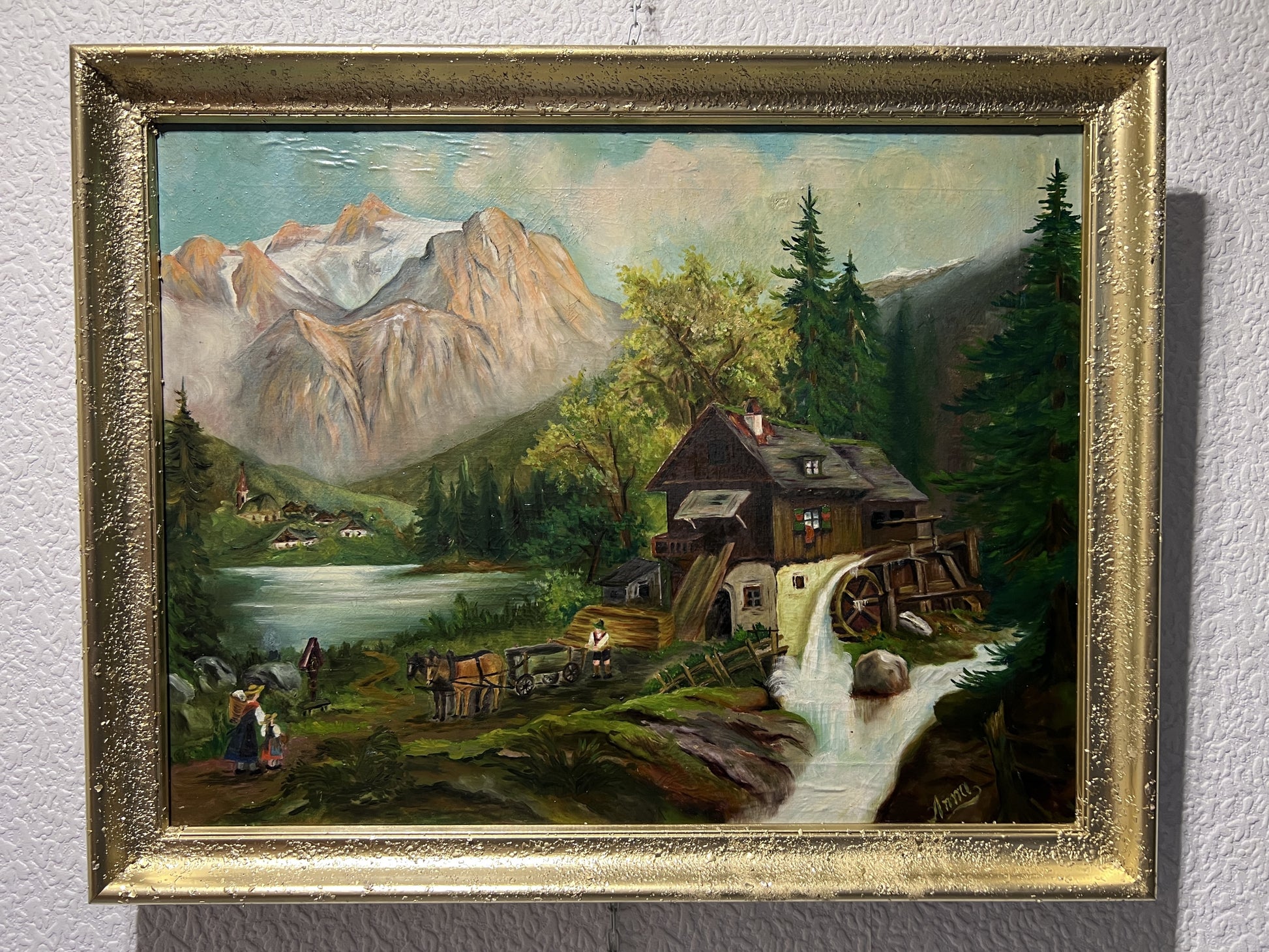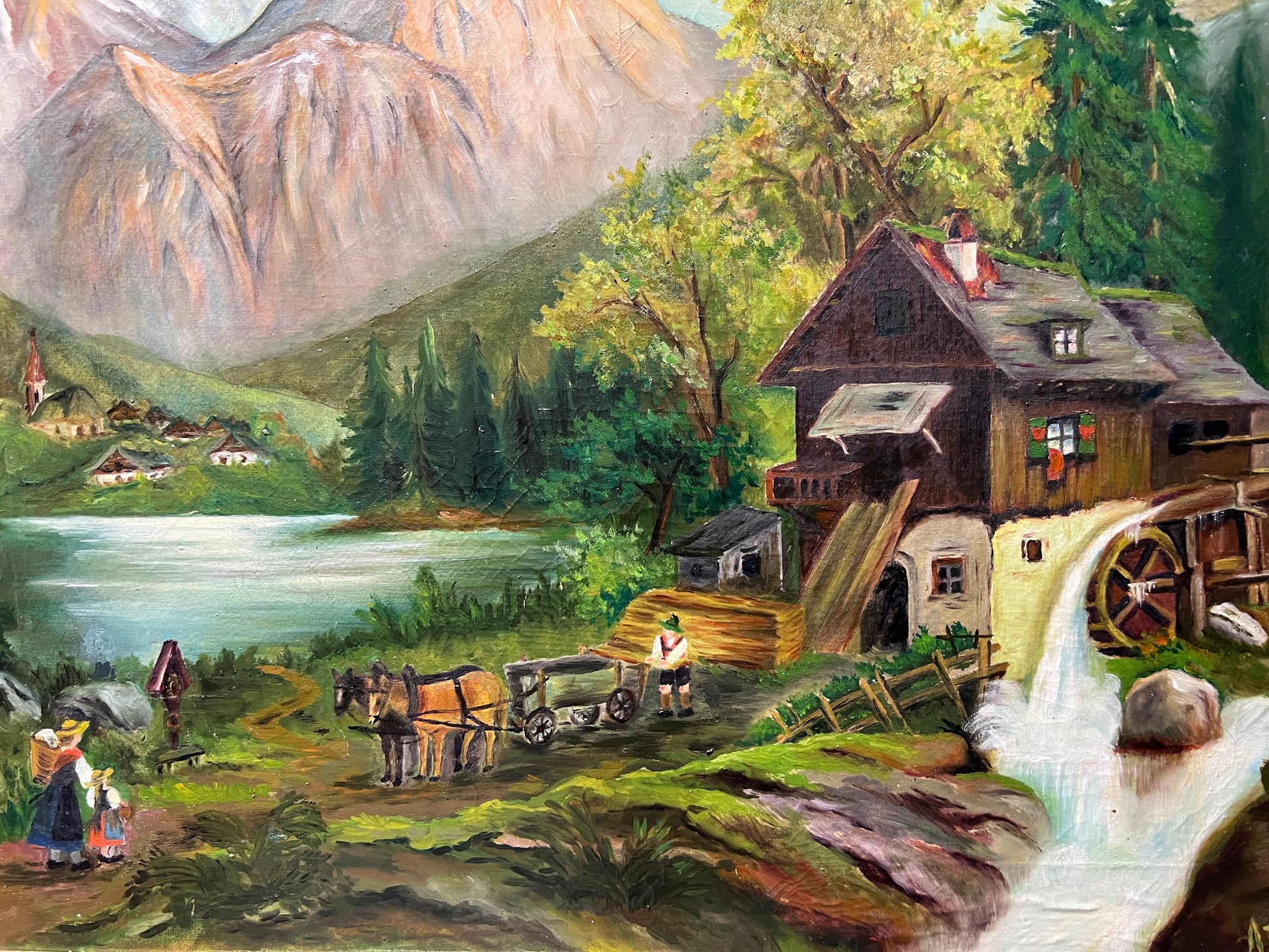 This is an original vintage oil painting on canvas depicting a picturesque rural landscape. In the foreground, a charming rustic watermill stands beside a gently flowing stream, complete with a turning water wheel that adds dynamic energy to the peaceful setting. A winding path leads away from the mill, passing figures in period clothing engaged in their daily routines—bringing the pastoral scene to life.