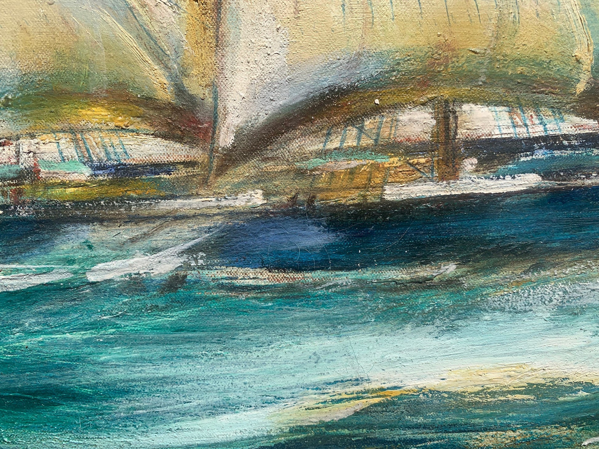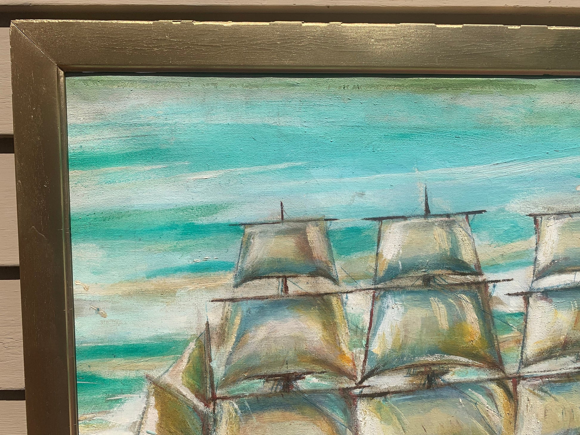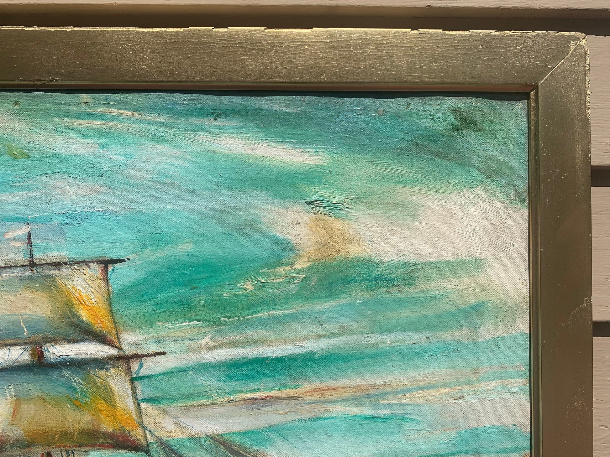 Vintage Oil painting on canvas, seascape, Sailing ship, Unsigned, Framed
