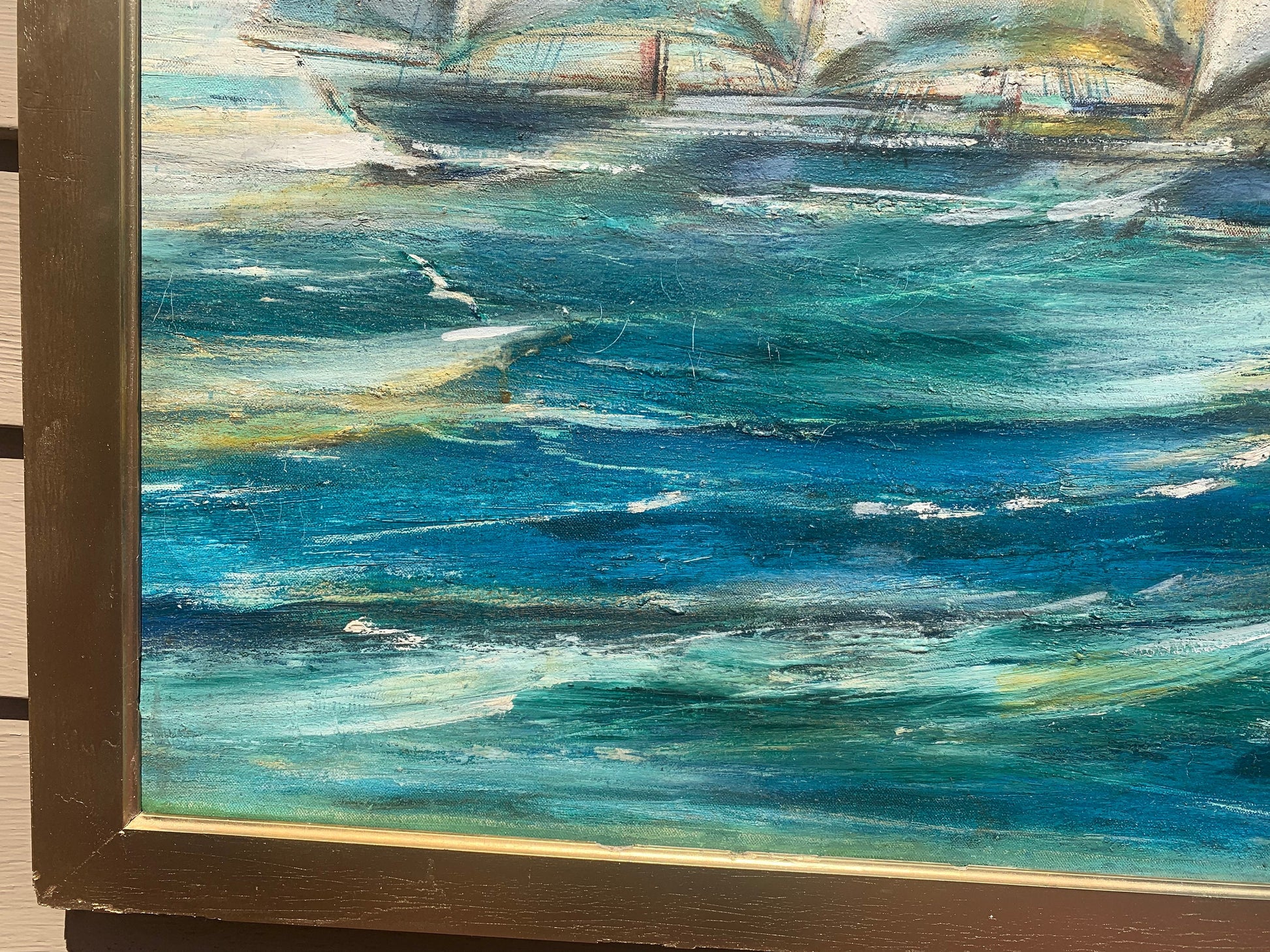 The painting is presented in a classic wooden frame, which has been professionally repainted, complementing the maritime subject.