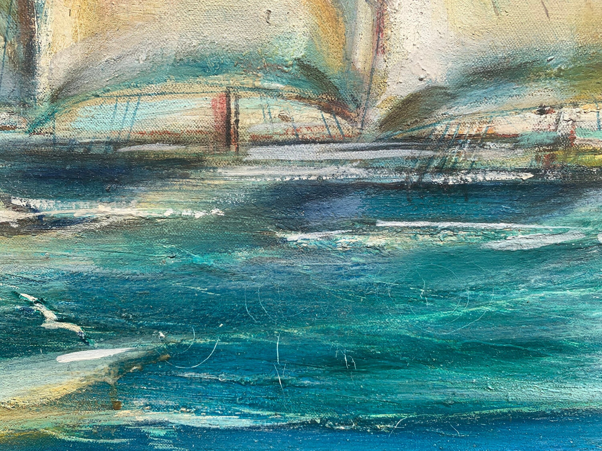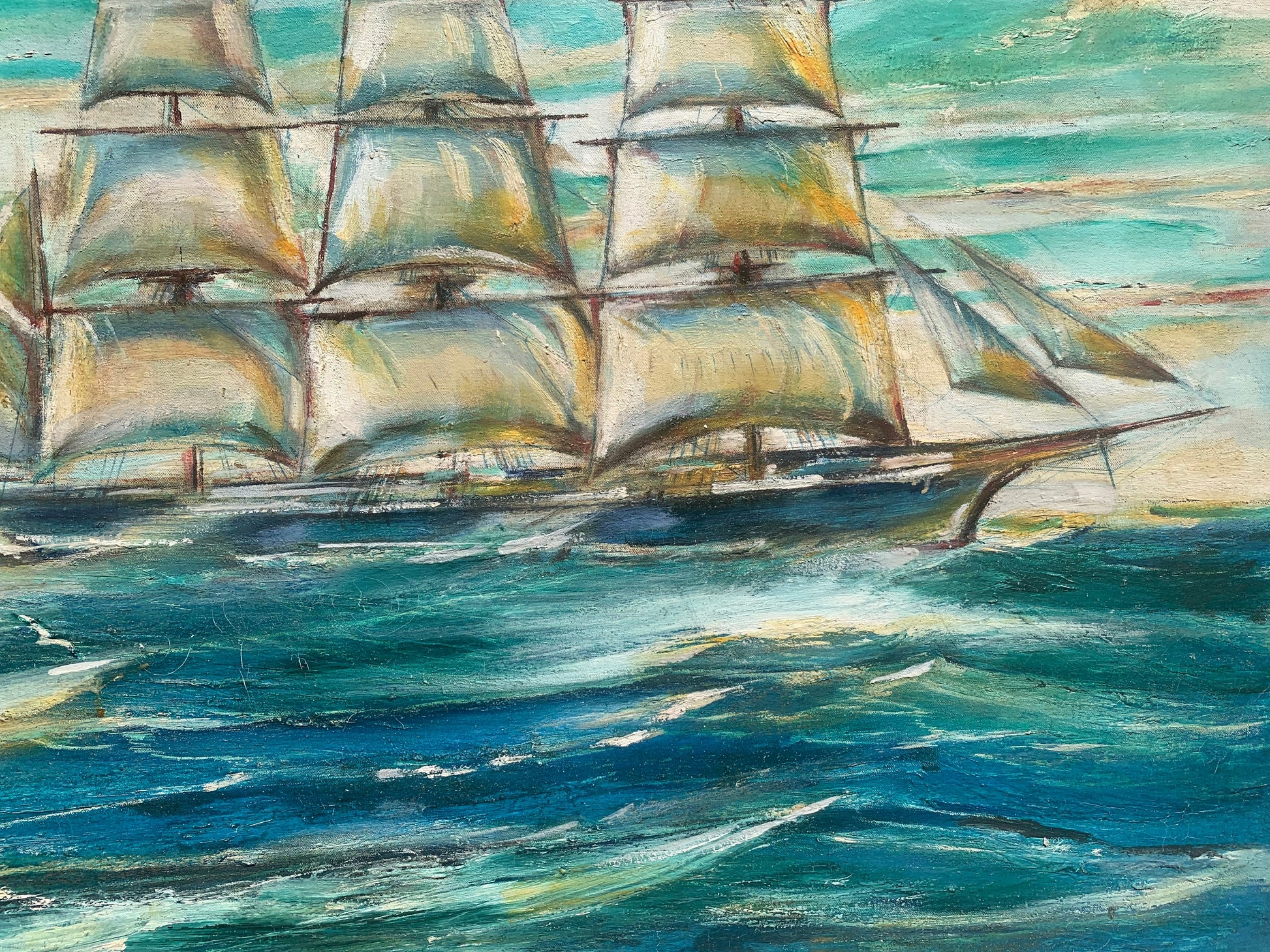 This is an original signed vintage oil painting on canvas, featuring a majestic sailing ship on the high seas. The scene is beautifully executed with rich textured brushwork and deep blue tones, capturing both the motion and serenity of the open ocean.