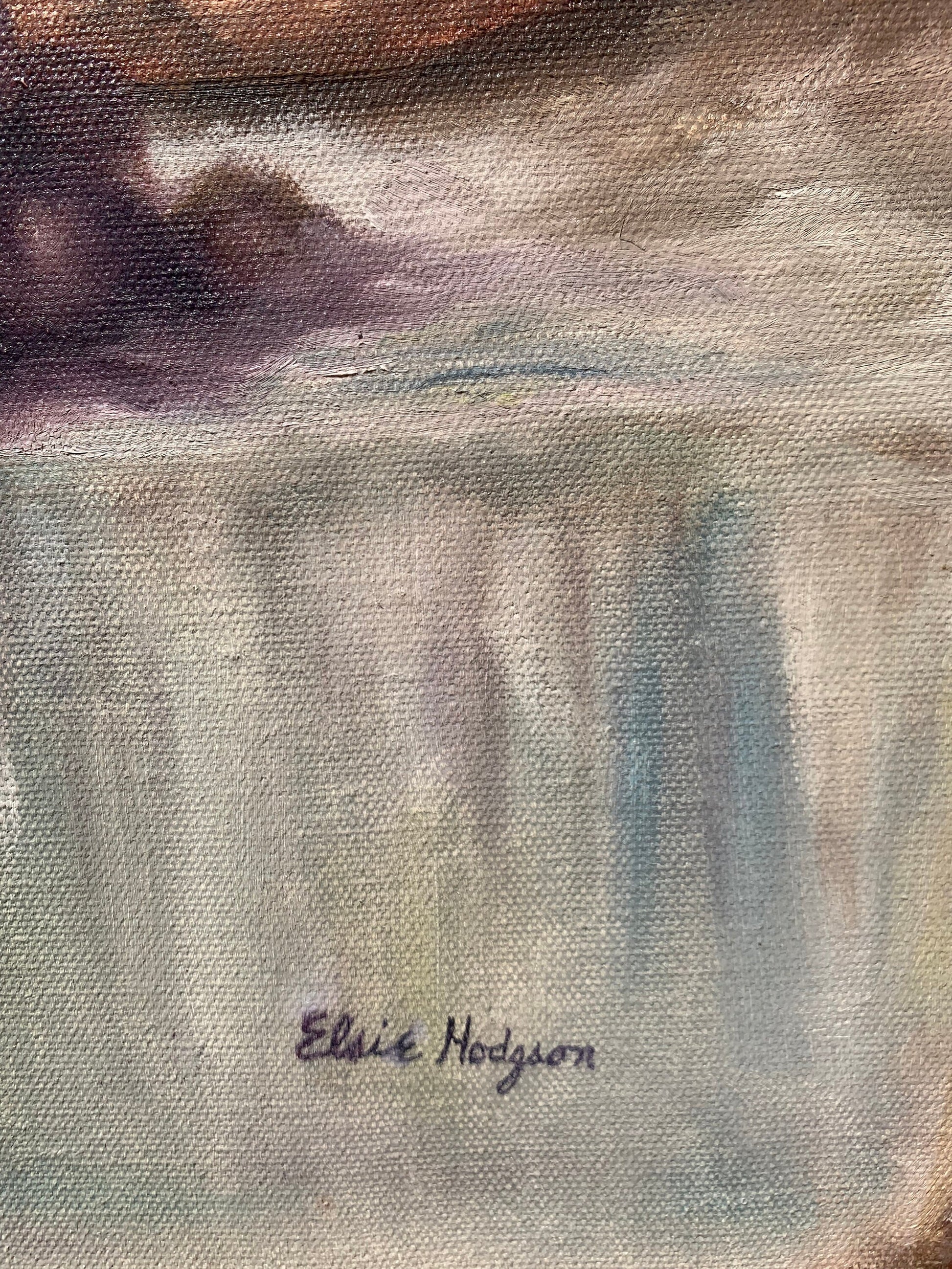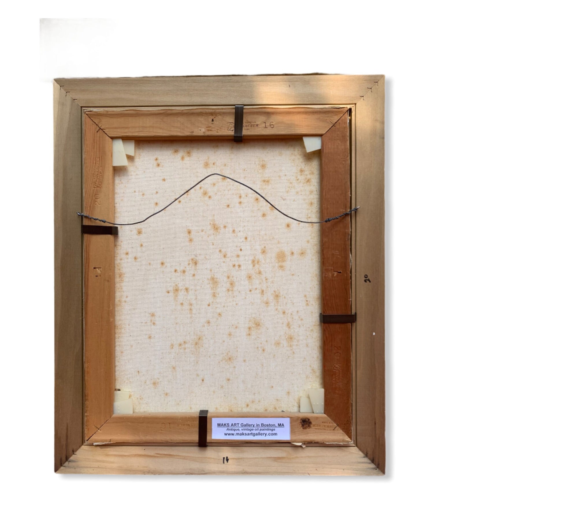 The painting is signed in the lower right corner and comes in a gold frame with a linen liner, enhancing the vintage charm. Overall, this is a medium-sized, tasteful composition that adds character and color to any traditional or farmhouse interior.