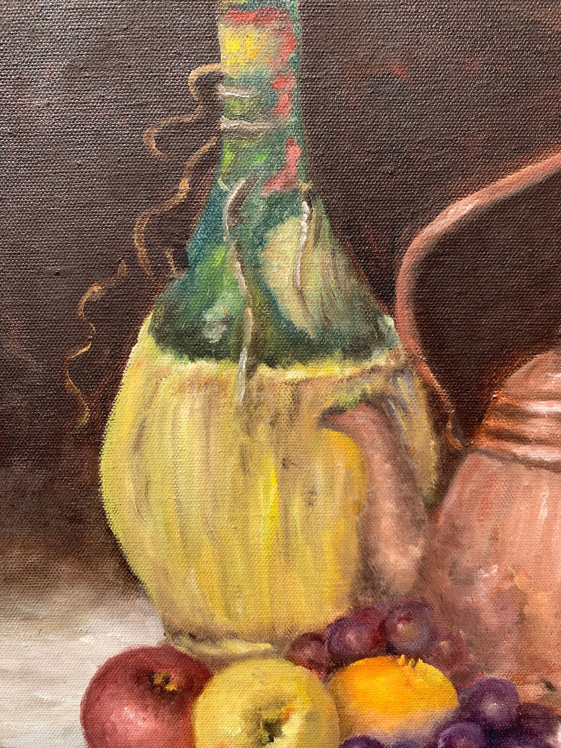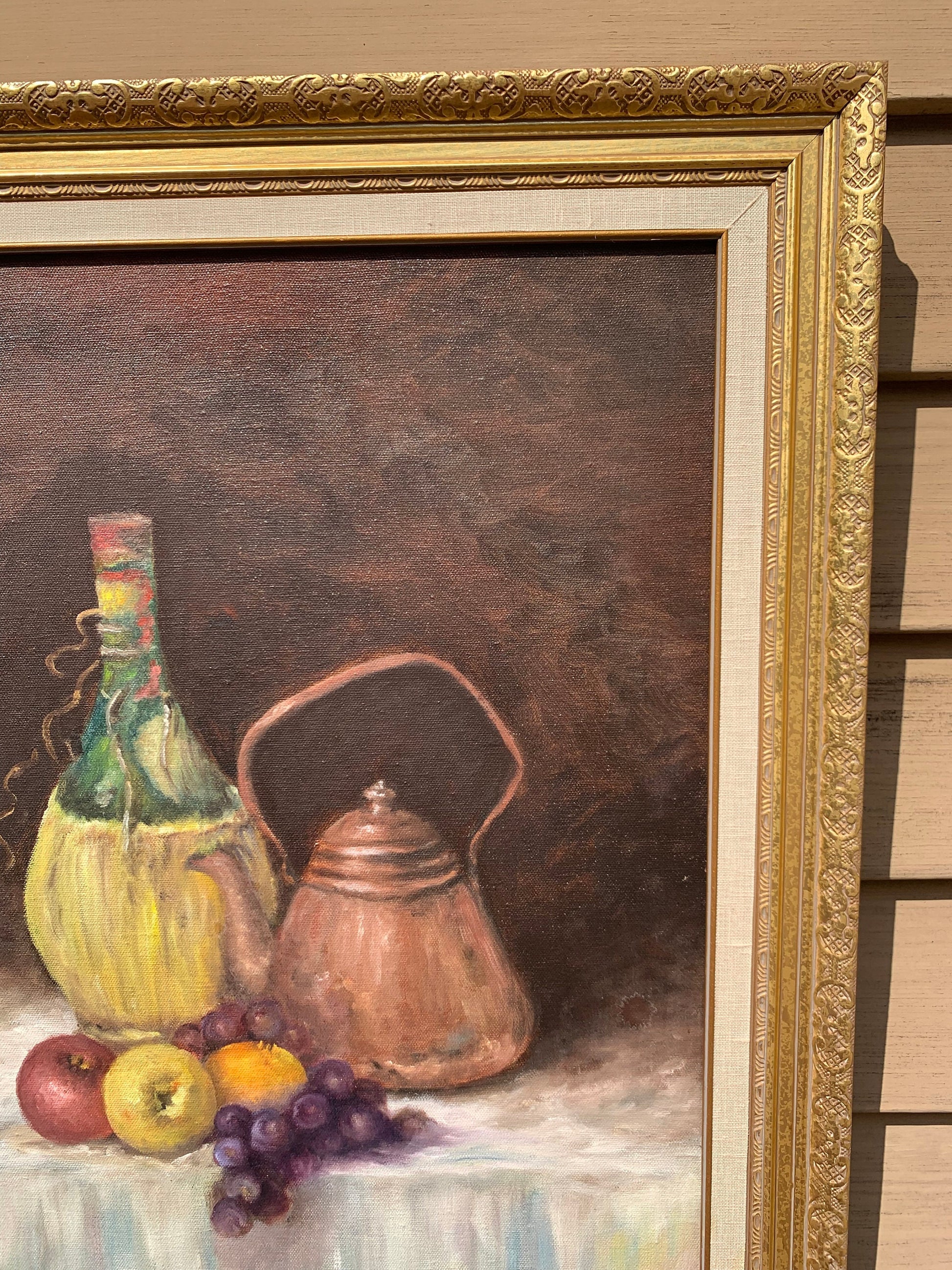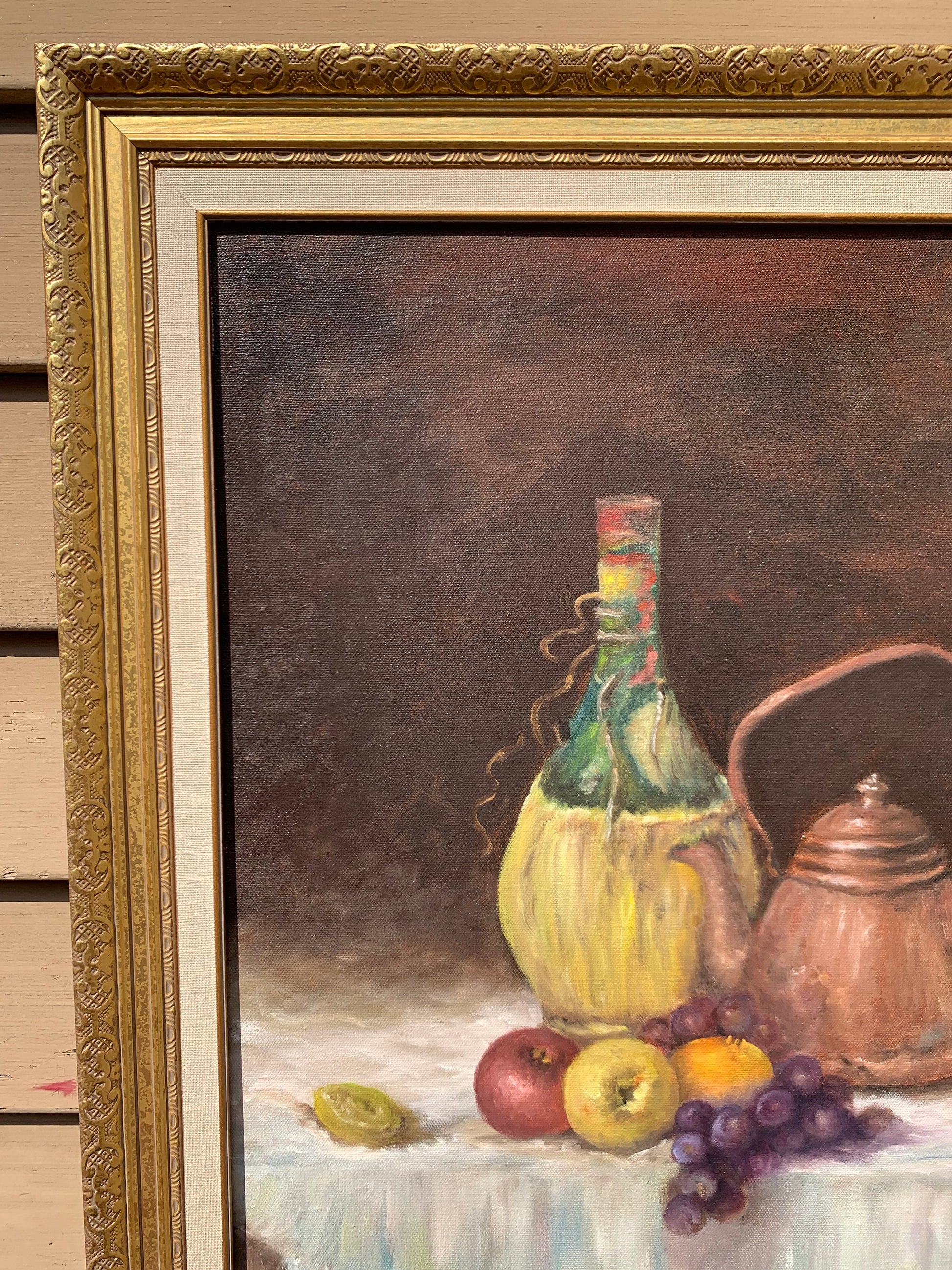 Up for sale is a vintage original oil painting on canvas depicting a beautifully balanced still life composition. The artwork features a rustic yellow bottle, a classic metal kettle, and an assortment of ripe fruits arranged on a draped table. The artist’s technique showcases warm tones, soft shadows, and inviting textures, creating a cozy and elegant atmosphere ideal for a formal dining room, kitchen nook, or breakfast space.