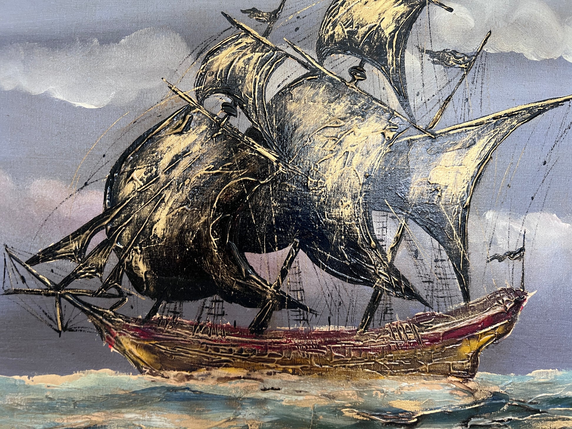 This is a striking vintage oil painting on canvas, signed by artist Zizza, featuring a dramatic seascape with a tall ship navigating turbulent waters under a stormy sky. The rich impasto technique brings depth and motion to the waves and sails, capturing the dynamic energy of the scene. The composition is both expressive and textured, with a romantic maritime mood.