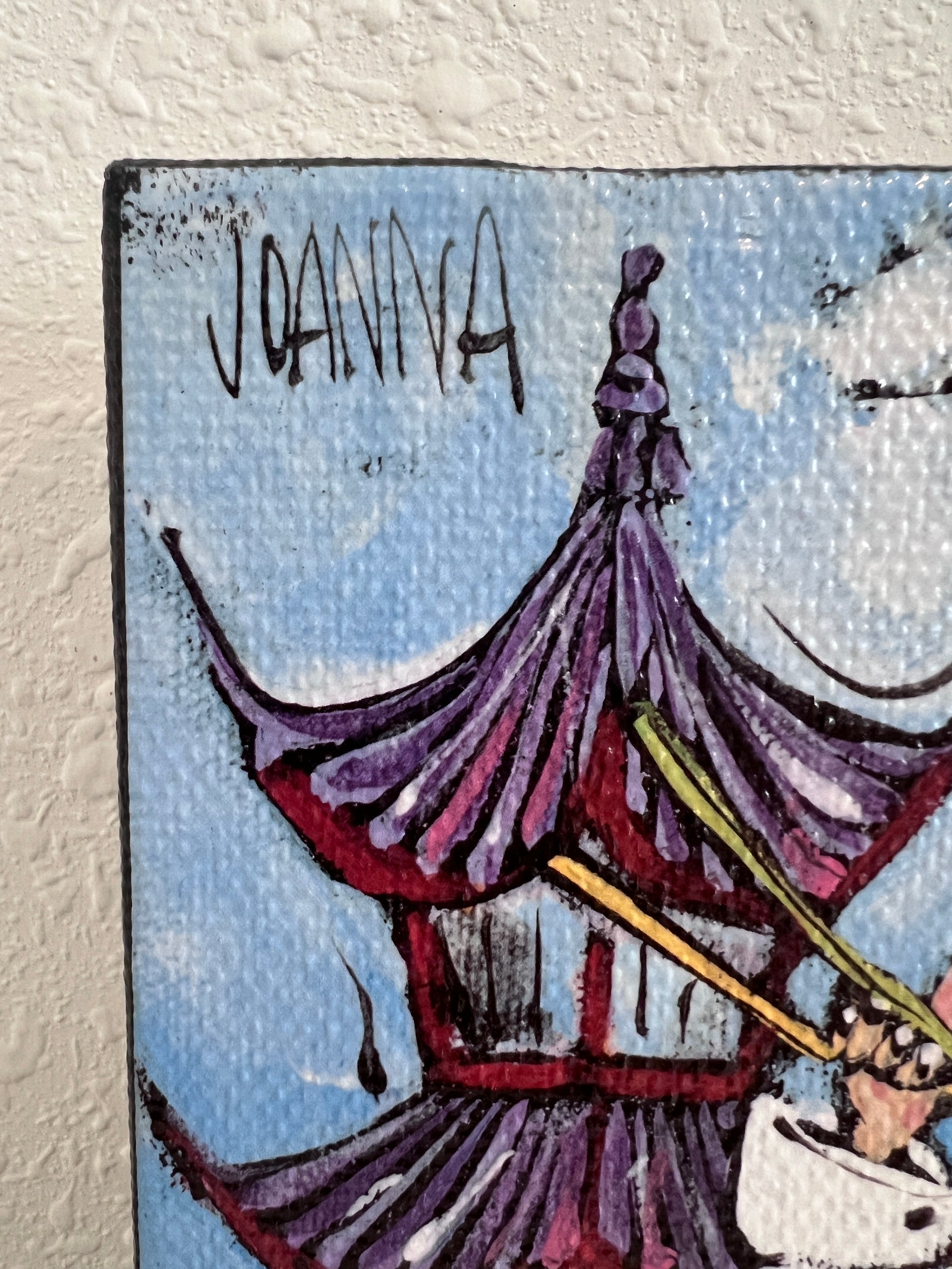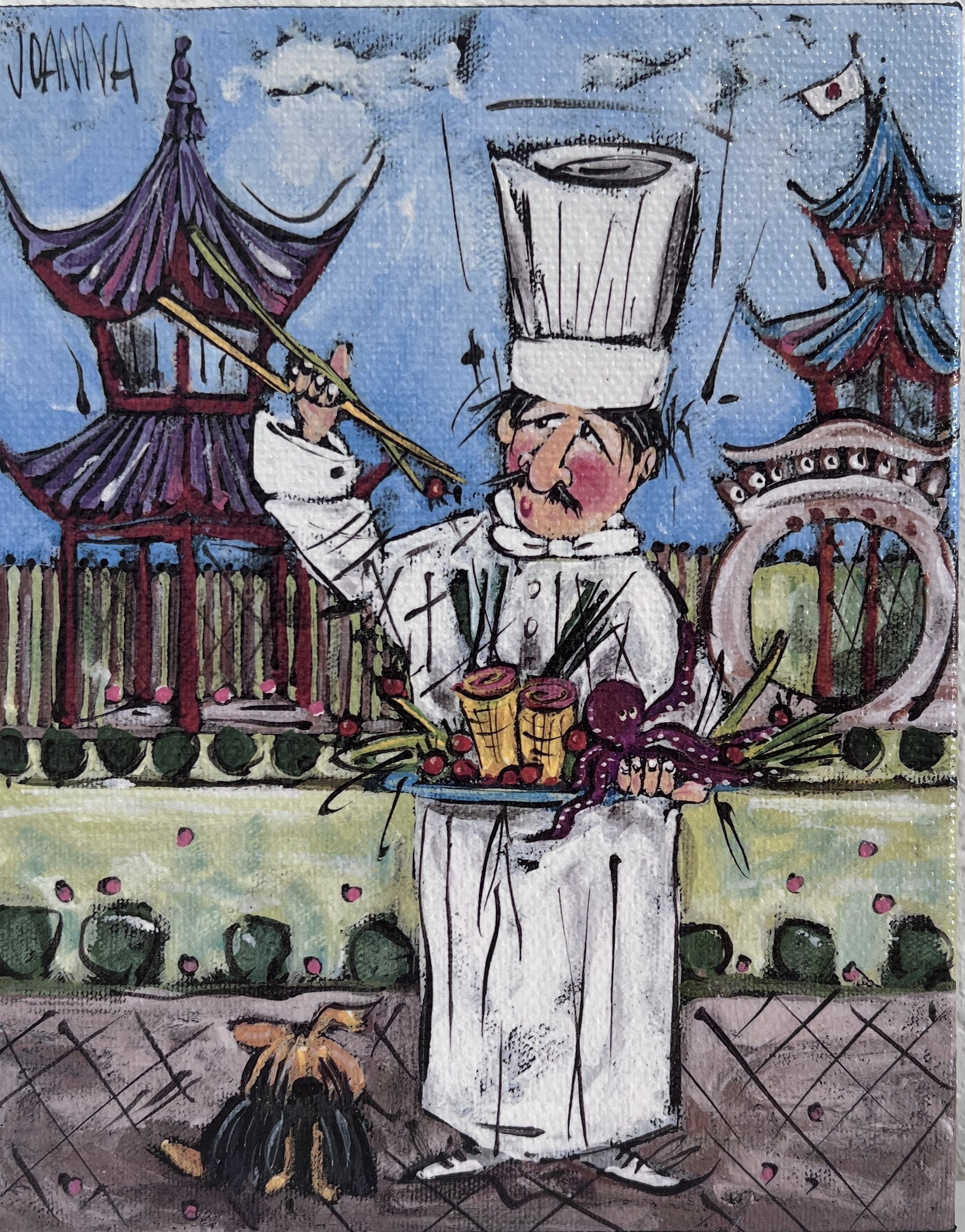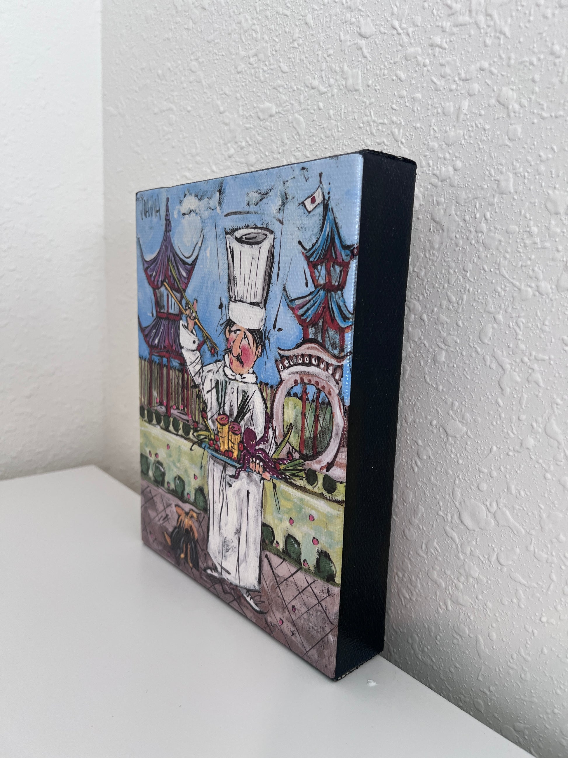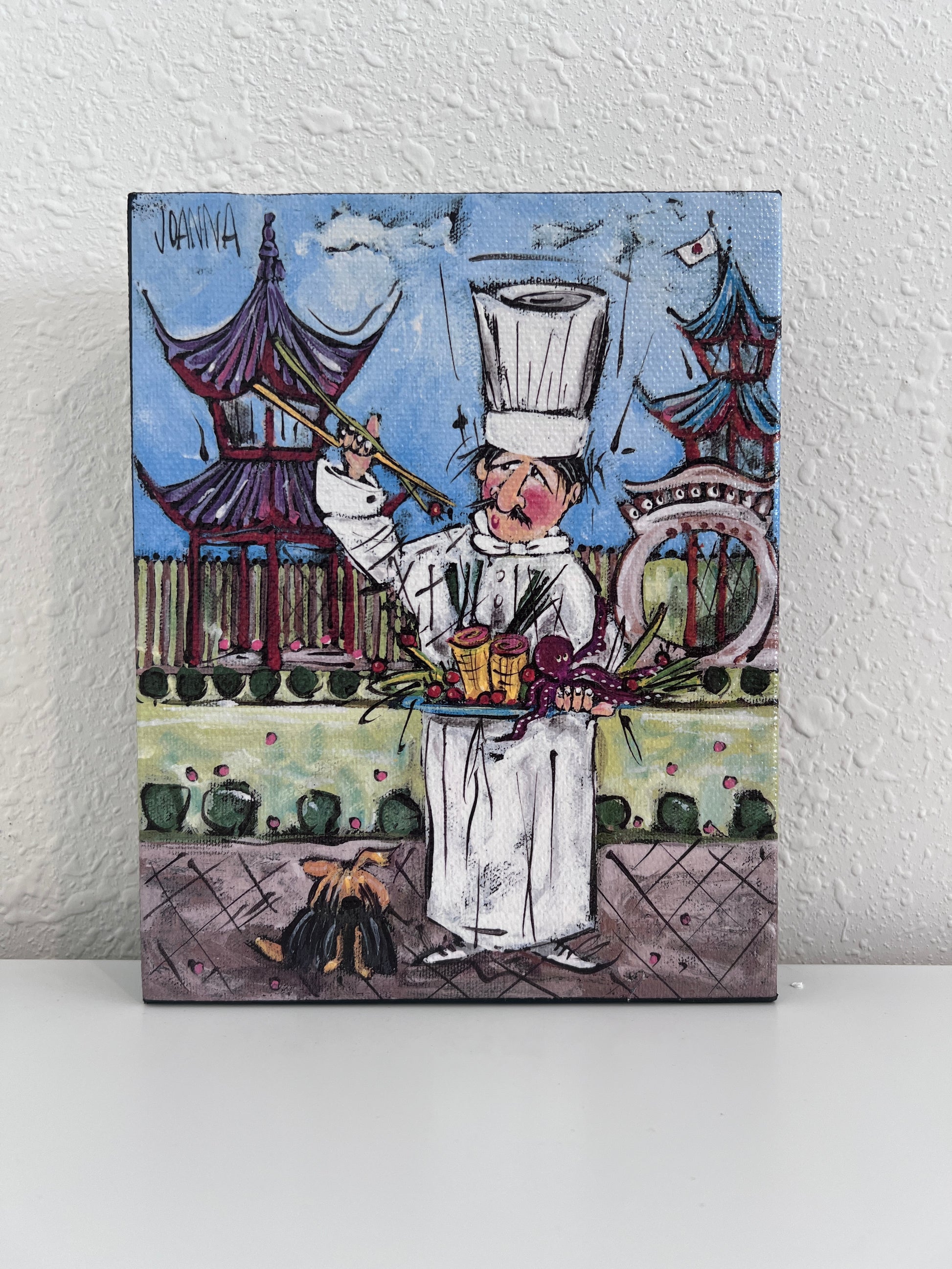 Add a touch of charm and humor to your kitchen or dining area with this delightful 8"x10" print on canvas featuring a whimsical chef scene by artist Joanna. The chef, decked in a tall hat and holding chopsticks, stands in front of stylized Asian architecture with bright colors and playful detail.