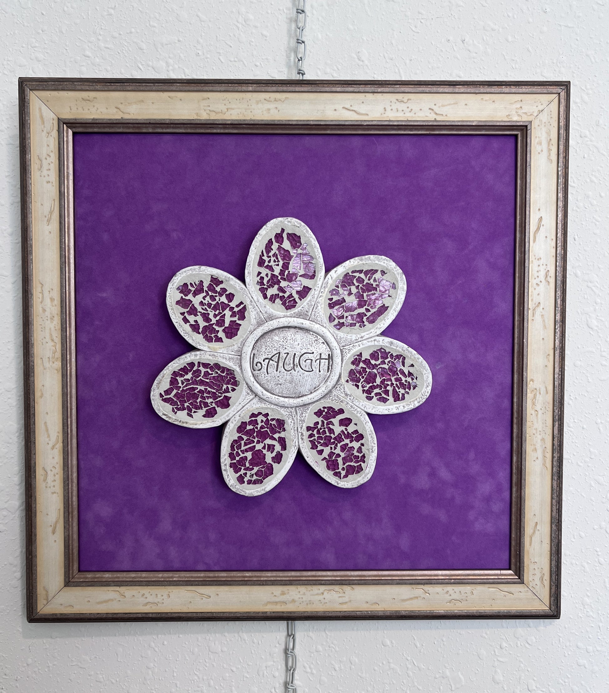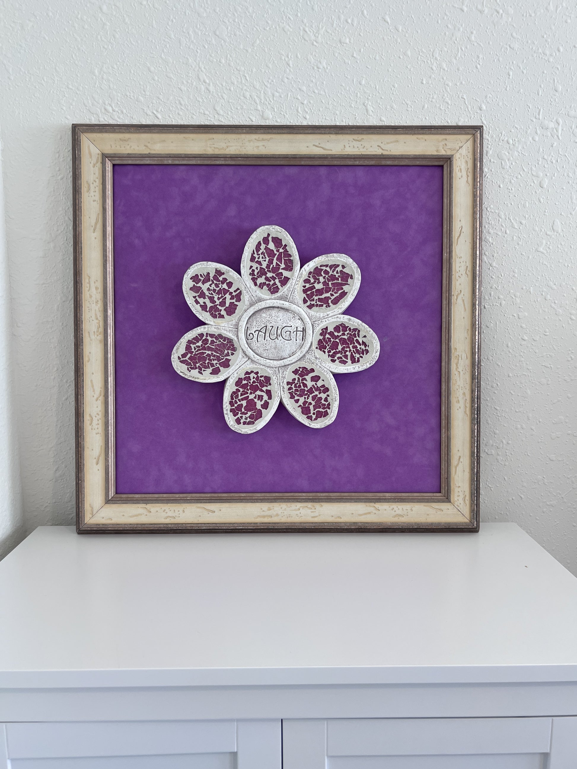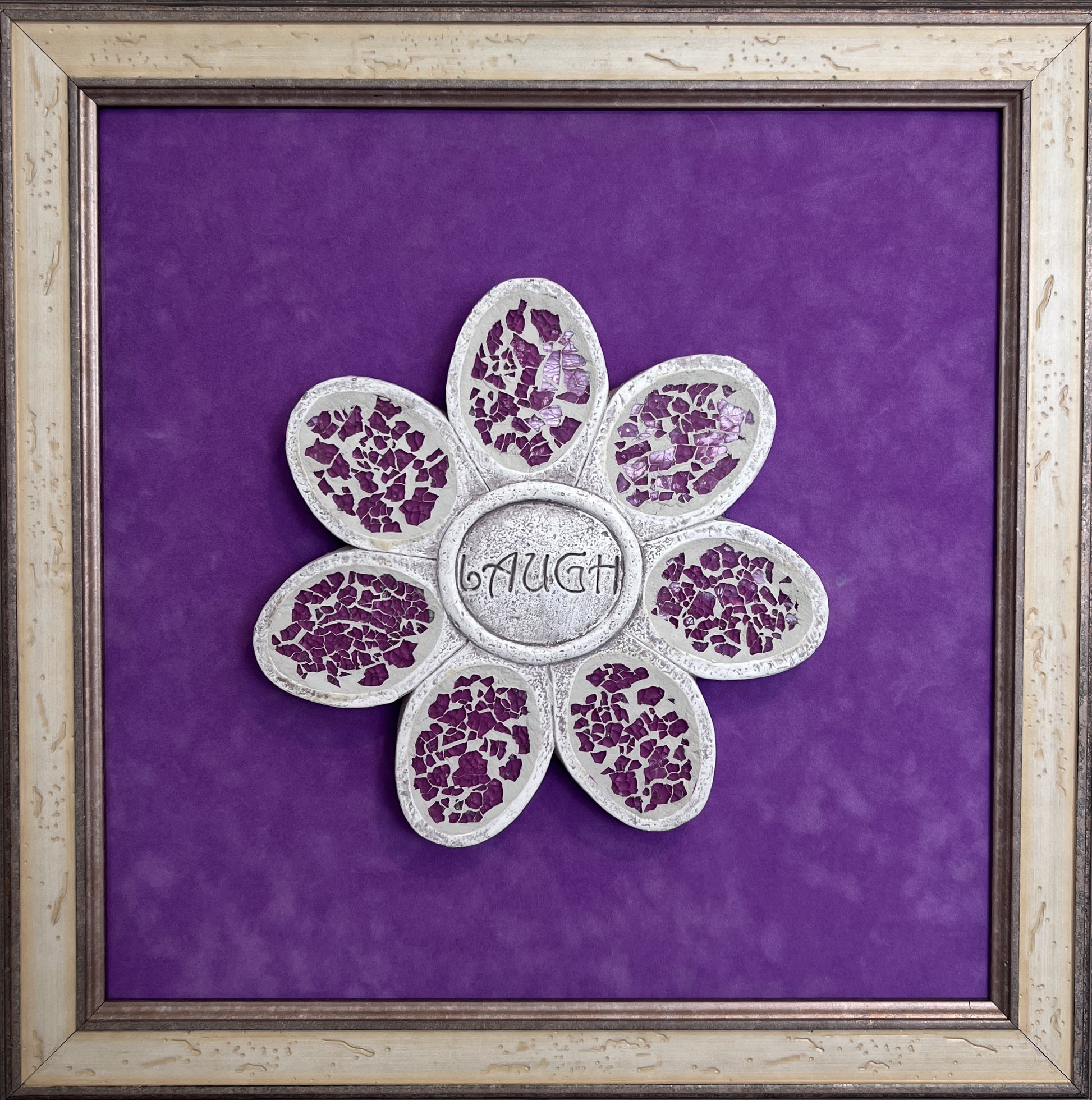 Add joy and character to your space with this one-of-a-kind three-dimensional mixed media artwork featuring a mosaic flower and the word “LAUGH” at its center. Crafted with textured materials, the flower’s ivory and violet petals are inlaid with crushed purple mosaic glass that shimmers beautifully in the light. A vibrant purple background and distressed vintage-style wooden frame complete the piece, making it a cheerful focal point for any room.