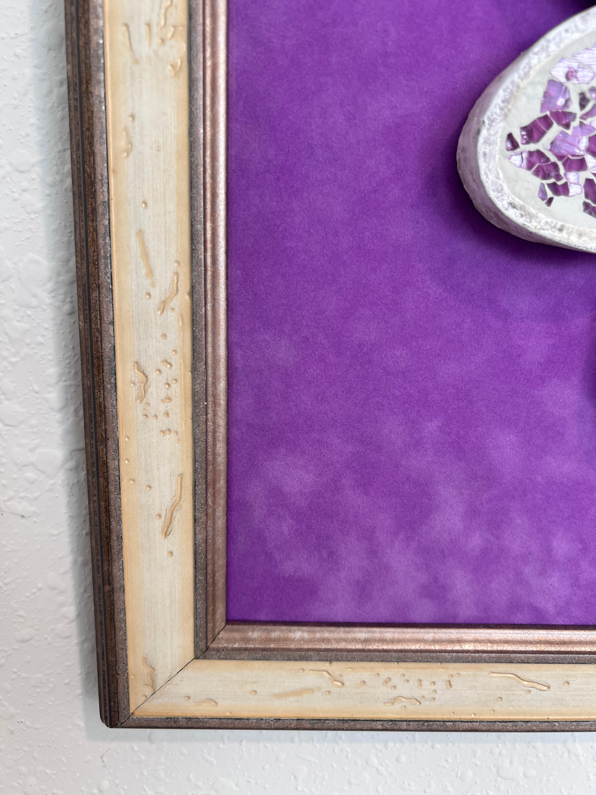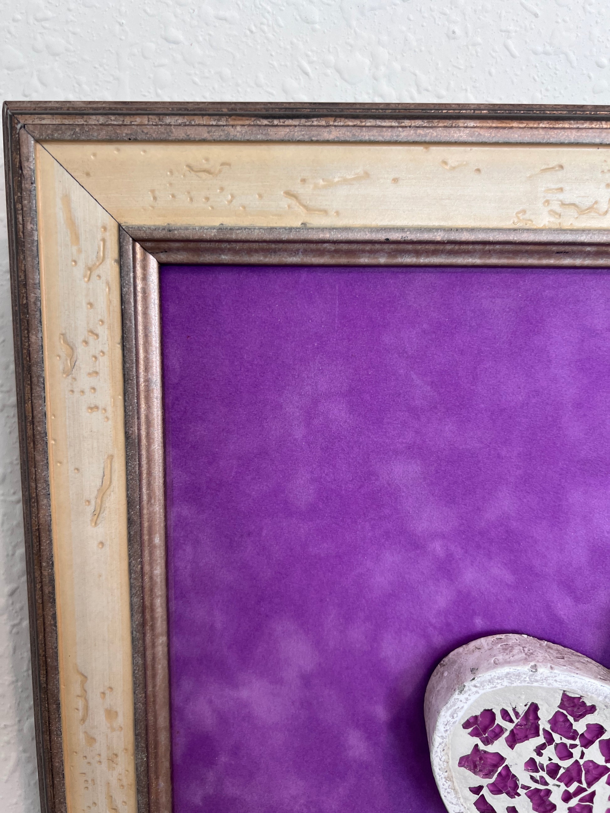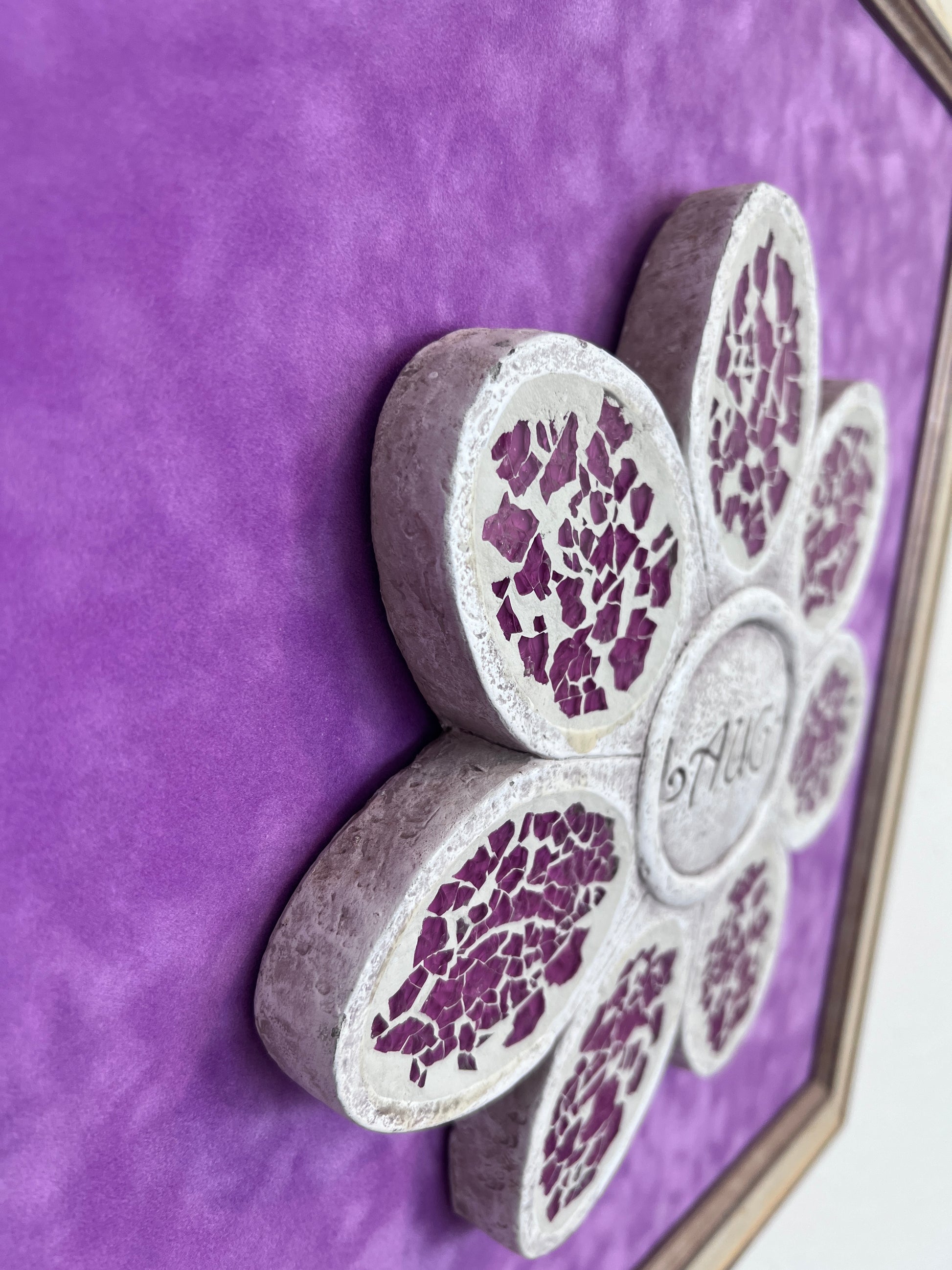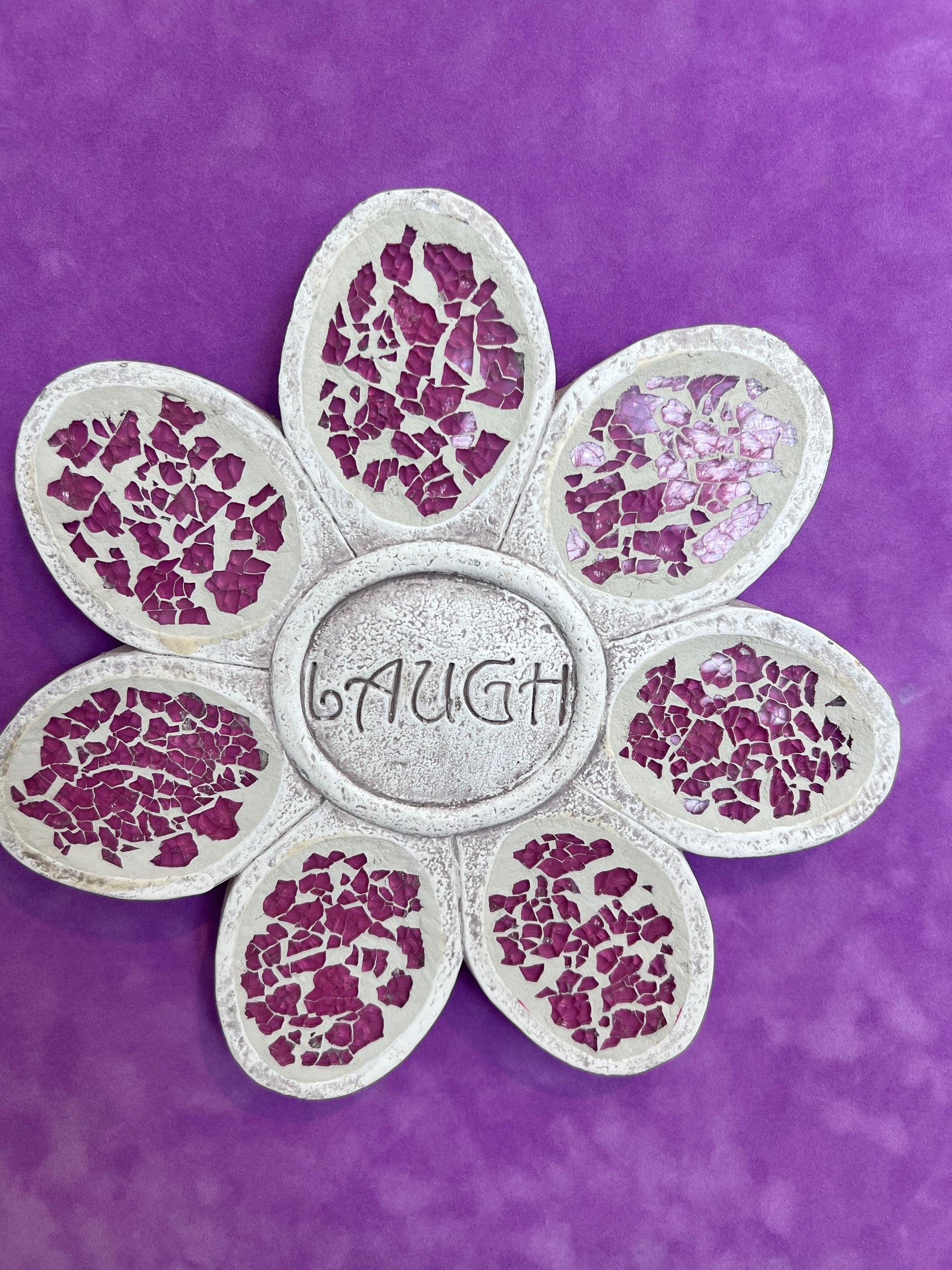 Add joy and character to your space with this one-of-a-kind three-dimensional mixed media artwork featuring a mosaic flower and the word “LAUGH” at its center. Crafted with textured materials, the flower’s ivory and violet petals are inlaid with crushed purple mosaic glass that shimmers beautifully in the light. A vibrant purple background and distressed vintage-style wooden frame complete the piece, making it a cheerful focal point for any room.